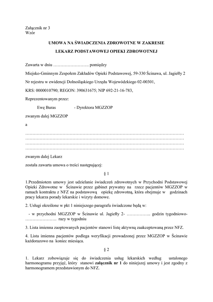 Załącznik nr 3 Wzór UMOWA NA ŚWIADCZENIA ZDROWOTNE W ZAKRESIE LEKARZ PODSTAWOWEJ OPIEKI ZDROWOTNEJ Zawarta w dniu ……………………. pomiędzy Miejsko-Gminnym Zespołem Zakładów Opieki Podstawowej, 59-330 Ścinawa, ul. Jagiełły 2 Nr rejestru w ewidencji Dolnośląskiego Urzędu Wojewódzkiego 02-00301, KRS: 0000010790; REGON: 390631675; NIP 692-21-16-783, Reprezentowanym przez: Ewę Buras - Dyrektora MGZZOP zwanym dalej MGZZOP a ………………………………………………………………………………………………… ………………………………………………………………………………………………… ………………………………………………………………………………………………… ………………………………………………………………………………………………… zwanym dalej Lekarz została zawarta umowa o treści następującej: §1 1.Przedmiotem umowy jest udzielanie świadczeń zdrowotnych w Przychodni Podstawowej Opieki Zdrowotne w Ścinawie przez gabinet prywatny na rzecz pacjentów MGZZOP w ramach kontraktu z NFZ na podstawową opiekę zdrowotną, która obejmuje w godzinach pracy lekarza porady lekarskie i wizyty domowe. 2. Usługi określone w pkt 1 niniejszego paragrafu świadczone będą w: - w przychodni MGZZOP w Ścinawie ul. Jagiełły 2- …………….. godzin tygodniowo…………………. razy w tygodniu 3. Lista imienna zaoptowanych pacjentów stanowi listę aktywną zaakceptowaną przez NFZ. 4. Lista imienna pacjentów podlega weryfikacji prowadzonej przez MGZZOP w Ścinawie każdorazowo na koniec miesiąca. §2 1. Lekarz zobowiązuje się do świadczenia usług lekarskich według ustalonego harmonogramu przyjęć, który stanowi załącznik nr 1 do niniejszej umowy i jest zgodny z harmonogramem przedstawionym do NFZ. §3 1. MGZZOP zapewnia: - rejestrację pacjentów, - przechowywanie dokumentacji ( historii chorych), - przygotowanie i udostępnienie gabinetu lekarskiego z wyposażeniem, - zaopatrzenie w druki recept i inne druki urzędowe. §4 1.Lekarz zobowiązany jest przestrzegać regulaminu udzielania świadczeń lekarskich, przepisów BHP oraz obowiązany jest do utrzymania porządku i czystości. 2. Nieprzestrzeganie regulaminu może spowodować natychmiastowe zerwanie umowy z winy Lekarza. §5 1. Lekarz ponosi odpowiedzialność materialną i dyscyplinarną za popełnienie błędu w diagnozie, zabiegu, terapii itp. w przypadku wystąpienia z roszczeniem pacjenta leczonego w ramach niniejszego kontaktu. 2. Lekarz ponosi pełną odpowiedzialność za prawidłowo prowadzoną dokumentację chorego zgodnie z wymogami organów kontrolujących. 3. Lekarz musi dokonać indywidualnego ubezpieczenia O.C. 4. Lekarz ceduje na rzecz MGZZOP w Ścinawie należności wynikające z ubezpieczenia. §6 1. W przypadku nieobecności, Lekarz zobowiązany jest powiadomić pisemnie niezwłocznie Kierownika przychodni MGZZOP. 2. W przypadku nieobecności i przerwie w udzielaniu świadczeń trwających dłużej niż 3 dni, Lekarz zobowiązuje się poinformować Kierownika Przychodni na 7dni dni przed tą przerwą. 3. Lekarz zobowiązuje się pisemnie poinformować Kierownika Przychodni o planowanej przerwie trwającej powyżej 14 dni na 14 dni przed przystąpieniem do planowanej przerwy. 4. Lekarz ma prawo do 4 tygodniowej nieobecności w ciągu roku i o jej wykorzystaniu decyduje lekarz. W przypadku nie wykorzystania, limit ten nie przechodzi na następny rok. 5. Lekarz ma obowiązek zapewnić zastępstwo w POZ w przypadku jego nieobecności z przyczyny wskazanej w pkt. 4. §7 MGZZOP zastrzega sobie prawo wskazania innego lekarza do wykonania usługi objętej umową w przypadku niemożności wykonania jej przez przyjmującego to zlecenie. §8 1. Lekarz zobowiązuje się do czynnego brania udziału w wewnętrznych szkoleniach i zebraniach informacyjnych organizowanych przez kierownika jednostki. 2. W przypadku nieobecności, Lekarz zobowiązuje się we własnym zakresie uzupełnić wiedzę dotyczącą przedmiotu ww. spotkań. §9 1.Lekarz współpracuje z lekarzami specjalistami w MGZZOP Ścinawa 2. Lekarz zobowiązany jest stosować w zakresie wydawania orzeczeń lekarskich, opinii i zaświadczeń przepisy obowiązujące w zakładzie opieki zdrowotnej. 3. Lekarz zobowiązuje się poddać kontroli prowadzonej przez NFZ na zasadach określonych w ustawie, w zakresie wynikającym z umowy zawartej z NFZ oraz przez inne uprawnione do tego organy. § 10 1. Pacjenci nieuprawnieni do bezpłatnych świadczeń lekarskich wynikających z kontaktu zawartego z NFZ mają prawo do korzystania z usług po uprzednim uiszczeniu opłaty wg aktualnego cennika MGZZOP. 2. Opłaty, o których mowa z ust.1 winny być uiszczane poprzez kasę fiskalną w kancelarii przychodni. § 11 1. W przypadku nieprzestrzegania godzin przyjęć, o których mowa w § 2 niniejszej umowy, odwoływania przyjścia do pracy w czasie krótszym niż 24 godziny od pory rozpoczęcia pracy wprowadza się umowne kary pieniężne w wysokości 100,00 zł ( słownie: sto złotych 00/100) za każde zdarzenie. 2. Nieprzestrzeganie godzin przyjęć, nieusprawiedliwiona absencja może spowodować natychmiastowe zerwanie umowy z winy Lekarza.. § 12 MGZZOP Ścinawa może naliczyć Lekarzowi karę umowną w wysokości poniesionej szkody z tytułu błędnego prowadzenia obowiązującej dokumentacji i potrącić z wynagrodzenia. § 13 Ustala się następujące wynagrodzenie: 1. Za pracę określoną w § 1 pkt. 1 i 2 strony ustalają wynagrodzenie w wysokości ………….zł brutto za jedną godzinę pracy / za 1 zadeklarowanego pacjenta……………….. 2. Zasady rozliczenia środków pieniężnych z NFZ przypadających na zdeklarowanego pacjenta: a) MGZZOP zobowiązany jest diagnostycznych: do wykonywania we własnym zakresie badań mikrobiologii i laboratoryjnych w ramach kompetencji lekarza podstawowej opieki zdro