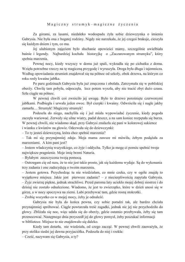 Magiczny strumyk–magiczne życzenia Za górami, za lasami, niedaleko wodospadu żyła sobie dziewczynka o imieniu Gabrysia. Nie była ona z bogatej rodziny. Nigdy nie narzekała, że jej czegoś brakuje, cieszyła się każdym dniem i tym, co ma. Jej ulubionym zajęciem było słuchanie opowieści mamy, szczególnie uwielbiała baśnie i legendy. Najbardziej kochała historyjkę o ,,Zaczarowanym strumyku”, który spełnia marzenia. Pewnej nocy, kiedy wszyscy w domu już spali, wykradła się po cichutku z domu. Wzięła potrzebne rzeczy na tę magiczną przygodę i wyruszyła. Droga była długa i tajemnicza. Według opowiadania strumień znajdował się na północ od szkoły, obok drzewa, na którym co roku rosły kwaśne jabłka. Po paru godzinach Gabrysia była już zmęczona i obolała. Zatrzymała się w pobliskiej oberży. Chwilę tam pobyła, odpoczęła, lecz potem wyszła, aby nie tracić zbyt dużo czasu. Szła ciągle na północ. W pewnej chwili coś zwróciło jej uwagę. Było to drzewo porośnięte czerwonymi jabłkami. Podbiegła i urwała jeden owoc. Był cierpki i kwaśny. Odwróciła się i nagle jakby zamarła… Strumyk! Magiczny strumyk! Podeszła do niego, nachyliła się i już miała wypowiadać życzenie, kiedy pogoda zaczęła wariować. Zerwały się silne wiatry, padał deszcz, a na sam koniec rozpętała się burza. W pewnej chwili, nie wiadomo skąd, przy Gabrysi znalazła się pani w kolorowej sukience i wianku z kwiatów na głowie. Odezwała się do dziewczynki: – To ty jesteś dziewczyną, która chce spełnić marzenia? – Tak mi się przynajmniej zdaje. Moja mama zawsze mi mówiła, żebym podążała za marzeniami. A kim pani jest? – Jestem władczynią wszystkiego, co żyje i oddycha. Tylko ja mogę ci pomóc spełnić twoje największe pragnienie. Moje imię brzmi Naturia. – Byłabym zaszczycona twoją pomocą. – Ostrzegam cię od razu, że to nie jest takie proste, jak się każdemu wydaje. Są do wykonania trzy zadania i one zadecydują o twoim marzeniu. – Jestem gotowa. Przychodząc tu nie wiedziałam, co mnie czeka, czy w ogóle znajdę to wyjątkowe miejsce. Jakie jest pierwsze zadanie? – z niecierpliwością zapytała Gabrysia. – Żyje zwierzę piękne, jednak strachliwe. Przed paroma laty uciekło mojej dobrej siostrze i do dzisiaj nie zostało odnalezione. Wiadomo, że jest to zwierzątko, które w dzień unosi się w górze, a w nocy spoczywa na ziemi. Lubi przebywać tam, gdzie rosną stokrotki. – Zrobię wszystko co w mojej mocy, żeby je odnaleźć. Gabrysia nie była do końca pewna, czy sobie poradzi tak, ale bardzo chciała przynajmniej spróbować. Ciągle powtarzała treść zagadki, jednak nic jej nie przychodziło do głowy. Zbliżała się noc, więc udała się do oberży, gdzie ostatnio przebywała, żeby się tam przenocować. Następnego dnia przyszedł jej do głowy pomysł, żeby poszukać informacji w bibliotece. Miejsce to nie znajdowało się daleko. Kiedy tam dotarła, nie wiedziała, od czego zacząć. W pewnej chwili zauważyła, że przy stoliku siedzi jej dawna przyjaciółka. Podeszła do niej i rzekła: – Cześć, nazywam się Gabrysia, a ty? – Gabi? To ty? Nigdy bym się ciebie tu nie spodziewała. Dlaczego jesteś tak daleko od domu? – Wiedziałam, że to ty, ale wolałam się upewnić, czy to ta sama Iza, którą znałam przed laty. Jeśli chodzi o mój pobyt tu, to przebywam w tej okolicy po to, aby spełniać moje marzenia. – Jak można tutaj spełniać marzenia? Nic się przecież tu ciekawego nie dzieje. – Pamiętasz tę historyjkę o strumyku? –Tak, a co ma niby to opowiadanie z twoją wizytą wspólnego? – Bardzo dużo. Wybrałam się w podróż, aby odnaleźć to miejsce. Nie uwierzysz, ale znalazłam je. Jednak, żeby prosić o cokolwiek muszę wypełnić trzy zadania. – Co ty opowiadasz?! – Mówię prawdę. – Jeśli jest tak, jak mówisz, to nie mam innego wyboru, jak pomóż ci. Jak brzmi pierwsze polecenie? – Treść jest następująca: ,,Jest to zwierzę piękne, jednak strachliwe. Przed paroma laty uciekło mojej dobrej siostrze i do dzisiaj nie zostało odnalezione. Wiadomo, że jest to zwierzątko, które w dzień unosi się w górze, a w nocy spoczywa na ziemi. Lubi przebywać tam, gdzie porastają stokrotki" – Jest książka o magicznych zwierzętach, do których są właśnie podobne opisy. – Jaki jest tytuł tej księgi? – ,,Magiczne zwierzęta starożytności", przed chwilą ją oglądałam. Zaraz ci ją znajdę. Iza przyniosła czerwoną książkę. Dziewczęta zaczęły szukać właśnie tego opisu i zwierzaka. Po chwili je odnalazły. Tajemnicze zwierzę to pegaz. Gabrysia dowiedziała się, że niedaleko wodospadu znajduje się łąka ze stokrotkami i tam się udały. Wypatrywały w powietrzu pegaza. Nagle latający koń pokazał się w górze. Dziewczęta zerwały kwiaty i zaczęły machać przed zwierzakiem. Pegaz zbliżał się do Izy i Gabrysi, aż w końcu dotknął końców palców dziewcząt. Nastolatki delikatnie głaskały magicznego konia. Zjawiła się Naturia. Przemówiła stanowczym głosem: – Widzę Gabrysiu, że ufają ci zwierzęta. Bardzo dobrze, oby tak dalej. Drugie zadanie polega na tym, żebyś wraz z koleżanką zaprowadziła pegaza do mojej siostry. Musisz się domyślić, gdzie może przebywać. Jeśli chcesz mieć jakąś podpowiedź to mogę ci zdradzić, że uwielbia ona zwierzęta. Do pomocy daję wam drugiego pegaza, który należy do mnie. Zostawcie u niej jego oraz dwie latające wróżki. Naturia jak szybko i tajemniczo przybyła, tak i odeszła. Dziewczęta zaczęły głęboko się zastanawiać. Po pewnym czasie miały plan następujący: – Skoro siostra Naturii lubi zwierzęta, to na pewno pomogłaby im w potrzebie – stwierdziła Gabrysia. – Jeśli cię rozumiem, to mamy poprosić stworzenia, aby ją zawołały o pomoc – rozumowała Iza. – Właśnie tak. Drogie wróżki, mogłybyście znaleź