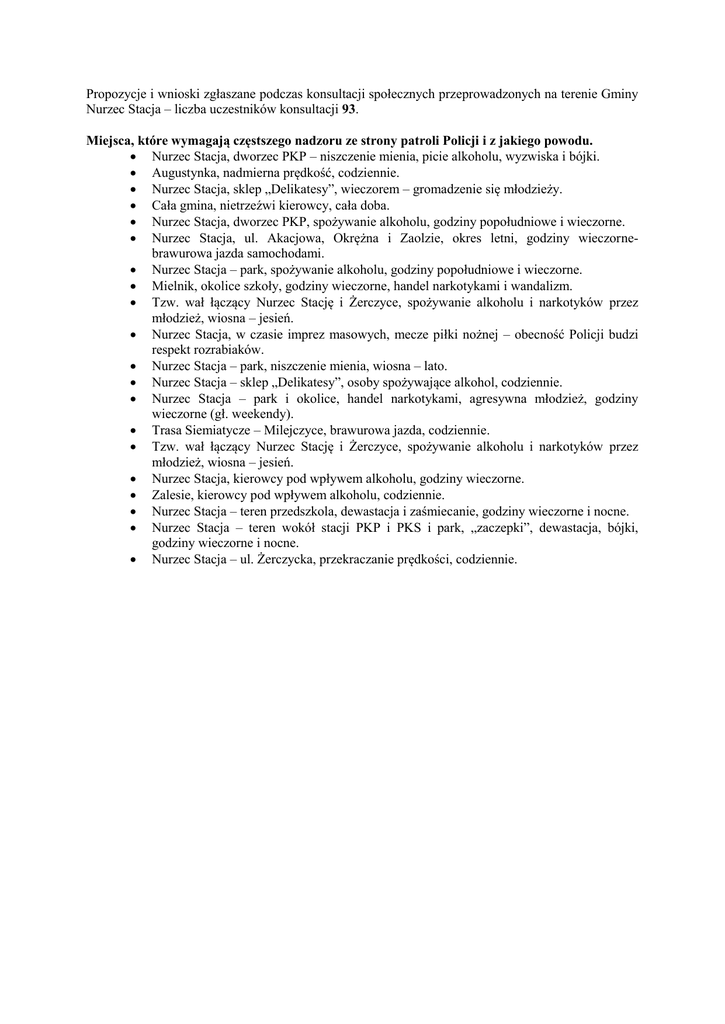 Propozycje i wnioski zgłaszane podczas konsultacji społecznych przeprowadzonych na terenie Gminy Nurzec Stacja – liczba uczestników konsultacji 93. Miejsca, które wymagają częstszego nadzoru ze strony patroli Policji i z jakiego powodu. Nurzec Stacja, dworzec PKP – niszczenie mienia, picie alkoholu, wyzwiska i bójki. Augustynka, nadmierna prędkość, codziennie. Nurzec Stacja, sklep „Delikatesy”, wieczorem – gromadzenie się młodzieży. Cała gmina, nietrzeźwi kierowcy, cała doba. Nurzec Stacja, dworzec PKP, spożywanie alkoholu, godziny popołudniowe i wieczorne. Nurzec Stacja, ul. Akacjowa, Okrężna i Zaolzie, okres letni, godziny wieczornebrawurowa jazda samochodami. Nurzec Stacja – park, spożywanie alkoholu, godziny popołudniowe i wieczorne. Mielnik, okolice szkoły, godziny wieczorne, handel narkotykami i wandalizm. Tzw. wał łączący Nurzec Stację i Żerczyce, spożywanie alkoholu i narkotyków przez młodzież, wiosna – jesień. Nurzec Stacja, w czasie imprez masowych, mecze piłki nożnej – obecność Policji budzi respekt rozrabiaków. Nurzec Stacja – park, niszczenie mienia, wiosna – lato. Nurzec Stacja – sklep „Delikatesy”, osoby spożywające alkohol, codziennie. Nurzec Stacja – park i okolice, handel narkotykami, agresywna młodzież, godziny wieczorne (gł. weekendy). Trasa Siemiatycze – Milejczyce, brawurowa jazda, codziennie. Tzw. wał łączący Nurzec Stację i Żerczyce, spożywanie alkoholu i narkotyków przez młodzież, wiosna – jesień. Nurzec Stacja, kierowcy pod wpływem alkoholu, godziny wieczorne. Zalesie, kierowcy pod wpływem alkoholu, codziennie. Nurzec Stacja – teren przedszkola, dewastacja i zaśmiecanie, godziny wieczorne i nocne. Nurzec Stacja – teren wokół stacji PKP i PKS i park, „zaczepki”, dewastacja, bójki, godziny wieczorne i nocne. Nurzec Stacja – ul. Żerczycka, przekraczanie prędkości, codziennie.