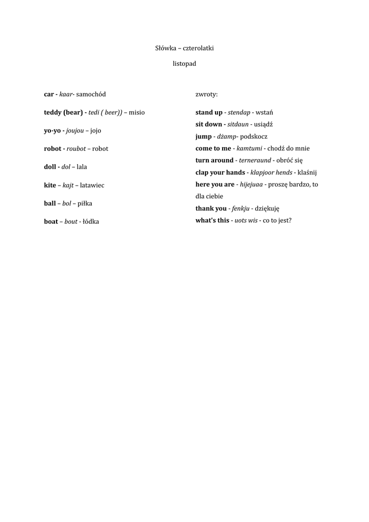 Słówka – czterolatki listopad car - kaar- samochód zwroty: teddy (bear) - tedi ( beer)) – misio stand up - stendap - wstań yo-yo - joujou – jojo robot - roubot – robot doll - dol – lala kite – kajt – latawiec ball – bol – piłka boat – bout - łódka sit down - sitdaun - usiądź jump - dżamp- podskocz come to me - kamtumi - chodź do mnie turn around - terneraund - obróć się clap your hands - klapjoor hends - klaśnij here you are - hijejuaa - proszę bardzo, to dla ciebie thank you - fenkju - dziękuję what's this - uots wis - co to jest?