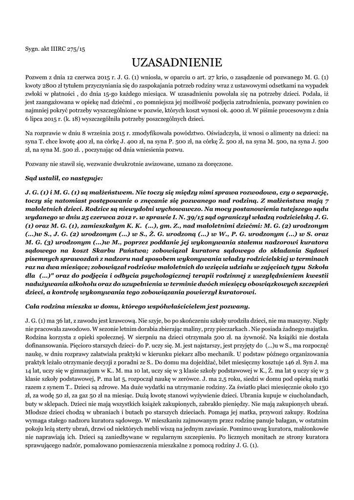 Sygn. akt IIIRC 275/15 UZASADNIENIE Pozwem z dnia 12 czerwca 2015 r. J. G. (1) wniosła, w oparciu o art. 27 krio, o zasądzenie od pozwanego M. G. (1) kwoty 2800 zł tytułem przyczyniania się do zaspokajania potrzeb rodziny wraz z ustawowymi odsetkami na wypadek zwłoki w płatności , do dnia 15-go każdego miesiąca. W uzasadnieniu powołała się na potrzeby dzieci. Podała, iż jest zaangażowana w opiekę nad dziećmi , co pomniejsza jej możliwość podjęcia zatrudnienia, pozwany powinien co najmniej pokryć potrzeby wyszczególnione w pozwie, których koszt wynosi ok. 4000 zł. W piśmie procesowym z dnia 6 lipca 2015 r. (k. 18) wyszczególniła potrzeby poszczególnych dzieci. Na rozprawie w dniu 8 września 2015 r. zmodyfikowała powództwo. Oświadczyła, iż wnosi o alimenty na dzieci: na syna T. chce kwotę 400 zł, na córkę J. 400 zł, na syna P. 500 zł, na córkę Ż. 500 zł, na syna M. 500, na syna J. 500 zł, na syna M. 500 zł. , poczynając od dnia wniesienia pozwu. Pozwany nie stawił się, wezwanie dwukrotnie awizowane, uznano za doręczone. Sąd ustalił, co następuje: J. G. (1) i M. G. (1) są małżeństwem. Nie toczy się między nimi sprawa rozwodowa, czy o separację, toczy się natomiast postępowanie o znęcanie się pozwanego nad rodziną. Z małżeństwa mają 7 małoletnich dzieci. Rodzice są niewydolni wychowawczo. Na mocy postanowienia tutejszego sądu wydanego w dniu 25 czerwca 2012 r. w sprawie I. N. 39/15 sąd ograniczył władzą rodzicielską J. G. (1) oraz M. G. (1), zamieszkałym K. K. (...), gm. Z., nad małoletnimi dziećmi: M. G. (2) urodzonym (...)w S., J. G. (2) urodzonym (...) w S., Ż. G. urodzoną (...) w W., P. G. urodzonym (...) w S. oraz M. G. (3) urodzonym (...)w M., poprzez poddanie jej wykonywania stałemu nadzorowi kuratora sądowego na koszt Skarbu Państwa; zobowiązał kuratora sądowego do składania Sądowi pisemnych sprawozdań z nadzoru nad sposobem wykonywania władzy rodzicielskiej w terminach raz na dwa miesiące; zobowiązał rodziców małoletnich do wzięcia udziału w zajęciach typu Szkoła dla (...)" oraz do podjęcia i odbycia psychologicznej terapii rodzinnej z uwzględnieniem kwestii nadużywania alkoholu oraz do uzupełnienia w terminie dwóch miesięcy obowiązkowych szczepień dzieci, a kontrolę wykonywania tego zobowiązania powierzył kuratorowi. Cała rodzina mieszka w domu, którego współwłaścicielem jest pozwany. J. G. (1) ma 36 lat, z zawodu jest krawcową. Nie szyje, bo po skończeniu szkoły urodziła dzieci, nie ma maszyny. Nigdy nie pracowała zawodowo. W sezonie letnim dorabia zbierając maliny, przy pieczarkach . Nie posiada żadnego majątku. Rodzina korzysta z opieki społecznej. W sierpniu na dzieci otrzymała 500 zł. na żywność. Na książki nie dostała dofinansowania. Pięcioro starszych dzieci- do P. uczy się. M. jest najstarszy, jest przyjęty do (...)u w S., ma rozpocząć naukę, w dniu rozprawy załatwiała praktyki w kierunku piekarz albo mechanik. U podstaw późnego organizowania praktyk leżało otrzymanie decyzji z poradni ze S.. Do domu ma dojeżdżać, bilet miesięczny kosztuje 146 zł. Syn J. ma 14 lat, uczy się w gimnazjum w K.. M. ma 10 lat, uczy się w 3 klasie szkoły podstawowej w K., Ż. ma lat 9 uczy się w 3 klasie szkoły podstawowej, P. ma lat 5, rozpoczął naukę w zerówce. J. ma 2,5 roku, siedzi w domu pod opieką matki razem z synem T.. Dzieci są zdrowe. Ma duże wydatki na utrzymanie rodziny. Za światło płaci miesięcznie około 130 zł, za wodę 50 zł, za gaz 50 zł na miesiąc. Dużą kwotę stanowi wyżywienie dzieci. Ubrania kupuje w ciucholandach, buty w sklepach. Dzieci nie mają wszystkich książek zakupionych, zabrakło pieniędzy. Nie mają zakupionych ubrań. Młodsze dzieci chodzą w ubraniach i butach po starszych dzieciach. Pomaga jej matka, przywozi zakupy. Rodzina wymaga stałego nadzoru kuratora sądowego. W mieszkaniu zajmowanym przez rodzinę panuje bałagan, w ostatnim pokoju leżą sterty ubrań, drzwi od niektórych mebli wiszą na jednym zawiasie. Pomimo uwag kuratora, małżonkowie nie naprawiają ich. Dzieci są zaniedbywane w regularnym szczepieniu. Po licznych monitach ze strony kuratora sprawującego nadzór, pomalowano pomieszczenia mieszkalne z pomocą rodziny J. G. (1). M. G. (1) ma 39 lat, z zawodu jest ogrodnikiem. Pracuje dorywczo u stolarza w K., wcześniej przez dwa tygodnie siedział w domu. Sporadycznie dokłada się do utrzymania rodziny. W ciągu ostatnich 2 tygodni dał żonie na utrzymanie rodziny 150 zł. Bije żonę. Najwyższą kwotę jaką dał żonie na utrzymanie rodziny to była kwota 500 zł. w ubiegłym roku na książki dla dzieci. Pozwany stracił prawo jazdy za jazdę pod wpływem alkoholu. Powyższy stan faktyczny sąd ustalił na podstawie zeznań J. G. (1), sprawozdań kuratorów składanych do sprawy O.. Sąd zważył, co następuje: Wobec kategorycznego stanowiska J. G. (1) przedstawionego na rozprawie w dniu 8 września 2015 r., iż domaga się zasądzenia alimentów na małoletnie dzieci, sąd orzekał biorąc pod uwagę art. 128 i nast. krio. Żądanie zmodyfikowane na rozprawie nie przekroczyło kwoty żądanej w pozwie i w złożonym w dniu 7 lipca 2015 r. piśmie procesowym. Powództwo co do zasady jest słuszne. W myśl art. 133 § 1 kr. i o. rodzice obowiązani są do świadczeń alimentacyjnych względem dziecka, które nie jest jeszcze w stanie utrzymać się samodzielnie, chyba że dochody z majątku dziecka wystarczają na pokrycie kosztów jego utrzymania i wychowania. Zgodnie z art. 135 § 1 kr. i o. zakres świadczeń alimentacyjnych zależy od usprawiedliwionych potrzeb uprawnionego oraz od zarobkowych i majątkowych możliwości zobowiązanego. Obowiązek alimentacyjny może mieć różną formę: dostarczania małoletnim środków finansowych na utrzymanie, pozyskiwania tych środków na ten cel stosowanie do wieku , stanu zdrowia , posiadanego wykształcenia. Mo