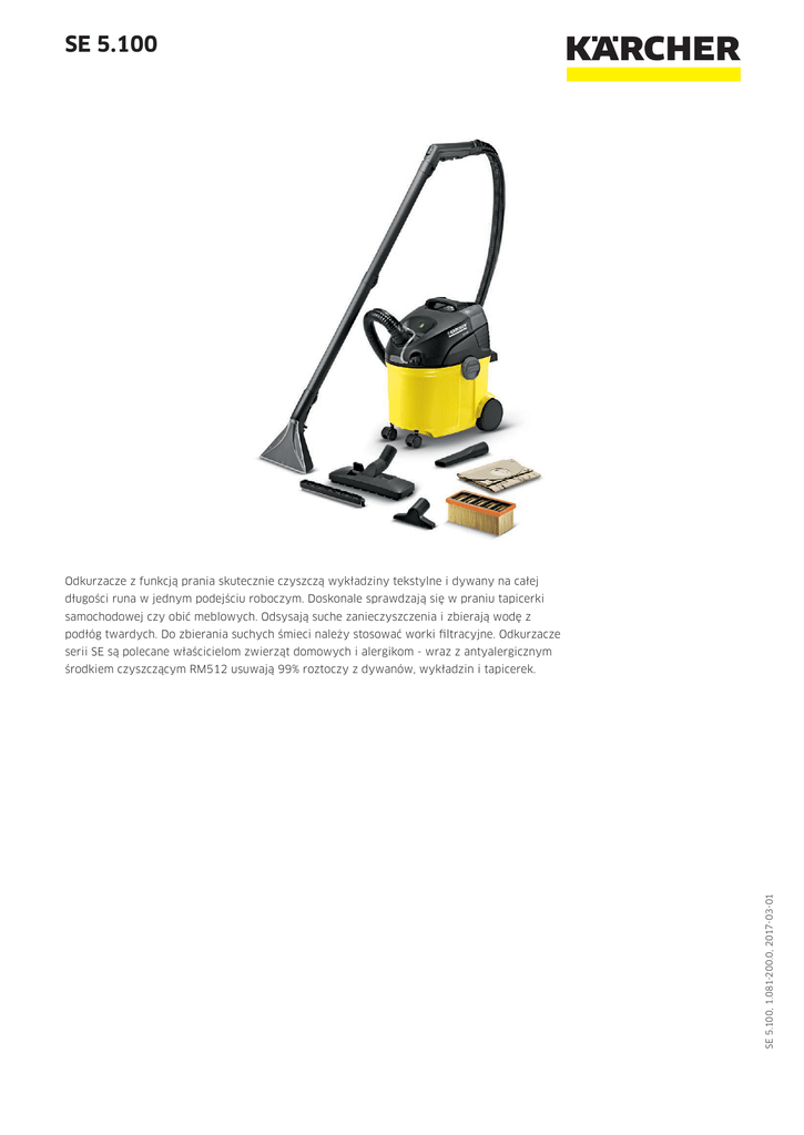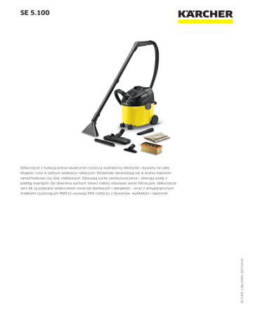 SE 5.100 Odkurzacze z funkcją prania skutecznie czyszczą wykładziny tekstylne i dywany na całej długości runa w jednym podejściu roboczym. Doskonale sprawdzają się w praniu tapicerki samochodowej czy obić meblowych. Odsysają suche zanieczyszczenia i zbierają wodę z podłóg twardych. Do zbierania suchych śmieci należy stosować worki filtracyjne. Odkurzacze serii SE są polecane właścicielom zwierząt domowych i alergikom - wraz z antyalergicznym SE 5.100, 1.081-200.0, 2017-03-01 środkiem czyszczącym RM512 usuwają 99% roztoczy z dywanów, wykładzin i tapicerek. SE 5.100 System do ekstrakcji zintegrowany z wężem ssącym Technologia dysz Kärcher: czas schnięcia zredukowany o 50% Płaski filtr falisty Dane techniczne 1.081-200.0 Numer katalogowy Podciśnienie mbar / kPa 210 / 21 Wydatek powietrza l/s 70 Zbiornik na wodę czystą / brudną l 4 Moc turbiny / pompy W 1400 / 40 Wydajność spryskiwania l/min 1 Ciśnienie spryskiwania bar 1 Kabel zasilający m 5 Ciężar bez wyposażenia kg 7,4 Wyposażenie standardowe Wąż spryskująco-odsysający z uchwy- m / mm tem Rury do ekstrakcji szt. / m / mm Dysza spryskująco-odsysająca z nasadką do podłóg twardych Wyposażenie do odkurzania na sucho 2 / 35 Ssawka szczelinowa /– Ssawka do tapicerki Papierowa torebka filtracyjna Płaski filtr falisty RM 519 Środek czyszczący do dywanów i wykładzin (100 ml) Ręczne oczyszczanie filtra Objęte dostawą. szt. 2 × 0,5 / 35 / Elementy z plastiku / – Przełączana ssawka podłogowa z 2 szczotkowymi listwami 1 SE 5.100, 1.081-200.0, 2017-03-01 4039784515086 Akcesoria dla SE 5.100 1.081-200.0 1 2 3 8 9 10 Numer katalogowy 4 5 6 Cena 7 Opis Filtr Płaski filtr falisty Eco Zestaw filtrów 1 6.414-498.0 2 6.904-143.0 Płaski filtr falisty do odkurzania na mokro i sucho bez potrzeby wymiany filtra. Mały filtr o dużej powierzchni filtracji, nie zajmuje powierzchni w zbiorniku. 5 wydajnych papierowych torebek filtracyjnych o dwóch warstwach. Wytrzymałe torebki doskonale zatrzymujące drobny pył. Zestaw zawiera 1 mikrofiltr. Dysze Uniwersalna przełączana ssawka podłogowa 3 2.863-000.0 Ssawka spryskująco-odsysająca do tapicerki 4 2.885-018.0 Długa ssawka szczelinowa 5 2.863-223.0 Ssawka samochodowa 6 2.863-145.0 Ssawka z twardą szczeciną 7 2.863-146.0 Ssawka szczotkowa z miękką szczeciną 8 2.863-147.0 Długa ssawka szczelinowa (350mm) 9 2.863-144.0 Ssawka uniwersalna przełączana przeznaczona zarówno do odkurzania podłóg twardych jak i wykładzin tekstylnych. Z zaczepem do "parkowania". Ssawka spryskująco-odsysająca ręczna do odkurzaczy piorących. Doskonała do dogłębnego czyszczenia tapicerki oraz foteli samochodowych. Nowa przeprojektowana, bardzo długa i wąska ssawka szczelinowa. Poręczna ssawka samochodowa do szybkiego i łatwego czyszczenia - od dywaników po bagażnik. Ssawka do dokładnego czyszczenia tapicerki i wykładziny dywanowej w samochodzie. Bez problemu usuwa zaschnięte zabrudzenia. Ssawka z dodatkową miękką szczeciną do delikatnego czyszczenia wrażliwych powierzchni w samochodzie, np. deska rozdzielcza lub konsola środkowa. Długa ssawka szczelinowa do czyszczenia trudnodostępnych miejsc takich jak szczeliny, otwory np. pomiędzy fotelami, w kieszeniach bocznych samochodu, między ścianą a meblami. Zestawy wyposażenia Zestaw do odkurzania domu 10 2.863-002.0 Zestaw akcesoriów do odkurzania w domu. Składa się ze ssawki podłogowej przełączanej do odkurzania podłóg twardych i dywanów oraz ssawki do tapicerki. SE 5.100, 1.081-200.0, 2017-03-01 Objęte dostawą. Dostępne akcesoria.