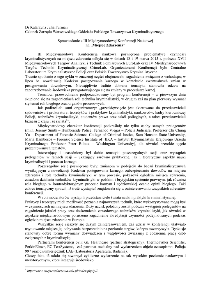 Dr Katarzyna Julia Furman Członek Zarządu Warszawskiego Oddziału Polskiego Towarzystwa Kryminalistycznego Sprawozdanie z III Międzynarodowej Konferencji Naukowej nt. „Miejsce Zdarzenia” III Międzynarodowa Konferencja naukowa poświęcona problematyce czynności kryminalistycznych na miejscu zdarzenia odbyła się w dniach 18 i 19 marca 2015 r. podczas XVII Międzynarodowych Targów Analityki i Technik Pomiarowych EuroLab oraz IV Międzynarodowych Targów Techniki Kryminalistycznej CrimeLab. Organizatorami Konferencji było Centralne Laboratorium Kryminalistyczne Policji oraz Polskie Towarzystwo Kryminalistyczne. Trzecie spotkanie z tego cyklu w znacznej części obejmowało zagadnienia związane z wchodzącą w lipcu br. nowelizacją Kodeksu postępowania karnego w kontekście ewentualnych zmian w postępowaniu dowodowym. Niewątpliwie trafnie dobrana tematyka stanowiła odzew na zapotrzebowanie środowiska przygotowującego się na zmiany w procedurze karnej. Tematowi przewodniemu podporządkowany był program konferencji – w pierwszym dniu skupiono się na zagadnieniach roli technika kryminalistyki, w drugim zaś na plan pierwszy wysunął się temat roli biegłego oraz organów procesowych. Jak podkreślali sami organizatorzy: „przedsięwzięcie jest skierowane do przedstawicieli sądownictwa i prokuratury, teoretyków i praktyków kryminalistyki, naukowców, kadry kierowniczej Policji, techników kryminalistyki, studentów prawa oraz szkół policyjnych, a także przedstawicieli biznesu z kraju i ze świata1”. Międzynarodowy charakter konferencji podkreślały nie tylko osoby samych prelegentów (m.in. Jeremy Smith – Humberside Police, Fernando Viegas – Policia Judiciara, Professor Chi Chung Yu – Department of Forensic Science, College of Criminal Justice, Sam Houston State University, Maria Kambosos – Forensic Science Institute of BKA – Instytut Kryminalistyki Krajowego Urzędu Kryminalnego, Professor Peter Bilous – Washington University), ale również szerokie ujęcie prezentowanych tematów. Interesujący i uzasadniony był dobór tematyki poszczególnych sesji oraz wystąpień prelegentów w ramach sesji – ukazujący zarówno praktyczne, jak i teoretyczne aspekty nauki kryminalistyki i procesu karnego. Poszczególne sesje poświęcone były: zmianom w podejściu do badań kryminalistycznych wynikającym z nowelizacji Kodeksu postępowania karnego, zabezpieczaniu dowodów na miejscu zdarzenia i rola technika kryminalistyki w tym procesie, pokazowi oględzin miejsca zdarzenia, zasadom działania techników kryminalistyki w polskim i brytyjskim systemie prawnym, jak również rola biegłego w kontradyktoryjnym procesie karnym i sędziowskiej ocenie opinii biegłego. Taki zakres tematyczny sprawił, iż treść wystąpień znajdowała się w zainteresowaniu wszystkich adresatów konferencji. W roli moderatorów wystąpili przedstawiciele świata nauki i praktyki kryminalistycznej. Praktycy i teoretycy mieli możliwość poznania najnowszych technik, które wykorzystywane mogą być w czynnościach na miejscu zdarzenia. Duży nacisk położony został podczas wystąpień prelegentów na zagadnienie jakości pracy oraz doskonalenia zawodowego techników kryminalistyki, jak również w aspekcie międzynarodowym poruszono zagadnienie akredytacji czynności podejmowanych podczas oględzin miejsca zdarzenia w Europie. Wszystkie sesje cieszyły się dużym zainteresowaniem, zaś udział w konferencji ułatwiało usytuowanie miejsca jej odbywania bezpośrednio na poziomie targów, którym towarzyszyła. Dyskusje stanowiły dobre forum wymiany doświadczeń i wątpliwości związanej z codzienną pracą osób związanych z kryminalistyką. Partnerami konferencji byli: GE Healthcare (partner strategiczny), ThermoFisher Scientific, PerkinElmer, EC TestSystems, zaś patronat medialny nad wydarzeniem objęło czasopismo: Policja 997 oraz dwumiesięcznik LAB (Laboratoria Aparatura, Badania). Cieszy fakt, iż udało się stworzyć cykliczne wydarzenie na tak wysokim poziomie naukowym i merytorycznym, które integruje środowisko. 1 http://www.miejscezdarzenia.edu.pl/index.php/pl/.