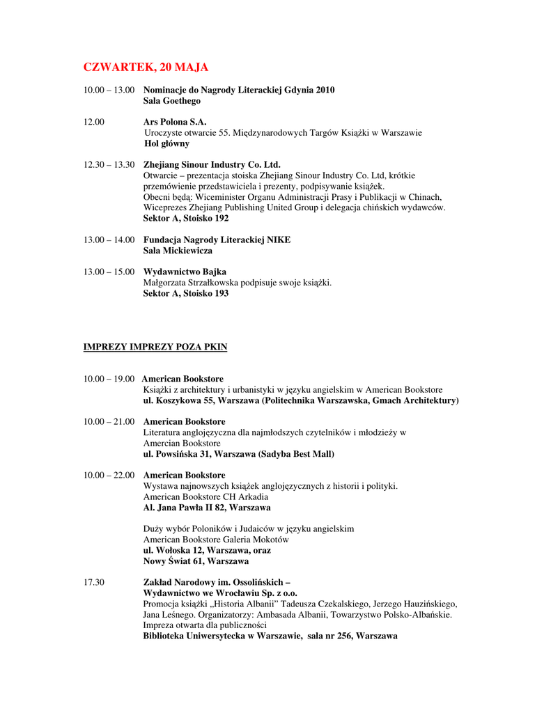 CZWARTEK, 20 MAJA 10.00 – 13.00 Nominacje do Nagrody Literackiej Gdynia 2010 Sala Goethego 12.00 Ars Polona S.A. Uroczyste otwarcie 55. Mi dzynarodowych Targów Ksi ki w Warszawie Hol główny 12.30 – 13.30 Zhejiang Sinour Industry Co. Ltd. Otwarcie – prezentacja stoiska Zhejiang Sinour Industry Co. Ltd, krótkie przemówienie przedstawiciela i prezenty, podpisywanie ksi ek. Obecni b d : Wiceminister Organu Administracji Prasy i Publikacji w Chinach, Wiceprezes Zhejiang Publishing United Group i delegacja chi skich wydawców. Sektor A, Stoisko 192 13.00 – 14.00 Fundacja Nagrody Literackiej NIKE Sala Mickiewicza 13.00 – 15.00 Wydawnictwo Bajka Małgorzata Strzałkowska podpisuje swoje ksi ki. Sektor A, Stoisko 193 IMPREZY IMPREZY POZA PKIN 10.00 – 19.00 American Bookstore Ksi ki z architektury i urbanistyki w j zyku angielskim w American Bookstore ul. Koszykowa 55, Warszawa (Politechnika Warszawska, Gmach Architektury) 10.00 – 21.00 American Bookstore Literatura angloj zyczna dla najmłodszych czytelników i młodzie y w Amercian Bookstore ul. Powsi ska 31, Warszawa (Sadyba Best Mall) 10.00 – 22.00 American Bookstore Wystawa najnowszych ksi ek angloj zycznych z historii i polityki. American Bookstore CH Arkadia Al. Jana Pawła II 82, Warszawa Du y wybór Poloników i Judaiców w j zyku angielskim American Bookstore Galeria Mokotów ul. Wołoska 12, Warszawa, oraz Nowy wiat 61, Warszawa 17.30 Zakład Narodowy im. Ossoli skich – Wydawnictwo we Wrocławiu Sp. z o.o. Promocja ksi ki „Historia Albanii” Tadeusza Czekalskiego, Jerzego Hauzi skiego, Jana Le nego. Organizatorzy: Ambasada Albanii, Towarzystwo Polsko-Alba skie. Impreza otwarta dla publiczno ci Biblioteka Uniwersytecka w Warszawie, sala nr 256, Warszawa 18:00 Instytut Słowacki Prezentacja zbioru opowiada Vladimíra Balli „Niepokój” (wyd. Pogranicze) – spotkanie z autorem poprowadz słowaccy wydawcy Koloman Kertész Bagala – L.C.A. oraz Peter Mil ák – Modrý Peter. Instytut Słowacki, ul. Krzywe Koło 12/14a, Warszawa 18.00 Oficyna Wydawnicza ATUT Oficyna Wydawnicza ATUT zaprasza na spotkanie z Kazimierzem Wóycickim i Waldemarem Czachurem, autorami ksi ek „Jak rozmawia z Niemcami? O trudno ciach dialogu polsko-niemieckiego i jego europejskim wyzwaniu” i „Polen im Gespräch mit Deutschland. Zur Spezifik des Dialogs und seinen europäischen Herausforderungen”. Spotkanie poprowadzi Henryk Szlajfer. Biblioteka Publiczna m.st. Warszawy, ul. Koszykowa 26/28, Warszawa 20.00 A.P.A.J.T.E. Specjalny spektakl z okazji MTK pt. „Zgrzyt” Piotra Lachmanna. ul. Morskie Oko 2, Pałacyk Szustra, Lothe Lachmann Videoteatr „Poza” - ilo miejsc ograniczona, zgłoszenia na stoisku APAJTE Sektor A, Stoisko 30. IMPREZY CAŁODNIOWE 10.00 – 18.00 MULTICO Oficyna Wydawnicza Wydawnictwo Multico zaparsza na cykl spotka Moniki Gromek - autorki zeszytu edukacyjnego „Fryderyk Chopin” z uczniami szkół podstawowych i muzycznych z Warszawy i okolic Warszawy. Podczas spotkania, autorka ksi ki, w sposób interesuj cy dla młodego czytelnika, przedstawi najciekawsze fakty dotycz ce ycia i twórczo ci Chopina. B dzie równie czas na zadawanie pyta oraz autografy. Dodatkowo ka dy uczestnik spotkania otrzyma 1 egz. zeszytu edukacyjnego do samodzielnej lektury w domu. Zeszyt edukacyjny b dzie równie rozdawany podczas pozostałych imprez towarzysz cych obchodom Roku Chopinowskiego oraz na stoisku Multico Oficyny Wydawniczej w trakcie 55. Mi dzynarodowych Targów Ksi ki. 10.00 – 18.00 Fundacja Dzieciom „Zd y z Pomoc ” Fundacja Dzieciom „Zd y z Pomoc ” zaprasza do udziału w loterii fantowej. Los kosztuje 10 zł i ka dy wygrywa. W ród nagród s ksi eczki dla dzieci z płytami, pluszaki, gry planszowe, torby i kubki Myszki Norki. Dochód z loterii zostanie przekazany na rzecz chorych i niepełnosprawnych dzieci. Sektor A, Stoisko 147 10.00 – 18.00 Fundacja Dzieciom „Zd y z Pomoc ” Ulubienica maluchów, Myszka Norka, z rado ci zaprezentuje ksi ki dla dzieci, zaprosi do wspólnego czytania i zabawy w Klubie Myszki Norki. Klub Myszki Norki istnieje od 2002 roku. Ide przewodni Klubu jest nawi zywanie przyja ni dzieci niepełnosprawnych ze zdrowymi oraz wzajemna pomoc. Jego działalno słu y tak e wspieraniu ratowania ycia i zdrowia podopiecznych Fundacji Dzieciom „Zd y z Pomoc ”. Uczestnictwo w Klubie gwarantuje wspaniał zabaw . Organizowane s liczne konkursy z ciekawymi nagrodami, w których dzieci ch tnie bior aktywny udział. Klubowicze jako pierwsi maj mo liwo przeczytania interesuj cych ksi ek znanych polskich autorów, wydawanych przez Fundacj Dzieciom „Zd y z Pomoc ”. Sektor A, Stoisko 147 10.00 – 18.00 Nowela Wydawnictwo Konkurs z okazji wydania pierwszej polskiej adaptacji doskonałej gramatyki Grevisse’a! Podczas 55. Mi dzynarodowych Targów Ksi ki wydawnictwo NOWELA organizuje konkurs z okazji wydania pierwszej polskiej adaptacji doskonałej gramatyki Grevisse’a! Ka dy, kto przyjdzie w dniach od 20 do 23 maja na stoisko wydawnictwa NOWELA, b dzie mógł wygra t ciesz c si uznaniem i powodzeniem gramatyk . Do udziału w konkursie wydawnictwo szczególnie gor co zaprasza nauczycieli, bibliotekarzy, studentów i wszystkich miło ników j zyka francuskiego! Sektor A, Stoisko 102