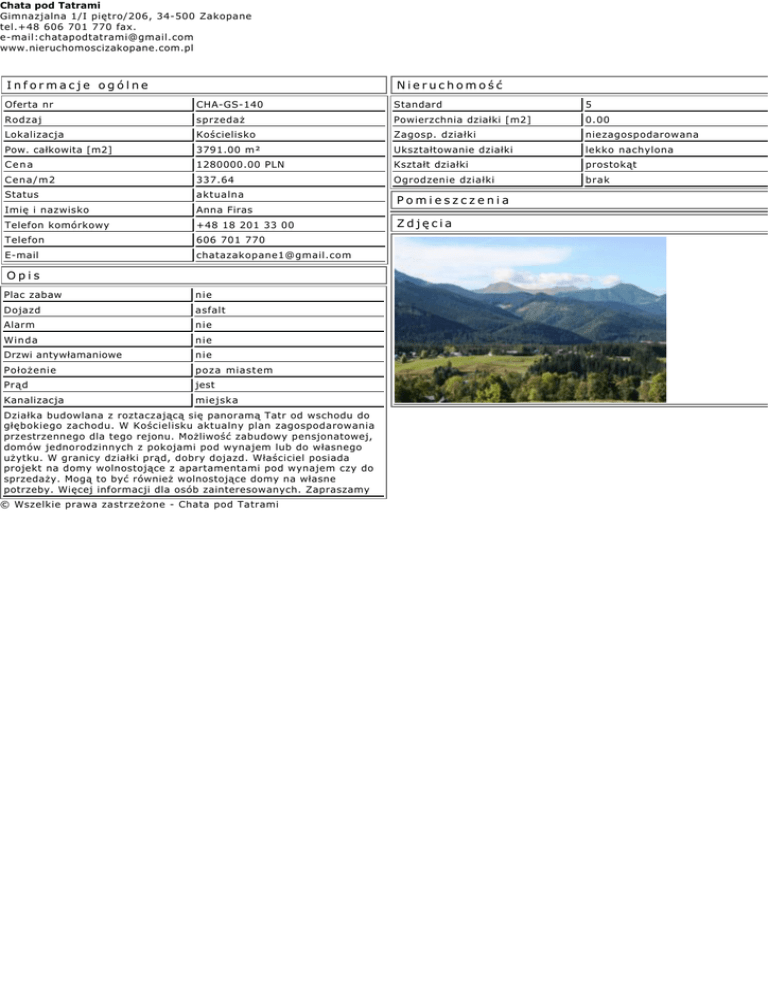 Chata pod Tatrami Gimnazjalna 1/I piętro/206, 34-500 Zakopane tel.+48 606 701 770 fax. e-mail:[email protected] www.nieruchomoscizakopane.com.pl Informacje ogólne Nieruchomość Oferta nr CHA-GS-140 Standard 5 Rodzaj sprzedaż Powierzchnia działki [m2] 0.00 Lokalizacja Kościelisko Zagosp. działki niezagospodarowana Pow. całkowita [m2] 3791.00 m² Ukształtowanie działki lekko nachylona Cena 1280000.00 PLN Kształt działki prostokąt Cena/m2 337.64 Ogrodzenie działki brak Status aktualna Imię i nazwisko Anna Firas Telefon komórkowy +48 18 201 33 00 Telefon 606 701 770 E-mail [email protected] Opis Plac zabaw nie Dojazd asfalt Alarm nie Winda nie Drzwi antywłamaniowe nie Położenie poza miastem Prąd jest Kanalizacja miejska Działka budowlana z roztaczającą się panoramą Tatr od wschodu do głębokiego zachodu. W Kościelisku aktualny plan zagospodarowania przestrzennego dla tego rejonu. Możliwość zabudowy pensjonatowej, domów jednorodzinnych z pokojami pod wynajem lub do własnego użytku. W granicy działki prąd, dobry dojazd. Właściciel posiada projekt na domy wolnostojące z apartamentami pod wynajem czy do sprzedaży. Mogą to być również wolnostojące domy na własne potrzeby. Więcej informacji dla osób zainteresowanych. Zapraszamy © Wszelkie prawa zastrzeżone - Chata pod Tatrami Pomieszczenia Zdjęcia