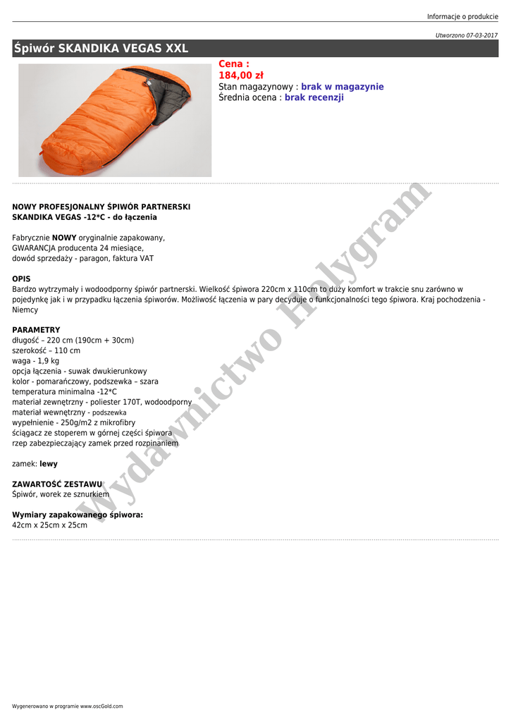 Informacje o produkcie Utworzono 07-03-2017 Śpiwór SKANDIKA VEGAS XXL Cena : 184,00 zł yg ra m Stan magazynowy : brak w magazynie Średnia ocena : brak recenzji NOWY PROFESJONALNY ŚPIWÓR PARTNERSKI SKANDIKA VEGAS -12*C - do łączenia Fabrycznie NOWY oryginalnie zapakowany, GWARANCJA producenta 24 miesiące, dowód sprzedaży - paragon, faktura VAT zamek: lewy yd aw o w ni ct PARAMETRY długość – 220 cm (190cm + 30cm) szerokość – 110 cm waga - 1,9 kg opcja łączenia - suwak dwukierunkowy kolor - pomarańczowy, podszewka – szara temperatura minimalna -12*C materiał zewnętrzny - poliester 170T, wodoodporny materiał wewnętrzny - podszewka wypełnienie - 250g/m2 z mikrofibry ściągacz ze stoperem w górnej części śpiwora rzep zabezpieczający zamek przed rozpinaniem H ol OPIS Bardzo wytrzymały i wodoodporny śpiwór partnerski. Wielkość śpiwora 220cm x 110cm to duży komfort w trakcie snu zarówno w pojedynkę jak i w przypadku łączenia śpiworów. Możliwość łączenia w pary decyduje o funkcjonalności tego śpiwora. Kraj pochodzenia Niemcy W ZAWARTOŚĆ ZESTAWU Śpiwór, worek ze sznurkiem Wymiary zapakowanego śpiwora: 42cm x 25cm x 25cm Wygenerowano w programie www.oscGold.com