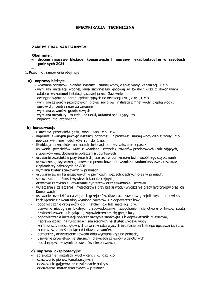 SPECYFIKACJA TECHNICZNA ZAKRES PRAC SANITARNYCH Obejmuje : • drobne naprawy bieżące, konserwacje i naprawy gminnych ZGM • 1. Przedmiot zamówienia obejmuje: eksploatacyjne w zasobach a) naprawy bieżące - wymiana odcinków pionów instalacji zimnej wody, ciepłej wody, kanalizacji i c.o. - wymiana instalacji wodnej, kanalizacyjnej lub gazowej w lokalach wraz z dokonaniem odbioru wykonanej instalacji gazowej przez Gazownię - awaryjna wymiana pomp cyrkulacyjnych na instalacji z.w. , c.w. , i c.o. - wymiana zaworów przelotowych, głowic zaworów instalacji zimnej wody, ciepłej wody , gazowych, centralnego ogrzewania - wymiana zaworów grzejnikowych - wymiana armatury : muszle , spłuczki, automat spłukujący itp. - naprawa c.o. etażowego b) konserwacje - Usuwanie przecieków gazu, wod – Kan, c.o. c.w. - naprawa awaryjna pęknięć instalacji poziomej lub pionowej zimnej wody ciepłej wody , c.o poprzez wymianę odcinków rur do 1mb. - likwidacja przecieków na rurach instalacji poprzez założenie opasek - usuwanie przecieków wraz z wymianą uszczelek zaworów przelotowych , odcinających, śrubunków oraz docieranie połączeń śrubunkowych - usuwanie przecieków przy bateriach, kranach w pomieszczeniach wspólnego użytkowania - sprawdzenie, czyszczenie, usuwanie przecieków lub wymiana wodomierzy z.w., c.w. oraz ciepłomierzy należących do ADM - wymiana kratek ściekowych w pralniach - usuwanie awarii kanalizacyjnych w piwnicach, węzłach cieplnych oraz w praniach, - sprawdzanie drożności wywiewek kanalizacyjnych, - okresowe zamykanie i otwieranie hydrantów oraz zakładanie uszczelek - wyłączanie i załączanie hydroforów ( przy braku wody) wyciszanie pracy hydroforów oraz ich Konserwacja - usuwanie przecieków na złączach grzejników, dławicach zaworów grzejnikowych, odpowietrzni kach łącznie z ewentualną wymianą zaworów lub odpowietrzników - odpowietrzanie grzejników c.o, instalacji c.o lub instalacji c.w. - usuwanie niedogrzań lokalnych , spowodowanych zapychaniem się otworu w kryzie, stratą drożności zaworu lub gałązki , zapowietrzeniem się grzejnika , - odpowietrzenie instalacji poprzez naczynia zamknięte lub odpowietrzniki miejscowe, - naprawa izolacji na rurociągach zniszczonych na skutek wycieku wody, - kontrola szczelności głównych zaworów odcinających instalację centralnego ogrzewania, i c.w. - kontrola szczelności połączeń i dławic zaworów, - demontaż , oczyszczenie i ewentualna wymiana kryz na pionach, - usuwanie przecieków na złączach i dławicach zaworów przelotowych i odcinających – wymiana zaworów niesprawnych, c) - naprawy eksploatacyjne sprawdzanie instalacji wod – Kan, c.w. gaz, c.o czyszczenie pionów kanalizacyjnych czyszczenie gajgerów oraz zakładanie pokryw. czyszczenie kratek ściekowych w pralniach - czyszczenie przykanalików kanalizacyjnych i odpływów wody deszczowej odmrażanie instalacji wod - kan odczyty kontrolne wodomierzy głównych plombowanie wodomierzy d) pełnienie dyżurów - dyżury pełnione są : • Dni robocze - w godzinach popołudniowych i nocnych • Dni wolne od pracy oraz niedziele i święta - całodobowo - W ramach dyżuru należy bezwzględnie reagować na zgłoszenia awarii i podejmować czynności • zabezpieczenia w okresie 1 godziny licząc od przyjęcia zgłoszenia • Usunięcia awarii w okresie 12 godz. Licząc od przyjęcia zgłoszenia
