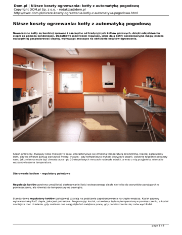 Dom.pl | Niższe koszty ogrzewania: kotły z automatyką pogodową Copyright DOM.pl Sp. z o.o. - [email protected] http://www.dom.pl/nizsze-koszty-ogrzewania-kotly-z-automatyka-pogodowa.html Niższe koszty ogrzewania: kotły z automatyką pogodową Nowoczesne kotły są bardziej sprawne i oszczędne od tradycyjnych kotłów gazowych, dzięki odzyskiwaniu ciepła za pomocą kondensacji. Dodatkowe możliwości regulacji, jakie dają kotły kondensacyjne mogą jeszcze oszczędniej gospodarować ciepłej, wpływając znacząco na obniżenie kosztów ogrzewania. Sezon grzewczy, trwający kilka miesięcy w roku, charakteryzuje się zmienną temperaturą zewnętrzną. Inaczej ogrzewamy dom, gdy na dworze panują siarczyste mrozy, inaczej - gdy temperatura wynosi powyżej 0 stopni. Ostatnie tygodnie pokazały nam, jak zmienna może być zimowa aura - po 20-stopniowych mrozach nadeszła odwilż, a wraz z nią przyjemna, niemalże wczesnowiosenna temperatura. Sterowanie kotłem - regulatory pokojowe Regulacja kotłów powinna umożliwiać dostosowanie ilości wytwarzanego ciepła nie tylko do warunków panujących w pomieszczeniu, ale również do temperatury na zewnątrz. Standardowe regulatory kotłów (pokojowe) działają na podstawie zapotrzebowania na ciepło wnętrza. Kocioł gazowy wytwarza taką ilość ciepła, jaka jest potrzebna. Programując kocioł, ustawiamy żądaną temperaturę w pomieszczeniu, a kocioł zmniejsza moc działania, gdy zostanie ona osiągnięta lub zwiększa pracę, gdy pomieszczenie się znów wychłodzi. page 1 / 8 Dom.pl | Niższe koszty ogrzewania: kotły z automatyką pogodową Copyright DOM.pl Sp. z o.o. - [email protected] http://www.dom.pl/nizsze-koszty-ogrzewania-kotly-z-automatyka-pogodowa.html Działanie kotła możemy dostosować także do stylu życia - nocą lub w czasie naszej nieobecności pomieszczenia nie muszą być mocno ogrzewane, dzięki zastosowaniu regulatora z możliwością zaprogramowania cykli ogrzewania z temperaturą komfortową i cykli oszczędzania. Większe możliwości - większe oszczędności Inne możliwości regulacji kotła daje automatyka pogodowa. Dzięki jej zastosowaniu temperatura utrzymywana jest na jak najniższym poziomie, niezbędnym jednak do utrzymania określonej przez nas komfortowej temperatury. Takie oszczędne gospodarowanie ciepłem jest możliwe dzięki temu, że regulator pogodowy uzależnia temperaturę od temperatury zewnętrznej. Temperatura na zewnątrz wpływa na zapotrzebowanie na ciepło. Im wyższa temperatura zewnętrzna, tym mniej ciepła trzeba wytworzyć, by utrzymać żądaną temperaturę w pomieszczeniach, tym niższa może być temperatura czynnika grzewczego. I odwrotnie. Automatyka pogodowa jest tak czuła, że pozwala na precyzyjną regulację temperatury co do 1o.C. Gdy temperatura na zewnątrz wzrasta, regulator pogodowy obniża pracę kotła chociażby o ten 1 stopień. A warto wiedzieć, że obniżenie temperatury o 1o C przekłada się na zmniejszenie kosztów ogrzewania o 6%! Na rachunku za cały sezon grzewczy to niebagatelna kwota. (Regulator pogodowy może być zamontowany na ścianie. Dzięki jego zastosowaniu kotły kondensacyjne są praktycznie bezobsługowe. Na zdjęciu regulator pogodowy, fot. Junkers) (Kocioł kondensacyjny ogrzewa zarówno wodę użytkową, jak i wodę, która zasila instalację ogrzewania. Pod względem funkcji nie różni się więc od kotła tradycyjnego niekondensacyjnego. Jednak tradycyjny kocioł gazowy wydala spaliny do atmosfery, zawierające ciepło, które jest bezpowrotnie tracone. Natomiast nowoczesne kotły kondensacyjne maksymalnie wykorzystują to ciepło ze spalin, zanim je wyrzucą. Na zdjęciu kocioł kondensacyjny Vitodens 220-W, fot. Viessmann) page 2 / 8 Dom.pl | Niższe koszty ogrzewania: kotły z automatyką pogodową Copyright DOM.pl Sp. z o.o. - [email protected] http://www.dom.pl/nizsze-koszty-ogrzewania-kotly-z-automatyka-pogodowa.html (Regulator pogodowy może być także wbudowany w urządzenie. Na zdjęciu kocioł gazowy CERACLASS EXCELLENCE ZSC 24-3 MFK, fot. Junkers) Czy zawsze warto stosować automatykę pogodową? W domach o powierzchni mniejszej niż 100 mkw, przy zamontowanym tradycyjnym kotle gazowym, automatyka pogodowa nie zawsze jest niezbędna. Oszczędności wynikające z jej zastosowania nie będą tak duże, jak przy większych domach. Właściciele dużych budynków, wymagających naprawdę sporych nakładów na ogrzewanie domu, docenią korzyści regulatora pogodowego już po pierwszych sezonie grzewczym. Kiedy należy stosować automatykę pogodową? page 3 / 8 Dom.pl | Niższe koszty ogrzewania: kotły z automatyką pogodową Copyright DOM.pl Sp. z o.o. - [email protected] http://www.dom.pl/nizsze-koszty-ogrzewania-kotly-z-automatyka-pogodowa.html Bezwzględnie warto stosować automatykę pogodową zawsze przy kotłach kondensacyjnych. Chodzi tu bowiem nie tylko o energooszczędność, ale również maksymalne wykorzystanie sprawności kotła. Dzięki zjawisku kondensacji nowoczesne kotły gazowe pracują o ok. 11% oszczędniej od kotłów tradycyjnych. Automatyka pogodowa pozwala osiągnąć średnioroczną sprawność znormalizowaną powyżej 100%, dzięki jeszcze lepszemu wykorzystaniu zjawiska kondensacji. Przeczytaj także: Kocioł kondensacyjny czy tradycyjny Szukając oszczędności na kosztach ogrzewania, rozważamy wybór nowoczesnych źródeł ciepła. Na naszym forum budowlanym trwa dyskusja dotycząca wyboru kotła do ogrzewania gazowego. Jaki kocioł gazowy warto wybrać? Czym się różni kocioł kondensacyjny od tradycyjnego? Czy kocioł kondensacyjny może działać ze starymi grzejnikami? Miejsce na kocioł gazowy Nowoczesne kotły gazowe można zamontować w każdym pomieszczeniu, które spełnia określone w przepisach normy dotyczące wysokości, kubatury, wentylacji i odprowadzenia spalin, a także dopływu powietrza do spalania. Warunki montażu urządzeń grzewczych określone są w Rozp