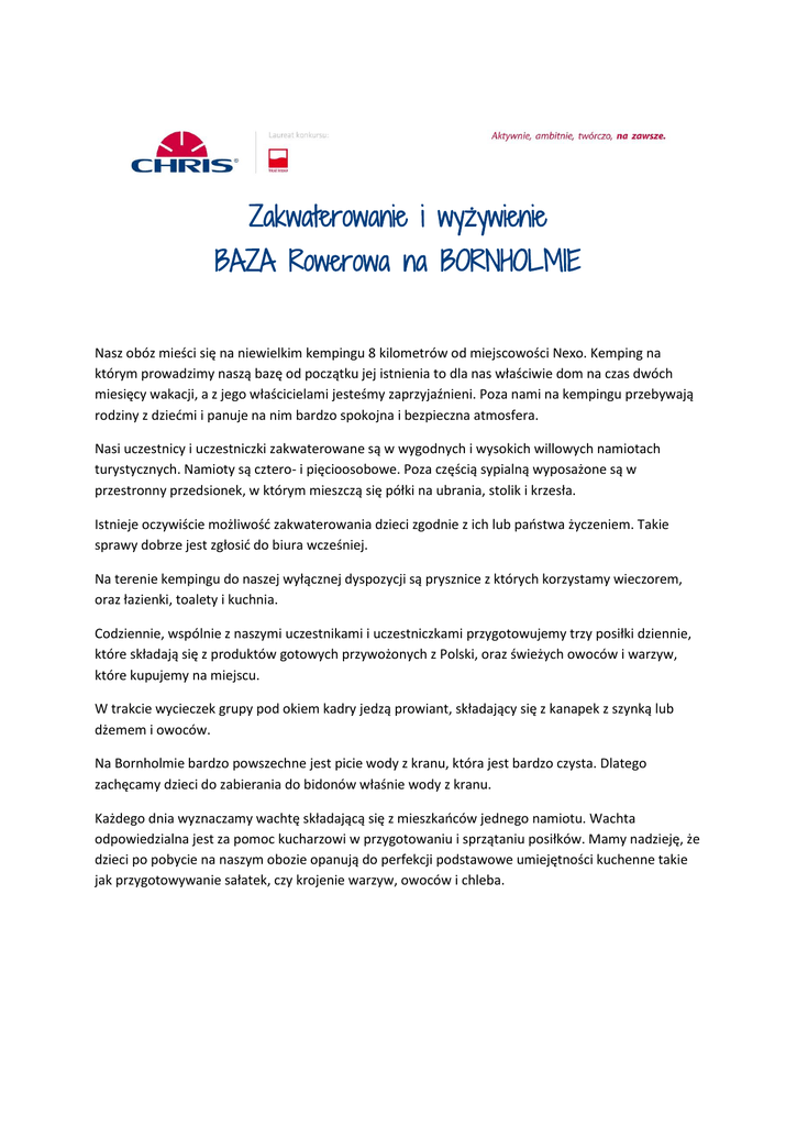 Zakwaterowanie i wyżywienie BAZA Rowerowa na BORNHOLMIE Nasz obóz mieści się na niewielkim kempingu 8 kilometrów od miejscowości Nexo. Kemping na którym prowadzimy naszą bazę od początku jej istnienia to dla nas właściwie dom na czas dwóch miesięcy wakacji, a z jego właścicielami jesteśmy zaprzyjaźnieni. Poza nami na kempingu przebywają rodziny z dziećmi i panuje na nim bardzo spokojna i bezpieczna atmosfera. Nasi uczestnicy i uczestniczki zakwaterowane są w wygodnych i wysokich willowych namiotach turystycznych. Namioty są cztero- i pięcioosobowe. Poza częścią sypialną wyposażone są w przestronny przedsionek, w którym mieszczą się półki na ubrania, stolik i krzesła. Istnieje oczywiście możliwość zakwaterowania dzieci zgodnie z ich lub państwa życzeniem. Takie sprawy dobrze jest zgłosić do biura wcześniej. Na terenie kempingu do naszej wyłącznej dyspozycji są prysznice z których korzystamy wieczorem, oraz łazienki, toalety i kuchnia. Codziennie, wspólnie z naszymi uczestnikami i uczestniczkami przygotowujemy trzy posiłki dziennie, które składają się z produktów gotowych przywożonych z Polski, oraz świeżych owoców i warzyw, które kupujemy na miejscu. W trakcie wycieczek grupy pod okiem kadry jedzą prowiant, składający się z kanapek z szynką lub dżemem i owoców. Na Bornholmie bardzo powszechne jest picie wody z kranu, która jest bardzo czysta. Dlatego zachęcamy dzieci do zabierania do bidonów właśnie wody z kranu. Każdego dnia wyznaczamy wachtę składającą się z mieszkańców jednego namiotu. Wachta odpowiedzialna jest za pomoc kucharzowi w przygotowaniu i sprzątaniu posiłków. Mamy nadzieję, że dzieci po pobycie na naszym obozie opanują do perfekcji podstawowe umiejętności kuchenne takie jak przygotowywanie sałatek, czy krojenie warzyw, owoców i chleba.