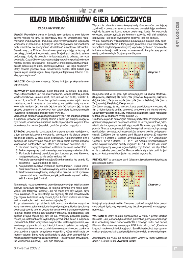 ZAGRAJMY W DELFY UWAGI: Prawdziwa perła w świecie gier będąca w swej istocie czymś więcej niż grą. To prawdziwy test na umiejętność rozumowania indukcyjnego. Indukcja, czyli wyprowadzanie ogólnych wniosków z przesłanek będących poszczególnymi przypadkami tych wniosków, to specyficzna działalność umysłowa człowieka. Bywało więc, że 12-letni chłopak okazywał się w tej grze lepszy od dorosłego, inteligentnego mężczyzny. Dla jednych będzie to zatem coś, czego nigdy nie polubią – inni poczują się tu od razu, jak ryba w wodzie. Czy próby wykorzystania tej gry powinny podjąć różnego rodzaju ośrodki edukacyjne – nie wiem, i choć odpowiedź twierdząca siłą ciśnie się na usta, pozostaje pytanie – jak tego nauczyć? Delfy zawiera jeszcze drugi, niesamowity aspekt. Otóż każda gra opiera się na jakiejś regule. Tutaj reguła jest tajemnicą. Chodzi o to, aby ją rozszyfrować... Wyrocznia odsłania z talonu kolejną kartę. Gracze znów oceniają jej zgodność – co ważne, zawsze w stosunku do ostatniej prawidłowej, czyli do leżącej na końcu rzędu poziomego karty. Po werdykcie wyroczni, gracze zyskują po kolejnym sztonie, jeśli dali właściwą odpowiedź - lub tracą ewentualnie zdobyte, jeśli się pomylili. W toku dalszej gry w linii poziomej pojawiają się kolejne karty zgodne swym następstwem z tajną regułą (powstaje więc widoczny dla wszystkich rząd kart prawidłowych), a poniżej (w liniach pionowych), te które w danej chwili (a więc w stosunku do karty leżącej ponad nimi) zgodne nie były. Spójrzmy na diagram 1. GRY LOGICZNE KLUB MIŁOŚNIKÓW GIER LOGICZNYCH Diagram 1 GRACZE: Co najmniej 4 osoby. Górny limit jest praktycznie nieograniczony. REKWIZYTY: Standardowa, pełna talia kart (52 sztuki - bez jokerów). Starszeństwo kart nie ma znaczenia, jednak istotna jest ich wartość liczbowa, jako że as=1, 2=2, (itd. aż do 10=10), walet=11, dama 12, a król=13. As może być traktowany zarówno jako karta najniższa, jak i najwyższa. Jak wiemy, wszystkie karty są w 4 kolorach: treflach (♣), karach (♦), kierach (♥) i pikach (♠). W ten sposób otrzymujemy ze zwykłych kart cztery ciągi liczb naturalnych i wszelkie komplikacje między nimi wynikłe... Oprócz tego potrzebne są specjalne żetony (po 1 dla każdego gracza) z napisem „prawda” po jednej stronie i „fałsz” po drugiej (mogą to być zwykłe, obustronnie zapisane kartki papieru) oraz większa ilość jednakowych sztonów (zapałek, guzików, pionów do gry itp.). ZASADY: Losowanie rozstrzyga, który gracz zostaje rozdającym, a tym samym tak zwaną wyrocznią. Wyrocznia nie bierze bezpośredniego udziału w grze, ale ją organizuje. Najpierw ustala ona i zapisuje do koperty tajną regułę gry, która ściśle określa zasadę właściwego następstwa kart. Może ona brzmieć dowolnie, np.: 1. Po karcie czarnej prawidłowa jest karta czerwona i odwrotnie. 2. Po karcie parzystej powinna następować nieparzysta i odwrotnie. 3. Po karcie treflowej prawidłowa jest karowa, po niej kierowa, następnie pikowa, po nie znów treflowa itd. 4. Po karcie czerwonej winna pojawić się karta niska (od asa do 7), po czarnej – wysoka (od 8 do króla). 5. Kolejna karta musi być wyższa od poprzedniej o 1, 2 lub 3 wartości (z założeniem, że po królu wyższy jest as, po asie dwójka itd.) 6. Wartość ostatnio wyłożonej karty podziel przez 4. Jeżeli wynik nie daje reszty kartą prawidłową jest pik, jeśli reszta wynosi 1 – kier, jeśli 2 – karo, jeśli 3 – trefl. Tajna reguła może obejmować przeróżne pomysły (np. jeżeli ostatnio odkryta karta była prawidłowa, to kolejna powinna być maści czerwonej, jeśli fałszywa - czarnej), ale nie może być zbyt wąska, czyli musi zakładać, że w talii istnieje co najmniej 10 kart prawidłowych (np. reguła, że kolejne karty muszą być o 1 oczko wyższe lub niższe jest za wąska, bo takich kart jest co najwyżej 8). Po przetasowaniu i przełożeniu talii, wyrocznia kładzie wszystkie karty na stole w zakrytym talonie i wyświęca górną, kładąc ją odkrytą po prawej stronie talonu. Jest to karta startowa. Następnie odkrywa kolejną i zadaje pytanie: czy ta karta w stosunku do poprzedniej jest zgodna z tajną regułą gry, czy też nie. Wszyscy pozostali gracze muszą się ustosunkować wykładając przed sobą żeton z napisem „prawda” lub „fałsz” (oczywiście na początku jest to zgadywanka, ale w miarę przybywania odkrytych kart, informacji będzie coraz więcej). Po wyłożeniu żetonów wyrocznia informuje wszem i wobec, czy karta była zgodna z regułą i przydziela wszystkim, którzy mieli rację po jednym sztonie. Samą kartę zaś kładzie na stole obok poprzedniej: w rzędzie poziomym (czyli po prawej stronie) – jeśli była ona prawidłowa, lub w kolumnie pionowej – jeśli była fałszywa. 3 kwietnia 2009 r. Kolejność kart w tej grze była następująca: K♥ (karta startowa), 8♣(prawda), 8♦(fałsz), D♠ (fałsz), W♠ (prawda), 4♦(prawda), 5♦(prawda), A♥ (fałsz), 2♠ (prawda), 6♠ (fałsz), 6♥ (fałsz), 2♦(fałsz), 10♥ (fałsz), 7♥ (prawda), K♣ (fałsz), D♣ (prawda). Zwróćmy uwagę, że np. W♠ jest kartą prawidłową w stosunku do 8♣, a niekoniecznie do D♠, ponieważ w ogóle się do niej nie odnosi. Sprawdźmy zresztą sami, czy wszystko się zgadza (tajna reguła jest tu taka, jak w podanym wyżej punkcie 2). Gra toczy się aż do odsłonięcia ostatniej karty z talii. W międzyczasie gracze zyskują zawsze po jednym sztonie za każdą prawidłową odpowiedź, ale tracą wszystkie, jeśli się pomylili. Na koniec gry oblicza się punkty. Gracze zdobywają ich tyle, ile uzyskali w sztonach przewagi nad każdym ze słabszych uczestników, a tracą tyle ile do lepszych stracili. Załóżmy, że na koniec partii Bożena zdobyła 20 sztonów, Cezary 14, a Dorota 6. Bożena uzyskała zatem 6 + 14 = 20 punktów, Cezary 