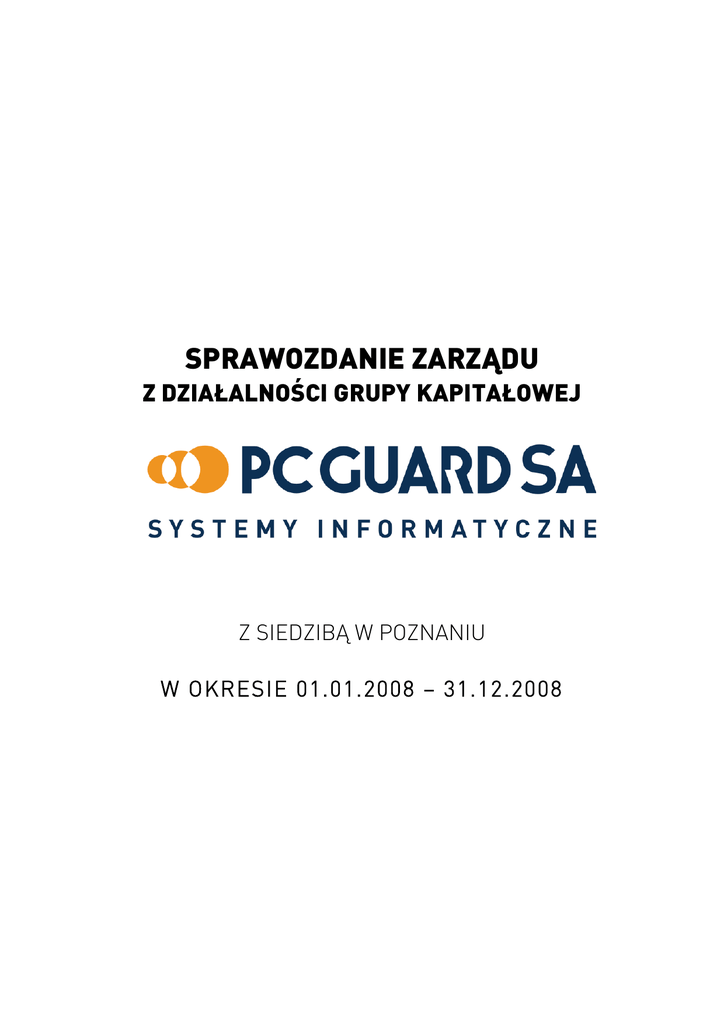 SPRAWOZDANIE ZARZĄDU Z DZIAŁALNOŚCI GRUPY KAPITAŁOWEJ Z SIEDZIBĄ W POZNANIU W OKRESIE 01.01.2008 – 31.12.2008 SPIS TREŚCI: I. Stan prawny i władze Spółki 3 II. Charakterystyka działalności Grupy (produkty, rynki zbytu i zaopatrzenia, umowy) 5 III. Osiągnięcia Grupy 6 IV. Aktualny i przewidywany stan majątkowy i sytuacja finansowa Grupy V. Ocena uzyskanych efektów (w tym analiza wskaźnikowa) 9 9 VI. Zdarzenia istotnie wpływające na działalność Grupy 13 VII. Opis czynników ryzyka i zagrożeń 13 VIII. Przewidywany rozwój Grupy 14 2 I. Stan prawny i władze Grupy: Pełna nazwa podmiotu dominującego: Adres siedziby : PC Guard Spółka Akcyjna ul. Jasielska 16 , 60-476 Poznań Z dniem 04 czerwca 2007 roku Spółka prowadzi działalność pod adresem: 60-476 Poznań, ul. Jasielska 16. W dniu 18.06.2007 roku postanowieniem Sądu Rejonowego w Poznaniu XXI Wydział Gospodarczy Krajowego Rejestru Sądowego został dokonany wpis o zmianie adresu prowadzenia działalności. Spółka została wpisana do Rejestru Przedsiębiorców prowadzonego przez Sąd Rejonowy w Poznaniu XXI Wydział Gospodarczy pod numerem KRS 0000137173 w dniu 31.10.2002 roku. Spółka posiada dwa Biura Handlowe: 1. Warszawa przy ul. Kierbedzia 4, 2. Katowice przy ul. Czerwińskiego 6 – od listopada 2007. Podstawowym przedmiotem działalności biur handlowych jest sprzedaż i wdrażanie oraz nadzór nad systemem Graffiti. Biura handlowe nie prowadzą działalności w zakresie sprzedaży i wdrażania systemów obcych jak również nie dokonują sprzedaży sprzętu komputerowego. Spółka została zawiązana: 02.08.2000 r. Podstawowy przedmiot działalności Spółki według EKD: 7220Z działalność w zakresie oprogramowania Władze Spółki: Dariusz Grześkowiak Mariusz Bławat Rada Nadzorcza: Mariusz Staszak Łukasz Motała Katarzyna Jakubiak Kazimierz Frątczak Paweł Śliwiński - Prezes Zarządu, - Członek Zarządu. - Przewodniczący Rady Nadzorczej, - Wiceprzewodniczący Rady Nadzorczej, - Sekretarz Rady Nadzorczej, - Członek Rady Nadzorczej, - Członek Rady Nadzorczej. Rada Nadzorcza po WZA z dnia 27 czerwca 2008 roku: Łukasz Motała Tomasz Owczarzak Małgorzata Grześkowiak Kazimierz Frątczak Wojciech Skiba – Przewodniczący Rady Nadzorczej, – Wiceprzewodniczący Rady Nadzorczej, - Sekretarz Rady Nadzorczej, – Członek Rady Nadzorczej, - Członek Rady Nadzorczej. 3 Informacje dotyczące podmiotu zależnego: Pełna nazwa podmiotu zależnego: Divicom Spółka Akcyjna Adres siedziby: Bosa 9a, 60-125 Poznań Adres działalności Bosa 9a, 60-125 Poznań. Spółka została wpisana do Rejestru Przedsiębiorców prowadzonego przez Sąd Rejonowy w Poznaniu XXI Wydział Gospodarczy pod numerem KRS 00002676611 w dniu 17.11.2006 roku. Spółka została zawiązana: 05.10.2006 r. Podstawowy przedmiot działalności Spółki według EKD: 5184Z Sprzedaż hurtowa komputerów, urządzeń peryferyjnych i oprogramowania Podstawowym przedmiotem działalności spółki jest sprzedaż hurtowa sprzętu komputerowego. Władze Spółki: W okresie od 01.01.2008 do 31.12.2008 Zarząd pracował w składzie dwuosobowym. W okresie od 01.01.2008 do 23.09.2008 r. skład Zarządu przedstawiał się następująco: Kamil Kaczmarek – Prezes Zarządu Andrzej Jaroszewski – Wiceprezes Zarządu W okresie 25.02.2008 do 24.05.2008 Prezes Zarządu był zawieszony w czynnościach decyzją Rady Nadzorczej Divicom S.A. W okresie od 23.09.2008 do 31.12.2008 r. skład Zarządu przedstawiał się następująco: Wojciech Skiba – Prezes Zarządu Andrzej Jaroszewski – Wiceprezes Zarządu W okresie 23.09.2008 do 04.11.2008 Pan Wojciech Skiba był oddelegowany z Rady Nadzorczej do pełnienia funkcji Prezes Zarządu. W dniu 04.11.2008 został powołany przez Radę Nadzorczą na stanowisko Prezesa Zarządu Divicom S.A. Członkami Rady Nadzorczej w okresie od 01.01.2008 do 24.06.2008 byli: Dariusz Grześkowiak – Przewodniczący Rady Nadzorczej Henryka Koblańska – Wiceprzewodniczący Rady Nadzorczej Mariusz Staszak – Sekretarz Rady Nadzorczej Agnieszka Jankowiak – Członek Mariusz Bławat – Członek Członkami Rady Nadzorczej w okresie od 30.06.2008 do 03.11.2008 byli: Dariusz Grześkowiak – Przewodniczący Rady Nadzorczej Henryka Koblańska – Wiceprzewodniczący Rady Nadzorczej Tomasz Owczarzak – Sekretarz Rady Nadzorczej 4 Mariusz Bławat – Członek Wojciech Skiba – Członek Członkami Rady Nadzorczej w okresie od 04.11.2008 do 31.12.2008 byli: Dariusz Grześkowiak – Przewodniczący Rady Nadzorczej Henryka Koblańska – Wiceprzewodniczący Rady Nadzorczej Tomasz Owczarzak – Sekretarz Rady Nadzorczej Mariusz Bławat – Członek Paweł Zołotarewicz - Członek Informacje dotyczące podmiotu powiązanego: Pełna nazwa podmiotu zależnego: MTS Notebook sp. z o.o. Adres siedziby: Grochowe Łąki 7A/1 , 61-752 Poznań Adres działalności: Grochowe Łąki 7A/1 , 61-752 Poznań. W dniu 14 listopada 2007 roku PC Guard SA nabył od spółki Herlomac Trading Limited z siedzibą w Nikozji 105 udziałów spółki MTS Notebook sp. z o.o. wpisanej do rejestru przedsiębiorców w Krajowym Rejestrze Sądowym prowadzonym przez Sąd Rejonowy w Poznaniu XXI Wydział Gospodarczy Krajowego Rejestru Sądowego po nr KRS 0000053257. Nabyte udziały oznaczają 35 % wszystkich udziałów spółki MTS Notebook. Tego samego dnia, tj 14 listopada 2007 roku, w skład Zarządu spółki MTS Notebook sp. z o.o., został powołany Członek Zarządu spółki PC Guard SA – Pan Mariusz Bławat. II. Charakterystyka działalności Grupy (produkty, rynki zbytu i zaopatrzenia, umowy) PC Guard SA Przedmiotem działalności spółki jest dostarczanie i wdrażanie nowoczesnych i kompleksowych rozwiązań z zakresu zaawansowanych technologii informatycznych. Podstawowym produktem oferowanym przez spółkę jest zintegrowany system informatyczny do wspomagania zarządzania przedsiębiorstwem Graffiti. Strategicznym segmentem rynkowym zainteresowań s