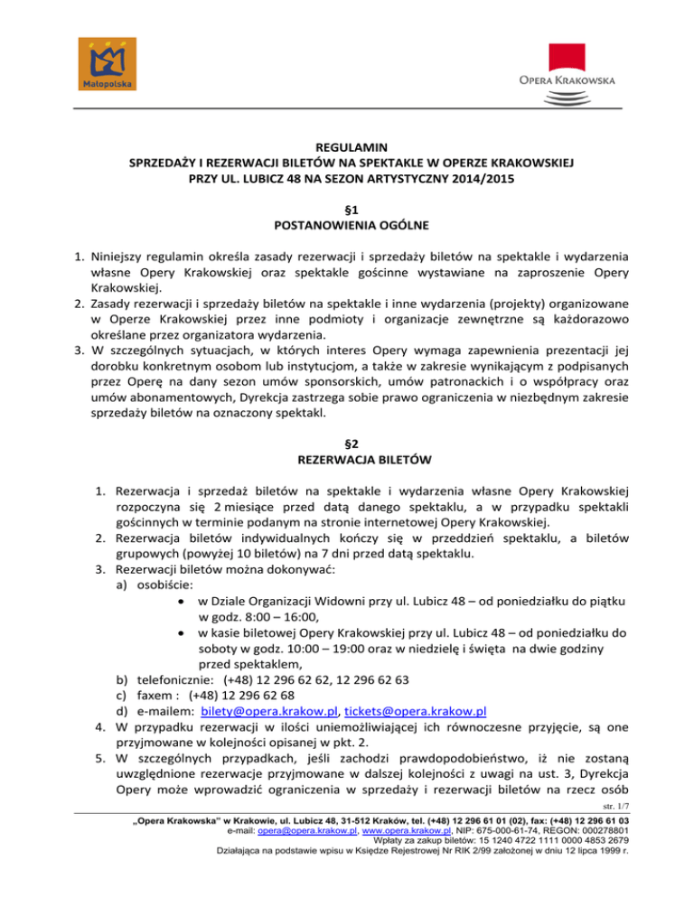 REGULAMIN SPRZEDAŻY I REZERWACJI BILETÓW NA SPEKTAKLE W OPERZE KRAKOWSKIEJ PRZY UL. LUBICZ 48 NA SEZON ARTYSTYCZNY 2014/2015 §1 POSTANOWIENIA OGÓLNE 1. Niniejszy regulamin określa zasady rezerwacji i sprzedaży biletów na spektakle i wydarzenia własne Opery Krakowskiej oraz spektakle gościnne wystawiane na zaproszenie Opery Krakowskiej. 2. Zasady rezerwacji i sprzedaży biletów na spektakle i inne wydarzenia (projekty) organizowane w Operze Krakowskiej przez inne podmioty i organizacje zewnętrzne są każdorazowo określane przez organizatora wydarzenia. 3. W szczególnych sytuacjach, w których interes Opery wymaga zapewnienia prezentacji jej dorobku konkretnym osobom lub instytucjom, a także w zakresie wynikającym z podpisanych przez Operę na dany sezon umów sponsorskich, umów patronackich i o współpracy oraz umów abonamentowych, Dyrekcja zastrzega sobie prawo ograniczenia w niezbędnym zakresie sprzedaży biletów na oznaczony spektakl. §2 REZERWACJA BILETÓW 1. Rezerwacja i sprzedaż biletów na spektakle i wydarzenia własne Opery Krakowskiej rozpoczyna się 2 miesiące przed datą danego spektaklu, a w przypadku spektakli gościnnych w terminie podanym na stronie internetowej Opery Krakowskiej. 2. Rezerwacja biletów indywidualnych kończy się w przeddzień spektaklu, a biletów grupowych (powyżej 10 biletów) na 7 dni przed datą spektaklu. 3. Rezerwacji biletów można dokonywać: a) osobiście: w Dziale Organizacji Widowni przy ul. Lubicz 48 – od poniedziałku do piątku w godz. 8:00 – 16:00, w kasie biletowej Opery Krakowskiej przy ul. Lubicz 48 – od poniedziałku do soboty w godz. 10:00 – 19:00 oraz w niedzielę i święta na dwie godziny przed spektaklem, b) telefonicznie: (+48) 12 296 62 62, 12 296 62 63 c) faxem : (+48) 12 296 62 68 d) e-mailem: [email protected], [email protected] 4. W przypadku rezerwacji w ilości uniemożliwiającej ich równoczesne przyjęcie, są one przyjmowane w kolejności opisanej w pkt. 2. 5. W szczególnych przypadkach, jeśli zachodzi prawdopodobieństwo, iż nie zostaną uwzględnione rezerwacje przyjmowane w dalszej kolejności z uwagi na ust. 3, Dyrekcja Opery może wprowadzić ograniczenia w sprzedaży i rezerwacji biletów na rzecz osób str. 1/7 „Opera Krakowska” w Krakowie, ul. Lubicz 48, 31-512 Kraków, tel. (+48) 12 296 61 01 (02), fax: (+48) 12 296 61 03 e-mail: [email protected], www.opera.krakow.pl, NIP: 675-000-61-74, REGON: 000278801 Wpłaty za zakup biletów: 15 1240 4722 1111 0000 4853 2679 Działająca na podstawie wpisu w Księdze Rejestrowej Nr RIK 2/99 założonej w dniu 12 lipca 1999 r. fizycznych i jednostek organizacyjnych, a także uzależnić osobistą lub telefoniczną sprzedaż i rezerwację biletów w ramach górnego limitu wprowadzonego dla jednostek organizacyjnych od złożenia przez taką jednostkę pisemnego zamówienia. Ograniczenia te będą każdorazowo ogłaszane na stronie internetowej www.opera.krakow.pl ,w zakładce “Repertuar”, przy danym tytule, na co najmniej 7 dni przed datą wyznaczoną jako rozpoczęcie rezerwacji. 6. Zapytanie o rezerwację biletów drogą mailową przesyłane na adresy: [email protected] i [email protected] nie jest równoznaczne z rezerwacją biletów. Opera Krakowska potwierdza faxem lub e-mailem przyjęcie rezerwacji złożonych pisemnie (dostarczonych osobiście lub przesłanych faxem, pocztą lub mailem) w ciągu 3ch dni roboczych od daty wpłynięcia zamówienia. 7. Rezerwację, której przyjęcie nie zostało potwierdzone przez Operę w ciągu 3-ch dni roboczych od daty wpłynięcia zamówienia należy uznać za niezrealizowaną. 8. Zarezerwowane bilety indywidualne i grupowe należy wykupić do terminu wyznaczonego przez osobę przyjmującą rezerwację. Rezerwacja biletów nie wykupionych do w/w terminu traci automatycznie ważność. 1. 2. 3. 4. 5. §3 SPRZEDAŻ BILETÓW Sprzedaż biletów prowadzona jest poprzez aplikację zamieszczoną na stronie internetowej Opery www.opera.krakow.pl oraz przez Kasy Biletowe Opery przy ul. Lubicz 48, od poniedziałku do soboty w godz. 10:00-19:00 oraz w niedzielę i święta na dwie godziny przed spektaklem. Informacja o aktualnych zmianach pracy Kas Biletowych zamieszczana jest na stronie internetowej Opery Krakowskiej. Sprzedaż biletów w Kasie Opery może odbywać się na podstawie wcześniejszej dokonanej rezerwacji. Internetowa sprzedaż biletów na spektakle Opery rozpoczyna się od września 2013 roku. Zakupu biletów indywidualnych można dokonać poprzez stronę internetową Opery www.opera.krakow.pl, od godziny 8:00 w dniu rozpoczęcia rezerwacji i sprzedaży na dany spektakl. Liczba biletów udostępnionych do sprzedaży poprzez stronę internetową jest ograniczona. W przypadku niekorzystnych warunków pogodowych Opera Krakowska zastrzega sobie możliwość przeniesienia lub odwołania spektakli plenerowych. Komunikaty dotyczące wyżej wymienionych zmian będą każdorazowo zamieszczane na stronie internetowej Opery Krakowskiej www.opera.krakow.pl odpowiednio w dniach prezentacji danej imprezy. W przypadku przeniesienia spektaklu, Widz, który zakupił bilet w sektorach gwarantujących przeniesienie, tym samym zapewnia sobie możliwość obejrzenia danego przedstawienia, bez względu na jego miejsce prezentacji. Płatność za bilety zakupione w Kasie Opery może być dokonywana: gotówką – w Kasie Opery, kartą płatniczą / kartą kredytową – w Kasie Opery lub na stronie internetowej, Str. 2/7 „Opera Krakowska” w Krakowie, ul. Lubicz 48, 31-512 Kraków, tel. (+48) 12 628 91 01 (02), fax: (+48) 12 628 91 03 e-mail: [email protected], www.opera.krakow.pl, NIP: 675-000-61-74, REGON: 000278801 KONTO BANKOWE: Bank BPH S.A. O/w Krakowie Nr 53 1060 0076 0000 3200 0022 0717 Działająca na podstawie wpisu w Księdze Rejestrowej Nr RIK 2/99 założonej w dniu 12 lipca 1999 r. przelewem – tylko w przypadku dokonanej wcześniej rezerwacji - na rachunek bankowy Opery, nr rach.: 15 1
