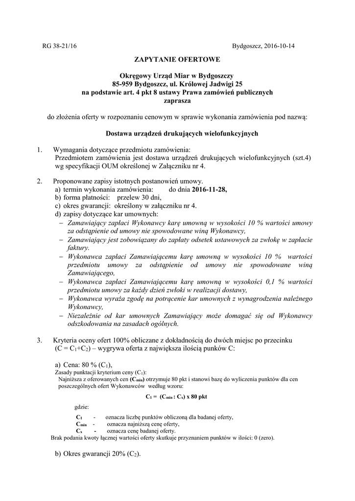 RG 38-21/16 Bydgoszcz, 2016-10-14 ZAPYTANIE OFERTOWE Okręgowy Urząd Miar w Bydgoszczy 85-959 Bydgoszcz, ul. Królowej Jadwigi 25 na podstawie art. 4 pkt 8 ustawy Prawa zamówień publicznych zaprasza do złożenia oferty w rozpoznaniu cenowym w sprawie wykonania zamówienia pod nazwą: Dostawa urządzeń drukujących wielofunkcyjnych 1. Wymagania dotyczące przedmiotu zamówienia: Przedmiotem zamówienia jest dostawa urządzeń drukujących wielofunkcyjnych (szt.4) wg specyfikacji OUM określonej w Załączniku nr 4. 2. Proponowane zapisy istotnych postanowień umowy. a) termin wykonania zamówienia: do dnia 2016-11-28, b) forma płatności: przelew 30 dni, c) okres gwarancji: określony w załączniku nr 4. d) zapisy dotyczące kar umownych: Zamawiający zapłaci Wykonawcy karę umowną w wysokości 10 % wartości umowy za odstąpienie od umowy nie spowodowane winą Wykonawcy, Zamawiający jest zobowiązany do zapłaty odsetek ustawowych za zwłokę w zapłacie faktury. Wykonawca zapłaci Zamawiającemu karę umowną w wysokości 10 % wartości przedmiotu umowy za odstąpienie od umowy nie spowodowane winą Zamawiającego, Wykonawca zapłaci Zamawiającemu karę umowną w wysokości 0,1 % wartości przedmiotu umowy za każdy dzień zwłoki w realizacji dostawy, Wykonawca wyraża zgodę na potrącenie kar umownych z wynagrodzenia należnego Wykonawcy, Niezależnie od kar umownych Zamawiający może domagać się od Wykonawcy odszkodowania na zasadach ogólnych. 3. Kryteria oceny ofert 100% obliczane z dokładnością do dwóch miejsc po przecinku (C = C1+C2) – wygrywa oferta z największa ilością punków C: a) Cena: 80 % (C1), Zasady punktacji kryterium ceny (C1): Najniższa z oferowanych cen (Cmin) otrzymuje 80 pkt i stanowi bazę do wyliczenia punktów dla cen poszczególnych ofert Wykonawców według wzoru: C1 = (Cmin : Cx) x 80 pkt gdzie: C1 oznacza liczbę punktów obliczoną dla badanej oferty, Cmin oznacza najniższą cenę oferty, Cx oznacza cenę badanej oferty. Brak podania kwoty łącznej wartości oferty skutkuje przyznaniem punktów w ilości: 0 (zero). b) Okres gwarancji 20% (C2). Zasady punktacji kryterium okresu gwarancji: C 2 = C1a + C1b + C2 + C3+ C4 Dla każdego z elementów przedmiotu zamówienia z osobna (wg oznaczeń: 1a, 1b, 2, 3, 4) najwyższy z oferowanych okresów gwarancji (Cmax) otrzymuje 4 pkt i stanowi bazę do wyliczenia punktów dla poszczególnych okresów gwarancji danego elementu ofert Wykonawców według wzoru: C1a, 1b, 2, 3, 4 = (Cx : Cmax) x 4 pkt gdzie: C1a, 1b, 2, 3, 4 - oznacza liczbę punktów badanego okresu gwarancji obliczonego dla badanej oferty, Cmax - oznacza najwyższy okres gwarancji spośród badanych oferty, Cx - oznacza wielkość okresu gwarancji badanej oferty. Brak podania okresu gwarancji skutkuje przyznaniem punktów w ilości: 0 (zero). 4. Na kopercie należy umieścić: nazwę i adres Zamawiającego, nazwę i adres Wykonawcy, nazwę przedmiotu zapytania: „Oferta na: Dostawę urządzeń drukujących wielofunkcyjnych” 5. Termin i miejsce złożenia oferty: Ofertę należy złożyć w siedzibie Zamawiającego w Okręgowym Urzędzie Miar w Bydgoszczy przy ul. Królowej Jadwigi 25, pokój nr 102, piętro I w nieprzekraczalnym terminie do dnia 2016-10-24 do godziny 12:00. 6. 7. Osobą uprawnioną do kontaktów z Wykonawcami jest: Jarosław Kosmal - Kierownik Referatu Obsługi tel.: (52) 322 06 06 wew. 35 Informacje dotyczące zawierania umowy: Niezwłocznie po wyborze najkorzystniejszej oferty zamawiający wyśle do Wykonawcy umowę. Zgodnie z art. 4 pkt 8 ustawy z dnia 29.01.2004r. Prawo zamówień publicznych (tekst jednolity Dz. U. z 2013 r., poz. 907 z późniejszymi zmianami) wobec zamówienia nie stosuje się ustawy Prawo Zamówień Publicznych. W związku z powyższym niniejsze zaproszenie do składania ofert nie jest zamówieniem i otrzymanie od Państwa oferty nie powoduje powstania żadnych zobowiązań wobec stron. Zamawiający zastrzega sobie prawo do unieważnienia postępowania bez podania przyczyny. ZATWIERDZAM: DYREKTOR Bydgoszcz, .....2016-10-14... Beata Koepke .................................... (podpis kierownika jednostki) W załączeniu: 1. Wzór formularza oferty, 2. Oświadczenie o spełnianiu warunków udziału w postępowaniu, 3. Oświadczenie o braku podstaw do wykluczenia 4. Opis przedmiotu zamówienia (specyfikacja) Załącznik nr 1 do Zapytania Ofertowego nr RG 38-21/16. ......................................................... (pieczęć nagłówkowa Wykonawcy) .................................................. miejscowość, data FORMULARZ OFERTOWY Ja (My) niżej podpisany ......................................................................................................... działając w imieniu i na rzecz ..................................................................................................................................... (nazwa i adres Wykonawcy) NIP........................................... REGON...................................... KOM. ................................................ TEL. ............................................ FAKS ....................................... e-mail: .............................................. w odpowiedzi na zapytanie ofertowe na ..................................................... ...................................................................................................................... składamy ofertę, na którą składa się: (nazwa przedmiotu zamówienia) 1. Cena (C1): Przedmiot zamówienia Cena jednostkowa netto [zł] Ilość [j.m.] Wartość netto [zł] VAT [%] Wartość brutto [zł] a b c d=b*c e f=d*e urządzenie drukujące wielofunkcyjne 4 szt. Łączna wartość netto ……............................................ zł (słownie: .............................................................................................................................................) Należny podatek VAT(…… %) …