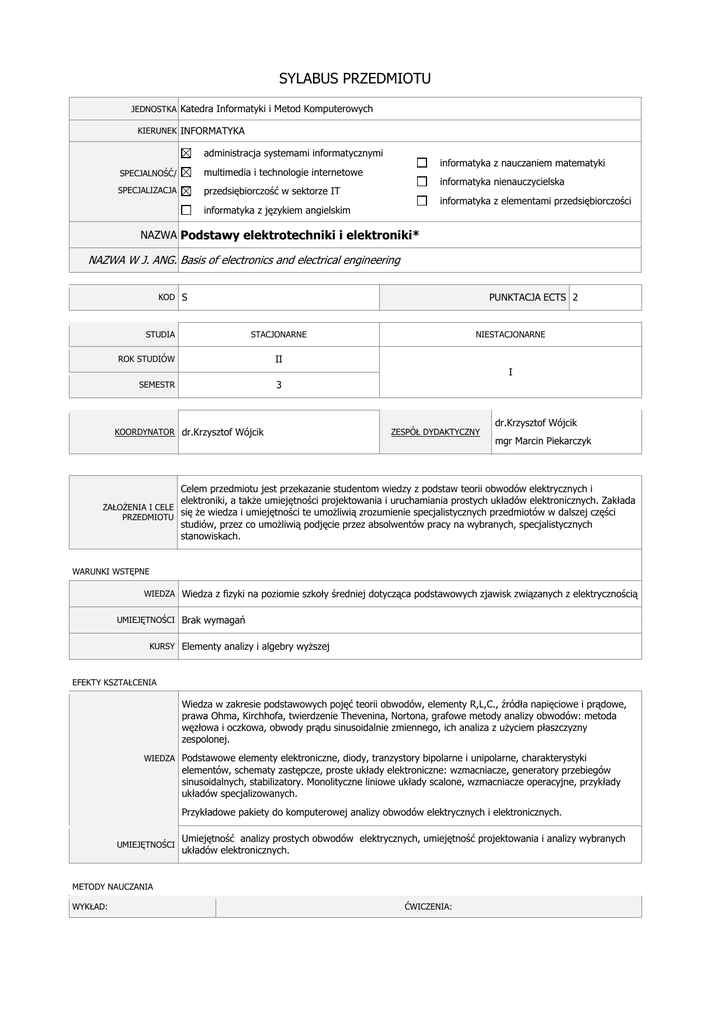 SYLABUS PRZEDMIOTU JEDNOSTKA Katedra Informatyki i Metod Komputerowych KIERUNEK INFORMATYKA administracja systemami informatycznymi SPECJALNOŚĆ/ multimedia i technologie internetowe SPECJALIZACJA przedsiębiorczość w sektorze IT informatyka z nauczaniem matematyki informatyka nienauczycielska informatyka z elementami przedsiębiorczości informatyka z językiem angielskim NAZWA Podstawy elektrotechniki i elektroniki* NAZWA W J. ANG. Basis of electronics and electrical engineering KOD S STUDIA PUNKTACJA ECTS 2 STACJONARNE ROK STUDIÓW II SEMESTR 3 NIESTACJONARNE I KOORDYNATOR dr.Krzysztof Wójcik ZESPÓŁ DYDAKTYCZNY dr.Krzysztof Wójcik mgr Marcin Piekarczyk Celem przedmiotu jest przekazanie studentom wiedzy z podstaw teorii obwodów elektrycznych i elektroniki, a także umiejętności projektowania i uruchamiania prostych układów elektronicznych. Zakłada ZAŁOŻENIA I CELE się że wiedza i umiejętności te umożliwią zrozumienie specjalistycznych przedmiotów w dalszej części PRZEDMIOTU studiów, przez co umożliwią podjęcie przez absolwentów pracy na wybranych, specjalistycznych stanowiskach. WARUNKI WSTĘPNE WIEDZA Wiedza z fizyki na poziomie szkoły średniej dotycząca podstawowych zjawisk związanych z elektrycznością UMIEJĘTNOŚCI Brak wymagań KURSY Elementy analizy i algebry wyższej EFEKTY KSZTAŁCENIA Wiedza w zakresie podstawowych pojęć teorii obwodów, elementy R,L,C., źródła napięciowe i prądowe, prawa Ohma, Kirchhofa, twierdzenie Thevenina, Nortona, grafowe metody analizy obwodów: metoda węzłowa i oczkowa, obwody prądu sinusoidalnie zmiennego, ich analiza z użyciem płaszczyzny zespolonej. WIEDZA Podstawowe elementy elektroniczne, diody, tranzystory bipolarne i unipolarne, charakterystyki elementów, schematy zastępcze, proste układy elektroniczne: wzmacniacze, generatory przebiegów sinusoidalnych, stabilizatory. Monolityczne liniowe układy scalone, wzmacniacze operacyjne, przykłady układów specjalizowanych. Przykładowe pakiety do komputerowej analizy obwodów elektrycznych i elektronicznych. UMIEJĘTNOŚCI Umiejętność analizy prostych obwodów elektrycznych, umiejętność projektowania i analizy wybranych układów elektronicznych. METODY NAUCZANIA WYKŁAD: ĆWICZENIA: informacyjny prelekcja dyskusja problemowy praca zespołowa – projekt instruktaż konwersatoryjny praca indywidualna – ćwiczenia praktyczne ćwiczenia produkcyjne inny (jaki) pokaz z objaśnieniem inne (jakie) platforma Moodle Elementy kształcenia zdalnego: inne (jakie) ORGANIZACJA FORMA ZAJĘĆ ĆWICZENIA W GRUPACH WYKŁAD (W) A STUDIA STACJONARNE LICZBA GODZIN 10 STUDIA NIESTACJONARNE K L 15 15 10 30 S P FORMY SPRAWDZANIA EFEKTÓW KSZTAŁCENIA W zaliczenie A kolokwia K L kolokwium, projekt, zaliczenie ćwiczeń laboratoryjnych S P FORMA ZALICZENIA egzamin zaliczenie z oceną zaliczenie OCENA średnia ocen z kolokwiów UWAGI PODSTAWOWA Bolkowski S.: Elektrotechnika teoretyczna, t. 1 i 2. Warszawa: WNT 1998. Krakowski M.: Elektrotechnika teoretyczna. T. 1-2. LITERATURA Warszawa: PWN 1995. Chua L.O., Lin P.M.: Komputerowa analiza układów elektronicznych. Warszawa: WNT 1981. Filipkowski A.: Układy elektroniki analogowej i cyfrowej,. WNT , Warszawa 1993. ZMIANY: Dla studiów niestacjonarnych 4 punkty ECTS UZUPEŁNIAJĄCA Kuta S.: Elementy i układy elektroniczne, AGH , Kraków 2000. Wawrzyński W.: Podstawy współczesnej elektroniki, Oficyna wydawn. Polit. Warsz., 2003