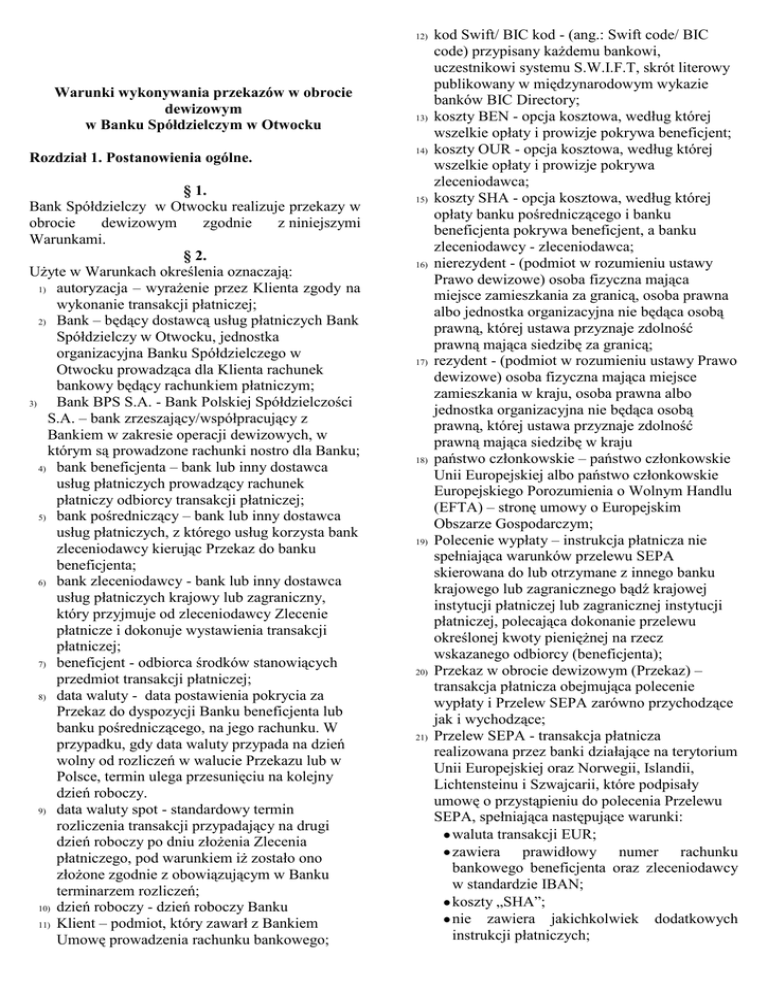 12) Warunki wykonywania przekazów w obrocie dewizowym w Banku Spółdzielczym w Otwocku Rozdział 1. Postanowienia ogólne. § 1. Bank Spółdzielczy w Otwocku realizuje przekazy w obrocie dewizowym zgodnie z niniejszymi Warunkami. § 2. Użyte w Warunkach określenia oznaczają: 1) autoryzacja – wyrażenie przez Klienta zgody na wykonanie transakcji płatniczej; 2) Bank – będący dostawcą usług płatniczych Bank Spółdzielczy w Otwocku, jednostka organizacyjna Banku Spółdzielczego w Otwocku prowadząca dla Klienta rachunek bankowy będący rachunkiem płatniczym; 3) Bank BPS S.A. - Bank Polskiej Spółdzielczości S.A. – bank zrzeszający/współpracujący z Bankiem w zakresie operacji dewizowych, w którym są prowadzone rachunki nostro dla Banku; 4) bank beneficjenta – bank lub inny dostawca usług płatniczych prowadzący rachunek płatniczy odbiorcy transakcji płatniczej; 5) bank pośredniczący – bank lub inny dostawca usług płatniczych, z którego usług korzysta bank zleceniodawcy kierując Przekaz do banku beneficjenta; 6) bank zleceniodawcy - bank lub inny dostawca usług płatniczych krajowy lub zagraniczny, który przyjmuje od zleceniodawcy Zlecenie płatnicze i dokonuje wystawienia transakcji płatniczej; 7) beneficjent - odbiorca środków stanowiących przedmiot transakcji płatniczej; 8) data waluty - data postawienia pokrycia za Przekaz do dyspozycji Banku beneficjenta lub banku pośredniczącego, na jego rachunku. W przypadku, gdy data waluty przypada na dzień wolny od rozliczeń w walucie Przekazu lub w Polsce, termin ulega przesunięciu na kolejny dzień roboczy. 9) data waluty spot - standardowy termin rozliczenia transakcji przypadający na drugi dzień roboczy po dniu złożenia Zlecenia płatniczego, pod warunkiem iż zostało ono złożone zgodnie z obowiązującym w Banku terminarzem rozliczeń; 10) dzień roboczy - dzień roboczy Banku 11) Klient – podmiot, który zawarł z Bankiem Umowę prowadzenia rachunku bankowego; 13) 14) 15) 16) 17) 18) 19) 20) 21) kod Swift/ BIC kod - (ang.: Swift code/ BIC code) przypisany każdemu bankowi, uczestnikowi systemu S.W.I.F.T, skrót literowy publikowany w międzynarodowym wykazie banków BIC Directory; koszty BEN - opcja kosztowa, według której wszelkie opłaty i prowizje pokrywa beneficjent; koszty OUR - opcja kosztowa, według której wszelkie opłaty i prowizje pokrywa zleceniodawca; koszty SHA - opcja kosztowa, według której opłaty banku pośredniczącego i banku beneficjenta pokrywa beneficjent, a banku zleceniodawcy - zleceniodawca; nierezydent - (podmiot w rozumieniu ustawy Prawo dewizowe) osoba fizyczna mająca miejsce zamieszkania za granicą, osoba prawna albo jednostka organizacyjna nie będąca osobą prawną, której ustawa przyznaje zdolność prawną mająca siedzibę za granicą; rezydent - (podmiot w rozumieniu ustawy Prawo dewizowe) osoba fizyczna mająca miejsce zamieszkania w kraju, osoba prawna albo jednostka organizacyjna nie będąca osobą prawną, której ustawa przyznaje zdolność prawną mająca siedzibę w kraju państwo członkowskie – państwo członkowskie Unii Europejskiej albo państwo członkowskie Europejskiego Porozumienia o Wolnym Handlu (EFTA) – stronę umowy o Europejskim Obszarze Gospodarczym; Polecenie wypłaty – instrukcja płatnicza nie spełniająca warunków przelewu SEPA skierowana do lub otrzymane z innego banku krajowego lub zagranicznego bądź krajowej instytucji płatniczej lub zagranicznej instytucji płatniczej, polecająca dokonanie przelewu określonej kwoty pieniężnej na rzecz wskazanego odbiorcy (beneficjenta); Przekaz w obrocie dewizowym (Przekaz) – transakcja płatnicza obejmująca polecenie wypłaty i Przelew SEPA zarówno przychodzące jak i wychodzące; Przelew SEPA - transakcja płatnicza realizowana przez banki działające na terytorium Unii Europejskiej oraz Norwegii, Islandii, Lichtensteinu i Szwajcarii, które podpisały umowę o przystąpieniu do polecenia Przelewu SEPA, spełniająca następujące warunki: waluta transakcji EUR; zawiera prawidłowy numer rachunku bankowego beneficjenta oraz zleceniodawcy w standardzie IBAN; koszty „SHA”; nie zawiera jakichkolwiek dodatkowych instrukcji płatniczych; 22) 23) 24) Bank zleceniodawcy i bank beneficjenta przelewu są uczestnikami Polecenia Przelewu SEPA - SCT (SEPA Credit Transfer). Link do wykazu banków SEPA jest dostępny na stronie internetowej Banku BPS S.A.. przepisy dewizowe- ustawa Prawo dewizowe wraz z przepisami wykonawczymi wydanymi w jej ramach i na jej podstawie oraz przepisy prawa o podobnym charakterze obowiązujące w krajach członkowskich UE; SEPA (Single Euro Payments Area) - jednolity obszar płatności w EUR; koncepcja, która spełnia rolę zintegrowanego rynku usług płatniczych; Tabela kursowa Banku – tabela, w której publikuje się kursy kupna/sprzedaży waluty krajowej (PLN) w stosunku do walut obcych, mające zastosowanie w obrocie dewizowym w Banku. 25) 26) 27) 28) 29) 30) kursy Banku BPS S.A. - kursy waluty polskiej w stosunku do walut wymienialnych, ustalane przez Departament Skarbu Centrali Banku BPS S.A. , ogłaszane w „Tabeli kursów Banku BPS S.A.” i stosowane w transakcjach dewizowych dokonywanych z tym bankiem lub realizowanych za jego pośrednictwem; Taryfa opłat – obowiązująca w Banku Taryfa opłat i prowizji bankowych dla Klientów; transakcja płatnicza – zainicjowana przez Klienta wpłata, transfer lub wypłata środków pieniężnych obejmująca również Przekaz; Unikatowy identyfikator - IBANMiędzynarodowy Numer Rachunku Bankowego - standard numeracji kont bankowych utworzony przez Europejski Komitet Standardów IBAN składa się z dwuliterowego ISO 3166-1 kodu kraju, po którym następują dwie cyfry sprawdzające (kontrolne), i do trzydziestu znaków alfanumerycznych określających numer rachunku; Zlecenie płatnicze – oświadczenie Klienta zawierające polecenie wykonania transakcji płatniczej; zlecen