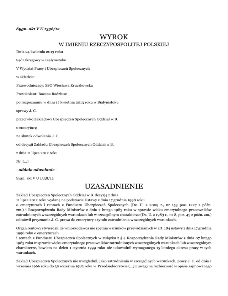 Sygn. akt V U 1338/12 WYROK W IMIENIU RZECZYPOSPOLITEJ POLSKIEJ Dnia 24 kwietnia 2013 roku Sąd Okręgowy w Białymstoku V Wydział Pracy i Ubezpieczeń Społecznych w składzie: Przewodniczący: SSO Wiesława Kruczkowska Protokolant: Bożena Radziusz po rozpoznaniu w dniu 17 kwietnia 2013 roku w Białymstoku sprawy J. C. przeciwko Zakładowi Ubezpieczeń Społecznych Oddział w B. o emeryturę na skutek odwołania J. C. od decyzji Zakładu Ubezpieczeń Społecznych Oddział w B. z dnia 11 lipca 2012 roku Nr (...) - oddala odwołanie Sygn. akt V U 1338/12 UZASADNIENIE Zakład Ubezpieczeń Społecznych Oddział w B. decyzją z dnia 11 lipca 2012 roku wydaną na podstawie Ustawy z dnia 17 grudnia 1998 roku o emeryturach i rentach z Funduszu Ubezpieczeń Społecznych (Dz. U. z 2009 r., nr 153 poz. 1227 z późn. zm.) i Rozporządzenia Rady Ministrów z dnia 7 lutego 1983 roku w sprawie wieku emerytalnego pracowników zatrudnionych w szczególnych warunkach lub w szczególnym charakterze (Dz. U. z 1983 r., nr 8, poz. 43 z późn. zm.) odmówił przyznania J. C. prawa do emerytury z tytułu zatrudnienia w szczególnych warunkach. Organ rentowy stwierdził, że wnioskodawca nie spełnia warunków przewidzianych w art. 184 ustawy z dnia 17 grudnia 1998 roku o emeryturach i rentach z Funduszu Ubezpieczeń Społecznych w związku z § 4 Rozporządzenia Rady Ministrów z dnia 07 lutego 1983 roku w sprawie wieku emerytalnego pracowników zatrudnionych w szczególnych warunkach lub w szczególnym charakterze, bowiem na dzień 1 stycznia 1999 roku nie udowodnił wymaganego 15-letniego okresu pracy w tych warunkach. Zakład Ubezpieczeń Społecznych nie uwzględnił, jako zatrudnienia w szczególnych warunkach, pracy J. C. od dnia 1 września 1966 roku do 30 września 1982 roku w Przedsiębiorstwie (...) z uwagi na rozbieżność w opisie zajmowanego stanowiska, bowiem w świadectwie pracy w warunkach szczególnych widnieje zapis – mechanik napraw pojazdów mechanicznych, zaś w świadectwie pracy ogólnym – monter samochodowy. Organ rentowy wskazał, że charakter pracy podany w świadectwie wykonywania pracy w warunkach szczególnych nie jest zgodny z Rozporządzeniem Rady Ministrów, a stanowisko nie jest zgodne z zarządzeniem resortowym przytoczonym przez zakład pracy, a ponadto brak jest informacji, czy w powyższym okresie przedmiotowa praca była wykonywana w kanałach remontowych. Również istnieje rozbieżność pomiędzy kwestionariuszem złożonym wraz z wnioskiem o rentę z tytułu niezdolności do pracy z 1993 roku, w którym odwołujący, jako zatrudnienie w powyższym okresie wskazał – instruktora nauki zawodu. Organ rentowy na podstawie dołączonych do wniosku dokumentów oraz w wyniku przeprowadzonego postępowania za udowodnione na dzień 1 stycznia 1999 roku okresy przyjął staż sumaryczny 27 lat, 3 miesięcy i 20 dni. Odwołanie od powyższej decyzji złożył pełnomocnik J. C., który zaskarżył decyzję w całości i zarzucił jej niezasadne nieuwzględnienie okresu zatrudnienia skarżącego od 01.09.1966r. do 30.09.1982 r. w Przedsiębiorstwie (...), jako zatrudnienia w warunkach szczególnych. Następnie pełnomocnik wniósł o uznanie okresu zatrudnienia J. C. od 01.10.1982r. do 31.01.1985 r. w Gminnej Spółdzielni (...) w J. – miejsce pracy Młyn w B., ul. (...), obecnie ulica pod Krzywą, w charakterze robotnika młynu – młynarza, jako zatrudnienia w warunkach szczególnych, zgodnie z wykazem A dział X pkt. 10 „prace przy wytwarzaniu mąki, płatków i śruty” do Rozporządzenia Rady Ministrów z dnia 7 lutego 1983 roku w sprawie wieku emerytalnego pracowników zatrudnionych w szczególnych warunkach lub w szczególnym charakterze (Dz. U. z 1983 r., nr 8, poz. 43 z późn. zm.). Wskazując na powyższe pełnomocnik odwołującego wniósł o zmianę zaskarżonej decyzji i przyznanie J. C. prawa do emerytury zgodnie z wnioskiem z dnia 14 maja 2012 roku. Zakład Ubezpieczeń Społecznych Oddział w B. w odpowiedzi na odwołanie pełnomocnika J. C. wniósł o jego oddalenie, podtrzymał argumentację zawartą w zaskarżonej decyzji i ponownie wskazał na nieudokumentowanie przez wnioskodawcę piętnastoletniego okresu zatrudnienia w szczególnych warunkach, z uwagi na niezgodność opisu zajmowanego stanowiska z wykazem resortowym. Sąd Okręgowy ustalił i zważył, co następuje: Odwołanie nie zasługiwało na uwzględnienie, dlatego podlegało oddaleniu. Zgodnie z art. 184 powołanej na wstępie ustawy z dnia 17 grudnia 1998 roku o emeryturach i rentach z Funduszu Ubezpieczeń Społecznych w związku z § 4 powołanego na wstępie Rozporządzenia Rady Ministrów z dnia 7 lutego 1983 r. ubezpieczonym urodzonym po dniu 31 grudnia 1948 roku przysługuje emerytura po osiągnięciu wieku przewidzianego w art. 32, 33, 39 i 40, jeżeli w dniu wejścia w życie ustawy osiągnęli okres zatrudnienia w szczególnych warunkach lub w szczególnym charakterze wymaganym w przepisach dotychczasowych do nabycia prawa do emerytury w wieku niższym niż 60 lat – dla kobiet i 65 lat – dla mężczyzn wynoszący 15 lat oraz okres składkowy i nieskładkowy, o którym mowa w art. 27 – 20 lat dla kobiet, 25 lat dla mężczyzn. Emerytura przysługuje pod warunkiem nieprzystąpienia do otwartego funduszu emerytalnego albo złożenia wniosku o przekazanie środków zgromadzonych na rachunku w otwartym funduszu emerytalnym, za pośrednictwem Zakładu, na dochody budżetu państwa. Natomiast art. 32 ust. 2 wyżej wymienionej ustawy stanowi, że dla celów ustalenia uprawnień, o których mowa w ustępie 1, za pracowników zatrudnionych w szczególnych warunkach uważa się pracowników zatrudnionych przy pracach o znacznej szkodliwości dla zdrowia oraz o znacznym stopniu uciążliwości lub wymagających wysokiej sprawności psychofizycznej ze względu na bezpieczeństwo własne lub otoczenia. W tym też zakresie należy stosować przepisy Rozporządzenia Rady Ministró
