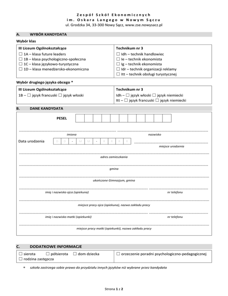 Zespół Szkół Ekonomicznych im. Oskara Langego w Nowym Sączu ul. Grodzka 34, 33-300 Nowy Sącz, www.zse.nowysacz.pl A. WYBÓR KANDYDATA Wybór klas III Liceum Ogólnokształcące Technikum nr 3 ☐ 1A – klasa future leaders ☐ 1B – klasa psychologiczno-społeczna ☐ 1C – klasa językowo-turystyczna ☐ 1D – klasa menedżersko-ekonomiczna ☐ Idh – technik handlowiec ☐ Ie – technik ekonomista ☐ Ig – technik ekonomista ☐ Idr – technik organizacji reklamy ☐ Itt – technik obsługi turystycznej Wybór drugiego języka obcego * III Liceum Ogólnokształcące Technikum nr 3 1B – ☐ język francuski ☐ język włoski Idh – ☐ język włoski ☐ język niemiecki Itt – ☐ język francuski ☐ język niemiecki B. DANE KANDYDATA PESEL ............................................................................................ ...................................................................................... imiona Data urodzenia D D - nazwisko M M - R R R R ...................................................................... miejsce urodzenia .................................................................................................................................................................................... adres zamieszkania ................................................................................................................................................................................... gmina .................................................................................................................................................................................... ukończone Gimnazjum, gmina .......................................................................................................................... ........................................................ imię i nazwisko ojca (opiekuna) nr telefonu .................................................................................................................................................................................... miejsce pracy ojca (opiekuna), nazwa zakładu pracy .......................................................................................................................... ........................................................ imię i nazwisko matki (opiekunki) nr telefonu .................................................................................................................................................................................... miejsce pracy matki (opiekunki), nazwa zakładu pracy C. DODATKOWE INFORMACJE ☐ sierota ☐ półsierota ☐ rodzina zastępcza ☐ dom dziecka ☐ orzeczenie poradni psychologiczno-pedagogicznej szkoła zastrzega sobie prawo do przydziału innych języków niż wybrane przez kandydata Strona 1 z 2 Zespół Szkół Ekonomicznych im. Oskara Langego w Nowym Sączu ul. Grodzka 34, 33-300 Nowy Sącz, www.zse.nowysacz.pl D. OŚWIADCZENIA ............................................................................................ ...................................................................................... imiona kandydata nazwisko kandydata Oświadczenie dotyczące treści zgłoszenia Zgodnie z art. 20 t ust. 6 ustawy z dnia 7 września 1991 r. o systemie oświaty (Dz. U. z 2004 r. Nr 256, poz. 2572, ze zm.) oświadcza, że powyższe dane są zgodne ze stanem faktycznym. Jestem świadomy/a odpowiedzialności karnej za złożenie fałszywego zeznania. ........................................................ podpis rodzica/opiekuna prawnego Oświadczenie o zasadach rekrutacji Oświadczam, że zapoznałem/am się z zasadami rekrutacji do szkoły. ........................................................ podpis rodzica/opiekuna prawnego Oświadczenie dotyczące rozszerzeń przedmiotów Pozytywnie opiniuję rozszerzenia w wybranych przeze mnie klasach. ........................................................ ........................................................ podpis kandydata podpis rodzica/opiekuna prawnego Oświadczenie dotyczące danych osobowych, wizerunku i procesu kształcenia Wyrażam zgodę na przetwarzanie danych osobowych zgodnie z ustawą z dnia 29.08.1997 r. o ochronie danych osobowych (Dz. U. nr 133, poz. 883 z późniejszymi zmianami) dla celów: rekrutacji, procesu kształcenia, projektu EduS@cz, Systemu Informacji Oświatowej oraz bezpłatną publikację wizerunku na terenie szkoły i stronie internetowej w związku z przebiegiem nauczania w Zespole Szkół Ekonomicznych. ........................................................ podpis rodzica/opiekuna prawnego Oświadczenie dotyczące doraźnie zmiany podziału godzin Wyrażam zgodę na doraźne zmiany podziału godzin wynikające z nieobecności nauczyciela oraz zmiany organizacji pracy szkoły. Oświadczenie obowiązuje w okresie nauki w szkole. ........................................................ podpis rodzica/opiekuna prawnego Oświadczenie dotyczące chęci uczestnictwa w lekcjach religii/etyki Wyrażam chęć uczestnictwa dziecka w lekcji religii/etyki*. Oświadczenie obowiązuje w okresie nauki w szkole, może zostać zmienione po złożeniu pisemnego oświadczenia. . ........................................................ podpis rodzica/opiekuna prawnego Oświadczenie rodziców/opiekunów prawnych (wypełniają tylko te osoby, które nie deklarują chęci uczestnictwa w zajęciach religii/etyki) W związku z brakiem chęci uczestnictwa w zajęciach z religii, etyki proszę o zwalnianie mojego syna/córki z obecności w szkole w czasie tych lekcji, jeżeli przypadają na ostatnie lub pierwsze godziny w planie. Biorę pełną odpowiedzialność za moje dziecko w tym czasie. W przypadku gdy w/w zajęcia odbywać się będą pomiędzy innymi zajęciami moje dziecko będzie pod opieką bibliotekarza. Oświadczenie obowiązuje w okresie nauki w szkole. ...................................................