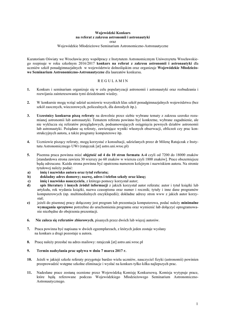 Wojewódzki Konkurs na referat z zakresu astronomii i astronautyki oraz Wojewódzkie Młodzieżowe Seminarium Astronomiczno-Astronautyczne Kuratorium Oświaty we Wrocławiu przy współpracy z Instytutem Astronomicznym Uniwersytetu Wrocławskiego rozpisuje w roku szkolnym 2016/2017 konkurs na referat z zakresu astronomii i astronautyki dla uczniów szkół ponadgimnazjalnych w województwie dolnośląskim oraz organizuje Wojewódzkie Młodzieżowe Seminarium Astronomiczno-Astronautyczne dla laureatów konkursu. REGULAMIN 1. Konkurs i seminarium organizuje się w celu popularyzacji astronomii i astronautyki oraz rozbudzania i rozwijania zainteresowania tymi dziedzinami wiedzy. 2. W konkursie mogą wziąć udział uczniowie wszystkich klas szkół ponadgimnazjalnych województwa (bez szkół zaocznych, wieczorowych, policealnych, dla dorosłych itp.). 3. Uczestnicy konkursu piszą referaty na dowolnie przez siebie wybrane tematy z zakresu szeroko rozumianej astronomii lub astronautyki. Tematem referatu powinno być konkretne, wybrane zagadnienie, ale nie wyklucza się referatów przeglądowych, podsumowujących osiągnięcia pewnych działów astronomii lub astronautyki. Pożądane są referaty, zawierające wyniki własnych obserwacji, obliczeń czy prac konstrukcyjnych autora, a także programy komputerowe itp. 4. Uczniowie piszący referaty, mogą korzystać z konsultacji, udzielanych przez dr Milenę Ratajczak z Instytutu Astronomicznego UWr (ratajczak [at] astro.uni.wroc.pl) 5. Pisemna praca powinna mieć objętość od 4 do 10 stron formatu A-4 czyli od 7200 do 18000 znaków [standardowa strona zawiera 30 wierszy po 60 znaków w wierszu czyli 1800 znaków]. Prace obszerniejsze będą odrzucane. Każda strona powinna być opatrzona numerem kolejnym i nazwiskiem autora. Na stronie tytułowej należy podać: imię i nazwisko autora oraz tytuł referatu; dokładny adres domowy; nazwę, adres i telefon szkoły oraz klasę; imię i nazwisko nauczyciela, z którego pomocy korzystał autor; spis literatury i innych źródeł informacji z jakich korzystał autor referatu: autor i tytuł książki lub artykułu, rok wydania książki, nazwa czasopisma oraz numer i rocznik; tytuły i inne dane programów komputerowych (np. multimedialnych encyklopedii); dokładne adresy stron www z jakich autor korzystał; jeżeli do pisemnej pracy dołączony jest program lub prezentacja komputerowa, podać należy minimalne wymagania sprzętowe potrzebne do uruchomienia programu oraz wymienić lub dołączyć oprogramowanie niezbędne do obejrzenia prezentacji. a) b) c) d) e) 6. Nie zaleca się referatów zbiorowych, pisanych przez dwóch lub więcej autorów. 7. Praca powinna być napisana w dwóch egzemplarzach, z których jeden zostaje wysłany na konkurs a drugi pozostaje u autora. 8. Pracę należy przesłać na adres mailowy: ratajczak [at] astro.uni.wroc.pl 9. Termin nadsyłania prac upływa w dniu 7 marca 2017 r. 10. Jeżeli w jakiejś szkole referaty przygotuje bardzo wielu uczniów, nauczyciel fizyki (astronomii) powinien przeprowadzić wstępne szkolne eliminacje i wysłać na konkurs tylko kilka najlepszych prac. 11. Nadesłane prace zostaną ocenione przez Wojewódzką Komisję Konkursową. Komisja wytypuje prace, które będą referowane podczas Wojewódzkiego Młodzieżowego Seminarium AstronomicznoAstronautycznego. 1 12. Termin i miejsce wojewódzkiego seminarium: 15 lub 16 marca 2017 r. w Instytucie Astronomicznym UWr przy ul. Kopernika 11 we Wrocławiu (szczegóły zostaną wysłane pocztą elektroniczną do uczestników). Prócz uczniów referujących swoje prace, na seminarium zostaną zaproszeni pozostali uczestnicy konkursu. 13. Referat - wygłaszany podczas seminarium - powinien być przygotowany w oparciu o pozostawiony sobie egzemplarz pracy i nie może trwać dłużej niż 15 minut. 14. Do dyspozycji referujących będą: tablica, komputer, rzutnik. 15. Oceniając referaty, Komisja będzie brać pod uwagę: a) b) c) wartość merytoryczną pracy pisemnej oraz wygłoszonego referatu, sposób referowania, poziom wyjaśnień, udzielanych podczas dyskusji. 16. Autorzy najlepszych referatów wezmą udział w Ogólnopolskim Młodzieżowym Seminarium Astronomiczno-Astronautycznym w Grudziądzu, które odbędzie się w dniach 23-25 marca 2017 r. 17. Dodatkowe informacje na temat konkursu i seminarium uzyskać można u dr Mileny Ratajczak (ratajczak [at] astro.uni.wroc.pl). 2