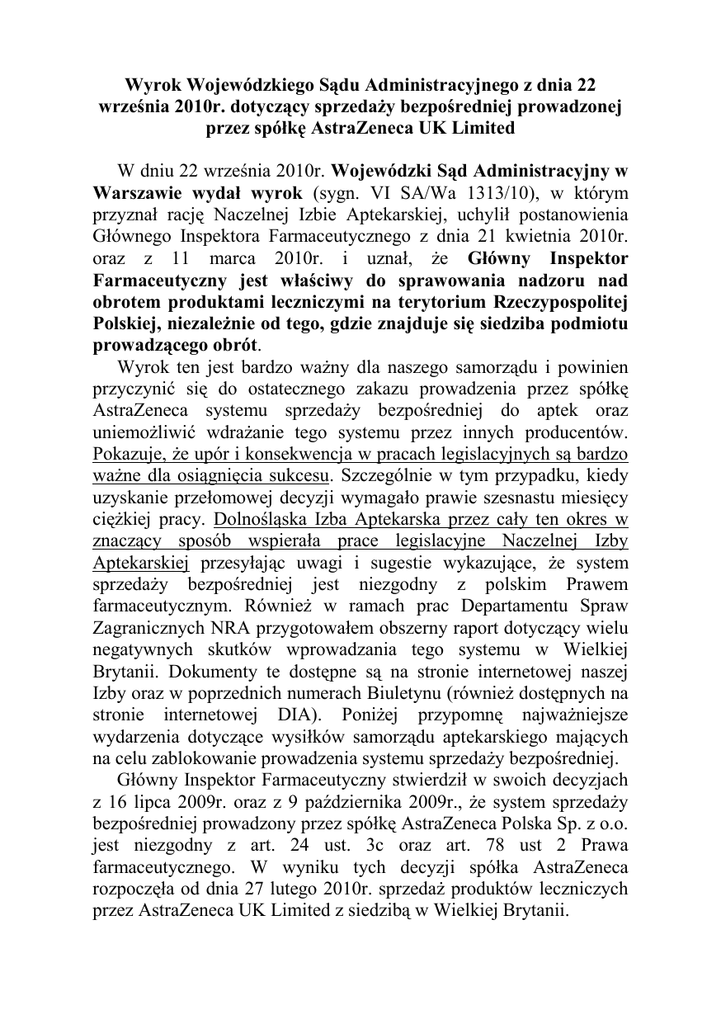 Wyrok Wojewódzkiego Sądu Administracyjnego z dnia 22 września 2010r. dotyczący sprzedaży bezpośredniej prowadzonej przez spółkę AstraZeneca UK Limited W dniu 22 września 2010r. Wojewódzki Sąd Administracyjny w Warszawie wydał wyrok (sygn. VI SA/Wa 1313/10), w którym przyznał rację Naczelnej Izbie Aptekarskiej, uchylił postanowienia Głównego Inspektora Farmaceutycznego z dnia 21 kwietnia 2010r. oraz z 11 marca 2010r. i uznał, że Główny Inspektor Farmaceutyczny jest właściwy do sprawowania nadzoru nad obrotem produktami leczniczymi na terytorium Rzeczypospolitej Polskiej, niezależnie od tego, gdzie znajduje się siedziba podmiotu prowadzącego obrót. Wyrok ten jest bardzo ważny dla naszego samorządu i powinien przyczynić się do ostatecznego zakazu prowadzenia przez spółkę AstraZeneca systemu sprzedaży bezpośredniej do aptek oraz uniemożliwić wdrażanie tego systemu przez innych producentów. Pokazuje, że upór i konsekwencja w pracach legislacyjnych są bardzo ważne dla osiągnięcia sukcesu. Szczególnie w tym przypadku, kiedy uzyskanie przełomowej decyzji wymagało prawie szesnastu miesięcy ciężkiej pracy. Dolnośląska Izba Aptekarska przez cały ten okres w znaczący sposób wspierała prace legislacyjne Naczelnej Izby Aptekarskiej przesyłając uwagi i sugestie wykazujące, że system sprzedaży bezpośredniej jest niezgodny z polskim Prawem farmaceutycznym. Również w ramach prac Departamentu Spraw Zagranicznych NRA przygotowałem obszerny raport dotyczący wielu negatywnych skutków wprowadzania tego systemu w Wielkiej Brytanii. Dokumenty te dostępne są na stronie internetowej naszej Izby oraz w poprzednich numerach Biuletynu (również dostępnych na stronie internetowej DIA). Poniżej przypomnę najważniejsze wydarzenia dotyczące wysiłków samorządu aptekarskiego mających na celu zablokowanie prowadzenia systemu sprzedaży bezpośredniej. Główny Inspektor Farmaceutyczny stwierdził w swoich decyzjach z 16 lipca 2009r. oraz z 9 października 2009r., że system sprzedaży bezpośredniej prowadzony przez spółkę AstraZeneca Polska Sp. z o.o. jest niezgodny z art. 24 ust. 3c oraz art. 78 ust 2 Prawa farmaceutycznego. W wyniku tych decyzji spółka AstraZeneca rozpoczęła od dnia 27 lutego 2010r. sprzedaż produktów leczniczych przez AstraZeneca UK Limited z siedzibą w Wielkiej Brytanii. W dniu 2 marca 2010r. Naczelna Izba Aptekarska zwróciła się do GIF o zbadanie, czy postępowanie firmy AstraZeneca UK Limited w zakresie obrotu hurtowego produktami leczniczymi odbywa się zgodnie z przepisami ustawy Prawo farmaceutyczne. Główny Inspektor Farmaceutyczny wydał w dniu 11 marca 2010r. postanowienie w którym uznał się za organ niewłaściwy w sprawie, stwierdzając równocześnie, że w oparciu o treść złożonego wniosku nie jest w stanie określić, jaki organ jest właściwy. GIF stwierdził, że „wypadek udzielenia zezwolenia na prowadzenie hurtowni farmaceutycznej poza granicami kraju oraz ocena zgodności obrotu hurtowego przez taki podmiot z przepisami ustawy Prawo farmaceutyczne oraz dopełniającymi je aktami wykonawczymi nie jest przewidziana przepisami ustawy z dnia 6 września 2001r. lub innego aktu wykonawczego”. Ta niezrozumiała dla samorządu aptekarskiego decyzja GIF została podtrzymana w dniu 21 kwietnia 2010r. W związku z powyższymi decyzjami Naczelna Izba Aptekarska złożyła w dniu 26 maja 2010r. skargę do Wojewódzkiego Sądu Administracyjnego w Warszawie i zaskarżyła w całości postanowienia GIF z 11 marca 2010r. oraz 21 kwietnia 2010r. Po prawie czterech miesiącach oczekiwania Wojewódzki Sąd Administracyjny przyznał rację samorządowi aptekarskiemu stwierdzając, że właśnie Główny Inspektor Farmaceutyczny jest właściwy w sprawie zbadania zgodności z prawem postępowania spółki AstraZeneca UK Limited i w szczególności ustalenia, czy prowadzenie przez ten podmiot obrotu hurtowego produktami leczniczymi odbywa się zgodnie z przepisami ustawy Prawo farmaceutyczne. Piotr Bohater