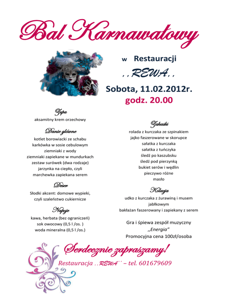 Bal Karnawalowy w Restauracji ,,REWA,, Sobota, 11.02.2012r. godz. 20.00 Zupa aksamitny krem orzechowy Danie glówne kotlet borowiacki ze schabu karkówka w sosie cebulowym ziemniaki z wody ziemniaki zapiekane w mundurkach zestaw surówek (dwa rodzaje) jarzynka na ciepło, czyli marchewka zapiekana serem Deser Słodki akcent: domowe wypieki, czyli szaleostwo cukiernicze Napoje kawa, herbata (bez ograniczeo) sok owocowy (0,5 l /os. ) woda mineralna (0,5 l /os.) Zakaski rolada z kurczaka ze szpinakiem jajko faszerowane w skorupce sałatka z kurczaka sałatka z tuoczyka śledź po kaszubsku śledź pod pierzynką bukiet serów i wędlin pieczywo różne masło Kolacja udko z kurczaka z żurawiną i musem jabłkowym bakłażan faszerowany i zapiekany z serem Gra i śpiewa zespół muzyczny ,,Energia’’ Promocyjna cena 100zł/osoba Serdecznie zapraszamy! Restauracja ,,REWA’’ – tel. 601679609