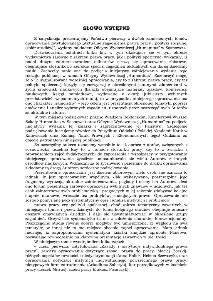 SŁOWO WSTĘPNE Z satysfakcją prezentujemy Państwu pierwszy z dwóch zamierzonych tomów opracowania zatytułowanego „Aktualne zagadnienia prawa pracy i polityki socjalnej (zbiór studiów)”, wydany nakładem Oficyny Wydawniczej „Humanitas” w Sosnowcu. Doświadczenia ostatnich kilku lat, w tym ukazujące się w tym okresie wydawnictwa zarówno z zakresu prawa pracy, jak i polityki społecznej wykazały, iż nadal dużym zainteresowaniem odbiorców cieszą się opracowania zbiorowe, obejmujące stosunkowo szerokie spectra zagadnień aktualnych dla danej dziedziny nauki. Zachęciły mnie one do podjęcia inicjatywy zainicjowania wydania tego rodzaju publikacji w ramach Oficyny Wydawniczej „Humanitas”. Zaznaczyć mogę, że o ile sygnalizowane wcześniej opracowania, czy to z zakresu prawa pracy, czy też polityki społecznej łączyły się zazwyczaj z określonymi istotnymi zdarzeniami w życiu środowisk naukowych (książki obejmujące materiały zjazdów, konferencji naukowych, księgi pamiątkowe, wydawane z okazji jubileuszy wybitnych przedstawicieli wspomnianych nauk), to w przypadku niniejszego opracowania ma ono charakter „samoistny” – jego celem jest prezentacja określonej tematyki poprzez omówienie i analizę wybranych zagadnień, uznanych przez poszczególnych Autorów za aktualne i istotne. W tym miejscu podziękować pragnę Władzom Rektorskim, Kanclerzowi Wyższej Szkoły Humanitas w Sosnowcu oraz Oficynie Wydawniczej „Humanitas” za podjęcie inicjatywy wydania tej książki i zaprezentowanie jej Państwu. Szczególne podziękowania kierujemy również do Prezydium Oddziału Polskiej Akademii Nauk w Katowicach oraz Komisji Nauk Prawnych i Ekonomicznych tegoż Oddziału za objęcie patronatem niniejszej publikacji. Za szczególny sukces uznajemy wspólnie to, iż oprócz Autorów, związanych z sosnowiecką uczelnią (czy to w ramach stosunku pracy, czy to w związku z prowadzeniem zajęć dydaktycznych) do zaproszenia i współpracy w przygotowaniu niniejszego opracowania życzliwie ustosunkowało się wielu Autorów z innych ośrodków naukowych. Wdzięczni za tę życzliwość i przesłane do druku opracowania składamy tą drogą Autorom serdeczne podziękowania. Prezentowane opracowanie jest dziełem zbiorowym wielu osób: nie oznacza to jednak, iż jest opracowaniem wspólnym. Jak wskazywano, poszczególne jego fragmenty wyrażają aktualne zainteresowania, poglądy i oceny ich Autorów. Jest ono forum prezentacji zarówno opracowań wybitnych znawców – uczonych, jak też osób zainteresowanych problematyką i pragnących w jej zakresie zdobywać kolejne stopnie naukowe, wreszcie też praktyków, stosujących prawo. Opracowanie nie zostało pomyślane jako systematyczny opis i analiza instytucji i problemów prawa pracy czy polityki społecznej, choć zakres tematyczny zawartych w niniejszym tomie i przewidzianych do tomu kolejnego studiów obejmuje znaczne obszary omawianych dziedzin i daje się usystematyzować w określone grupy zagadnień. Oczywiście systematyka ta ma z założenia charakter konwencjonalny. Poszczególne studia równie dobrze mogłyby być umieszczone, ze względu na swą tematykę, w innej niż to ma miejsce obecnie części opracowania. Mam jednak nadzieję, iż zaproponowana systematyka książki znajdzie aprobatę Państwa, pozwalając równocześnie na klarowną prezentację zawartych w niej treści. W niniejszym tomie wyodrębniłem kilka części: – część pierwsza, zatytułowana „Zasady i instytucje indywidualnego prawa pracy”, zawiera opracowania dotyczące zasad: prawa do pracy (Maciej Borski), różnych aspektów równości i niedyskryminacji (Anna Kalisz, Helena Szewczyk), oraz opracowania dotyczące instytucji indywidualnego powszechnego prawa pracy: nietypowych form zatrudnienia (Arkadiusz Sobczyk), kar porządkowych w kodeksie pracy (Leszek Mitrus), czasu pracy (Łukasz Pisarczyk); – część druga, zatytułowana „Pragmatyczne stosunki zatrudnienia”, zawiera porównanie stosunków pracy w samorządzie i służbie cywilnej (Anna Dubowik), zakresu podmiotowego tej służby (Bogusław Przywora), opracowanie dotyczące wygaśnięcia stosunku pracy nauczycieli akademickich (Mariusz Lekston), ograniczeń aktywności zawodowej sekretarzy jednostek samorządu terytorialnego (Magdalena Gurdek), oraz odpowiedzialności pracowniczej pracowników samorządowych (Bolesław Maciej Ćwiertniak) i odpowiedzialności funkcjonariuszy publicznych za rażące naruszenie prawa (Grzegorz Krawiec); – część trzecia, zatytułowana „Z zagadnień zbiorowego prawa pracy”, obejmuje sześć opracowań dotyczących odpowiednio: zakresu podmiotowego tego prawa (Krzysztof W. Baran), norm kolizyjnych zbiorowego prawa pracy (Andrzej Marian Świątkowski), uprawnienia sędziów sądów powszechnych do zrzeszania się (Przemysław Koral), ponadzakładowych układów zbiorowych pracy (Krzysztof Walczak), obowiązków informacyjnych pracodawcy i związków zawodowych (Jakub Stelina), pozycji prawnej Państwowej Inspekcji Pracy w sporach zbiorowych (Janusz Żołyński); – część czwarta pracy „Z zagadnień polityki społecznej” obejmuje opracowania dotyczące wyzwań i nowych paradygmatów w polityce społecznej (Mirosław Grewiński), oceny koncepcji społecznej odpowiedzialności biznesu (Andrzej Barczyński), umowy jako formy współudziału organu z adresatem na przykładzie pomocy społecznej (Stanisław Nitecki). Książkę zamyka fragment zatytułowany „Z kart historii…”, obejmujący refleksję nad administrowaniem pracą przymusową w Rosji Radzieckiej i ZSRR (Adam Lityński). Całość planowanego opracowania kierowana jest do osób zajmujących się naukowo wspomnianymi dziedzinami, praktyków i innych osób zainteresowanych omawianymi w nim zagadnieniami, przydatna być może również dla seminarzystów (studiów doktoranckich, magisterskich, licencjackich na różnych kierunkach, na których wy
