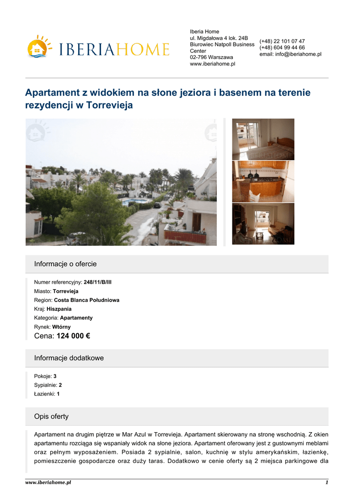 Iberia Home ul. Migdałowa 4 lok. 24B (+48) 22 101 07 47 Biurowiec Natpoll Business (+48) 604 99 44 66 Center email: [email protected] 02-796 Warszawa www.iberiahome.pl Apartament z widokiem na słone jeziora i basenem na terenie rezydencji w Torrevieja Informacje o ofercie Numer referencyjny: 248/11/B/III Miasto: Torrevieja Region: Costa Blanca Południowa Kraj: Hiszpania Kategoria: Apartamenty Rynek: Wtórny Cena: 124 000 € Informacje dodatkowe Pokoje: 3 Sypialnie: 2 Łazienki: 1 Opis oferty Apartament na drugim piętrze w Mar Azul w Torrevieja. Apartament skierowany na stronę wschodnią. Z okien apartamentu rozciąga się wspaniały widok na słone jeziora. Apartament oferowany jest z gustownymi meblami oraz pełnym wyposażeniem. Posiada 2 sypialnie, salon, kuchnię w stylu amerykańskim, łazienkę, pomieszczenie gospodarcze oraz duży taras. Dodatkowo w cenie oferty są 2 miejsca parkingowe dla www.iberiahome.pl 1 samochodów przynależące do apartamentu. Na terenie rezydencji znajduje się basen dostępny dla właścicieli nieruchomości oraz ich gości. Rezydencja jest zamknięta dla postronnych osób. Lokalizacja apartamentu zapewnia szybkie dotarcie do plaży. Natomiast w pobliżu rezydencji wszelkie udogodnienia ułatwiające pobyt w miejscowości turystycznej (sklepy, banki, restauracje, kawiarnie). Informacje o miejscowości Torrevieja: Torrevieja Costa Blanca Pozostałe nieruchomości w Torrevieja: Torrevieja nieruchomości Udogodnienia ● Basen wspólnoty ● Taras ● Miejsce parkingowe ● Umeblowany www.iberiahome.pl 2