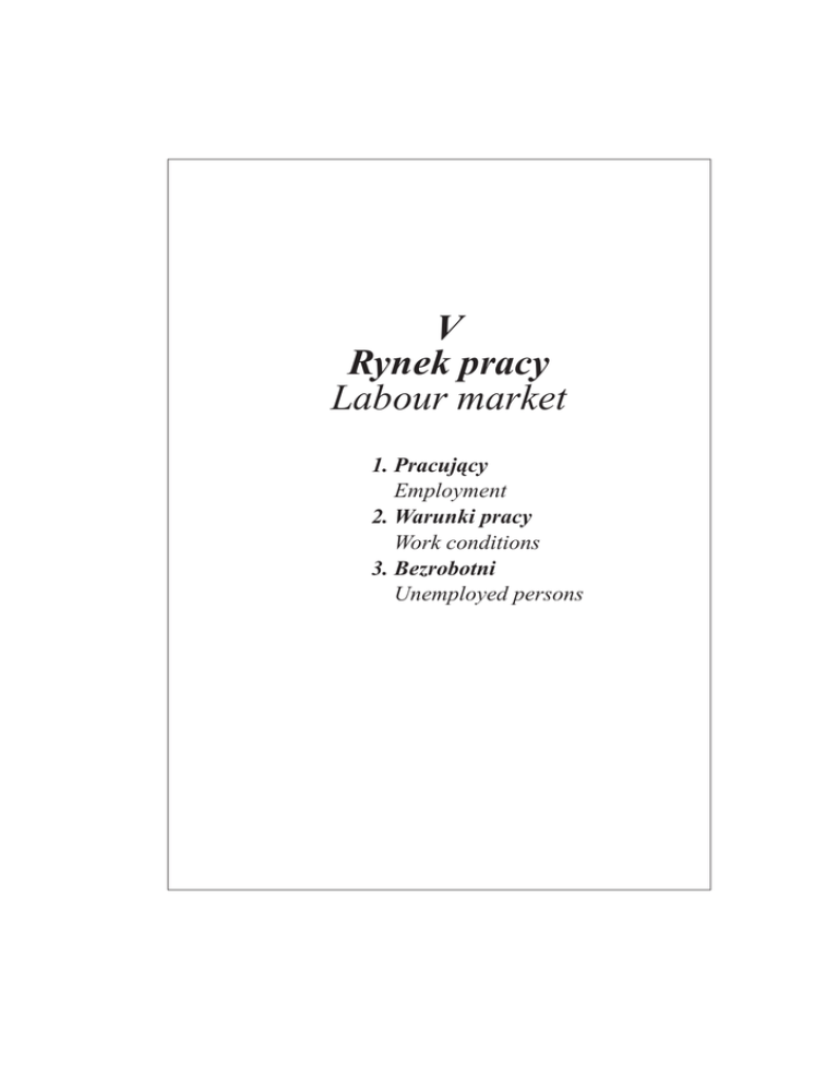 V Rynek pracy Labour market 1. Pracuj¹cy Employment 2. Warunki pracy Work conditions 3. Bezrobotni Unemployed persons Uwagi ogólne General notes 1. Dane o pracuj¹cych dotycz¹ osób wykonuj¹cych pracê przynosz¹c¹ im zarobek lub dochód; do pracuj¹cych zalicza siê: 1) osoby zatrudnione na podstawie stosunku pracy (umowa o pracê, powo³anie, mianowanie, wybór lub stosunek s³u¿bowy); 2) pracodawców i pracuj¹cych na w³asny rachunek, a mianowicie: a) w³aœcicieli i wspó³w³aœcicieli (³¹cznie z pomagaj¹cymi cz³onkami ich rodzin; z wy³¹czeniem wspólników spó³ek, którzy nie pracuj¹ w spó³ce) podmiotów prowadz¹cych dzia³alnoœæ gospodarcz¹ poza gospodarstwami indywidualnymi w rolnictwie, b) inne osoby pracuj¹ce na w³asny rachunek, np. osoby wykonuj¹ce wolne zawody; 3) osoby wykonuj¹ce pracê nak³adcz¹; 4) agentów (³¹cznie z pomagaj¹cymi cz³onkami ich rodzin oraz osobami zatrudnionymi przez agentów); 5) cz³onków spó³dzielni produkcji rolniczej (rolniczych spó³dzielni produkcyjnych i spó³dzielni powsta³ych na ich bazie oraz spó³dzielni kó³ek rolniczych); Do osób wykonuj¹cych pracê nak³adcz¹ zalicza siê osoby, z którymi zawarto umowê na wykonywanie okreœlonych czynnoœci na rzecz jednostki zlecaj¹cej pracê poza jej terenem. Do agentów zaliczono osoby, z którymi zawarto umowê agencyjn¹ lub umowê na warunkach umowy zlecenia o prowadzenie placówek, których przedmiot dzia³alnoœci zosta³ okreœlony w umowach. Pe³nozatrudnieni s¹ to osoby zatrudnione w pe³nym wymiarze czasu pracy obowi¹zuj¹cym w danym zak³adzie pracy lub na danym stanowisku pracy, w tym równie¿ osoby, które zgodnie z obowi¹zuj¹cymi przepisami pracuj¹ w skróconym czasie pracy, np. z tytu³u warunków szkodliwych dla zdrowia lub przed³u¿onym czasie pracy, np. dozorcy mienia; niepe³nozatrudnieni s¹ to osoby, które zgodnie z umow¹ o pracê pracuj¹ stale w niepe³nym wymiarze czasu pracy. Niepe³nozatrudnieni w g³ównym miejscu pracy s¹ to osoby, które oœwiadczy³y, ¿e dany zak³ad jest ich g³ównym miejscem pracy Dane dotycz¹ce pracuj¹cych wed³ug stanu w dniu 31 XII podano bez przeliczenia niepe³nozatrudnionych na pe³nozatrudnionych przy przyjêciu zasady jednorazowego ujmowania tych osób w g³ównym miejscu pracy. Dane prezentowane s¹ w tablicach wed³ug faktycznego (sta³ego) miejsca pracy pracownika i równie¿ rodzaju dzia³alnoœci. 1. Data regarding employment concern persons performing work providing earnings or income and include: 1) employees hired on the basis of an employment contract (labour contract, posting, appointment, election or service relation); 2) employers and own-account workers, i.e.: a) owners and co-owners (including contributing family workers; excluding partners in companies who do not work in them) of entities conducting economic activity excluding private farms in agriculture, b) other self-employed persons, e.g., persons practising learned professions; 3) outworkers; 4) agents (including contributing family workers and persons employed by agents); 5) members of agricultural production cooperatives (agricultural producers cooperatives and cooperatives established on their basis as well as agricultural farmers cooperatives); Outworkers are persons who are bound by a contract defining the scope of activity to be performed for the entity providing the work and which is performed outside its facilities. Agents are persons who are bound by agency agreements or by order agreements for managing entities, the scope of activity of which is described in the agreement. Full-time paid employees are employed persons on a full-time basis, as defined by a given company or for a given position, as well as persons who, in accordance with regulations, work a shortened work-time period, e.g. due to hazardous conditions, or a longer work-time period, e.g. property caretaker. Part-time paid employees are persons who, in accordance with labour contracts, regularly work on a part-time basis. Part-time paid employees in the main workplace are persons who declared that the given workplace is their main workplace. Data concerning employment as of 31 XII are presented without converting part–time paid employees into full–time paid employees, each person being listed once according to the main job. Data regarding employment are presented by actual (permanent) place of work of employed person and kind of activity. Rynek pracy Dane o pracuj¹cych nie obejmuj¹: fundacji, stowarzyszeñ, partii politycznych, zwi¹zków zawodowych, organizacji spo³ecznych, organizacji pracodawców, samorz¹du gospodarczego i zawodowego, rolników indywidualnych, duchownych, jednostek bud¿etowych prowadz¹cych dzia³alnoœæ w zakresie obrony narodowej i bezpieczeñstwa publicznego oraz podmiotów gospodarczych o liczbie pracuj¹cych do 9 osób. 2. Warunki pracy jest to zespó³ czynników wystêpuj¹cych w œrodowisku pracy wynikaj¹cych z procesu pracy oraz czynników zwi¹zanych z wykonywaniem pracy. Informacje o zatrudnionych w warunkach zagro¿enia czynnikami szkodliwymi dla zdrowia opracowano na podstawie sprawozdawczoœci, przy czym: 1) dane obejmuj¹ zatrudnionych w jednostkach zaliczanych do sekcji: „Rolnictwo, leœnictwo, ³owiectwo i rybactwo” (bez gospodarstw indywidualnych w rolnictwie, ³owiectwa i pozyskiwania zwierz¹t ³ownych, w³¹czaj¹c dzia³alnoœæ us³ugow¹ oraz bez rybo³ówstwa w wodach morskich), „Górnictwo i wydobywanie”, „Przetwórstwo przemys³owe”, „Wytwarzanie i zaopatrywanie w energiê elektryczn¹, gaz, parê wodn¹, gor¹c¹ wodê i powietrze do uk³adów klimatyzacyjnych”, „Dostawa wody; gospodarowanie œciekami i odpadami oraz dzia³alnoœæ zwi¹zana z rekultywacj¹”, „Budownictwo” (bez realizacji projektów budowlanych zwi¹zanych ze wznoszeniem budynków), „Handel hurtowy i detaliczny; naprawa pojazdów samochodowych, w³¹czaj¹c motocykle”, „Transport i gospodarka mag
