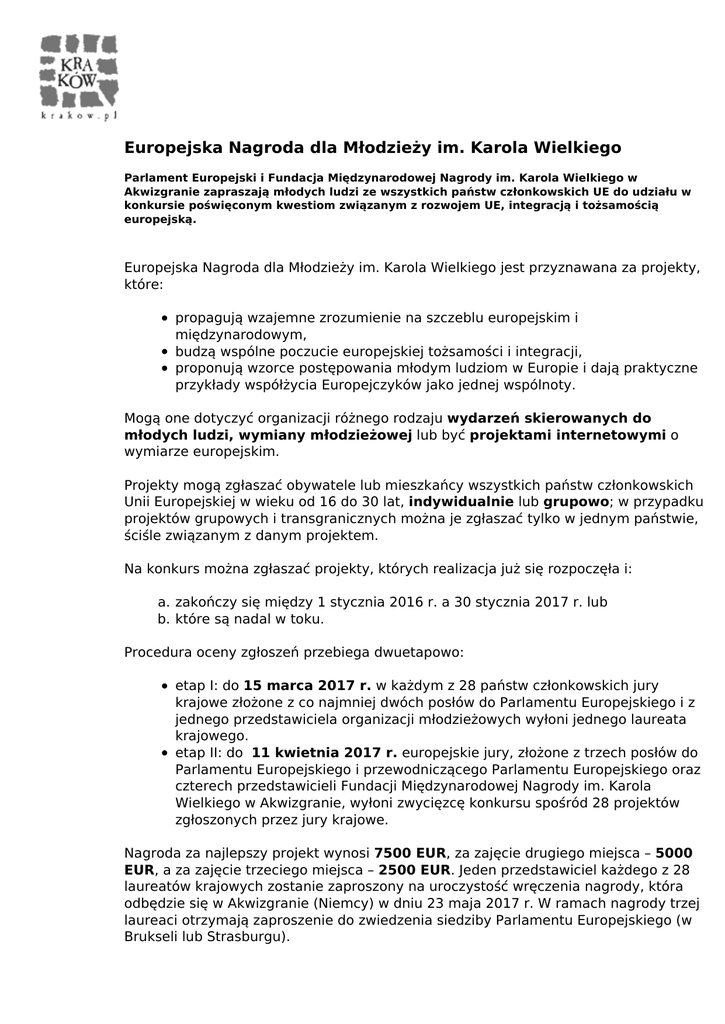 Europejska Nagroda dla Młodzieży im. Karola Wielkiego Parlament Europejski i Fundacja Międzynarodowej Nagrody im. Karola Wielkiego w Akwizgranie zapraszają młodych ludzi ze wszystkich państw członkowskich UE do udziału w konkursie poświęconym kwestiom związanym z rozwojem UE, integracją i tożsamością europejską. Europejska Nagroda dla Młodzieży im. Karola Wielkiego jest przyznawana za projekty, które: propagują wzajemne zrozumienie na szczeblu europejskim i międzynarodowym, budzą wspólne poczucie europejskiej tożsamości i integracji, proponują wzorce postępowania młodym ludziom w Europie i dają praktyczne przykłady współżycia Europejczyków jako jednej wspólnoty. Mogą one dotyczyć organizacji różnego rodzaju wydarzeń skierowanych do młodych ludzi, wymiany młodzieżowej lub być projektami internetowymi o wymiarze europejskim. Projekty mogą zgłaszać obywatele lub mieszkańcy wszystkich państw członkowskich Unii Europejskiej w wieku od 16 do 30 lat, indywidualnie lub grupowo; w przypadku projektów grupowych i transgranicznych można je zgłaszać tylko w jednym państwie, ściśle związanym z danym projektem. Na konkurs można zgłaszać projekty, których realizacja już się rozpoczęła i: a. zakończy się między 1 stycznia 2016 r. a 30 stycznia 2017 r. lub b. które są nadal w toku. Procedura oceny zgłoszeń przebiega dwuetapowo: etap I: do 15 marca 2017 r. w każdym z 28 państw członkowskich jury krajowe złożone z co najmniej dwóch posłów do Parlamentu Europejskiego i z jednego przedstawiciela organizacji młodzieżowych wyłoni jednego laureata krajowego. etap II: do 11 kwietnia 2017 r. europejskie jury, złożone z trzech posłów do Parlamentu Europejskiego i przewodniczącego Parlamentu Europejskiego oraz czterech przedstawicieli Fundacji Międzynarodowej Nagrody im. Karola Wielkiego w Akwizgranie, wyłoni zwycięzcę konkursu spośród 28 projektów zgłoszonych przez jury krajowe. Nagroda za najlepszy projekt wynosi 7500 EUR, za zajęcie drugiego miejsca – 5000 EUR, a za zajęcie trzeciego miejsca – 2500 EUR. Jeden przedstawiciel każdego z 28 laureatów krajowych zostanie zaproszony na uroczystość wręczenia nagrody, która odbędzie się w Akwizgranie (Niemcy) w dniu 23 maja 2017 r. W ramach nagrody trzej laureaci otrzymają zaproszenie do zwiedzenia siedziby Parlamentu Europejskiego (w Brukseli lub Strasburgu). Termin składania zgłoszeń upływa 30 stycznia 2017 r. Szczegółowe informacje o konkursie dostępne są pod adresem: http://www.charlemagneyouthprize.eu/pl/introduction.html Powered by TCPDF (www.tcpdf.org)
