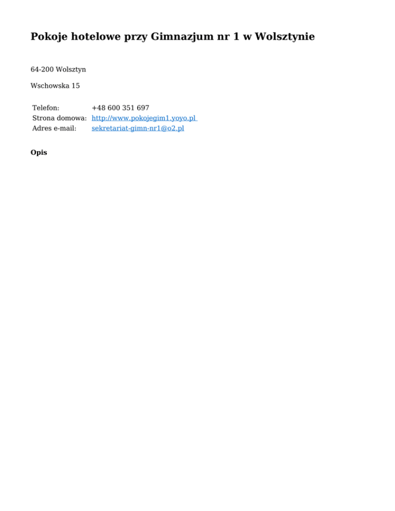 Pokoje hotelowe przy Gimnazjum nr 1 w Wolsztynie 64-200 Wolsztyn Wschowska 15 Telefon: +48 600 351 697 Strona domowa: http://www.pokojegim1.yoyo.pl Adres e-mail: Opis [email protected]