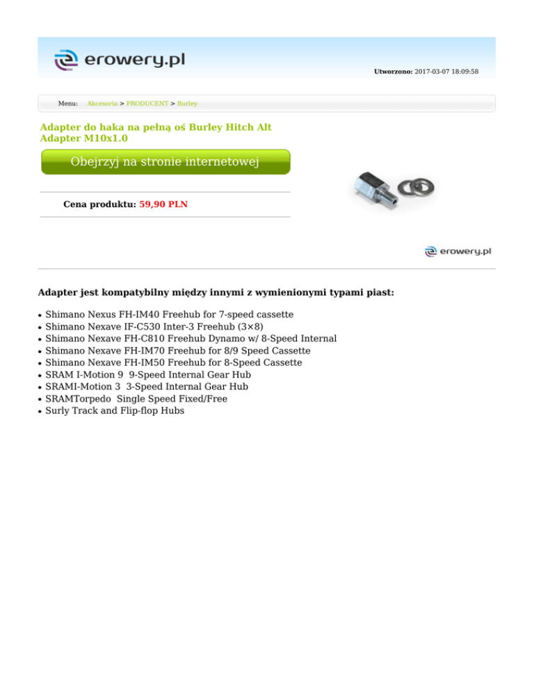 Utworzono: 2017-03-07 18:09:58 Menu: Akcesoria > PRODUCENT > Burley Adapter do haka na pełną oś Burley Hitch Alt Adapter M10x1.0 Obejrzyj na stronie internetowej Cena produktu: 59,90 PLN Adapter jest kompatybilny między innymi z wymienionymi typami piast: ● ● ● ● ● ● ● ● ● Shimano Nexus FH-IM40 Freehub for 7-speed cassette Shimano Nexave IF-C530 Inter-3 Freehub (3×8) Shimano Nexave FH-C810 Freehub Dynamo w/ 8-Speed Internal Shimano Nexave FH-IM70 Freehub for 8/9 Speed Cassette Shimano Nexave FH-IM50 Freehub for 8-Speed Cassette SRAM I-Motion 9 9-Speed Internal Gear Hub SRAMI-Motion 3 3-Speed Internal Gear Hub SRAMTorpedo Single Speed Fixed/Free Surly Track and Flip-flop Hubs Kolor - Mimo dołożenia wszelkich starań nie gwarantujemy, że publikowane opisy i specyfikacje techniczne niezawierają uchybień lub błędów, które nie mogą jednak być podstawą do roszczeń. W przypadku jakichkolwiek wątpliwości, przed podjęciem decyzji prosimy o kontakt. Adres: www.erowery.pl Telefon: 605 515 185, 34 361 16 71 Email: [email protected]