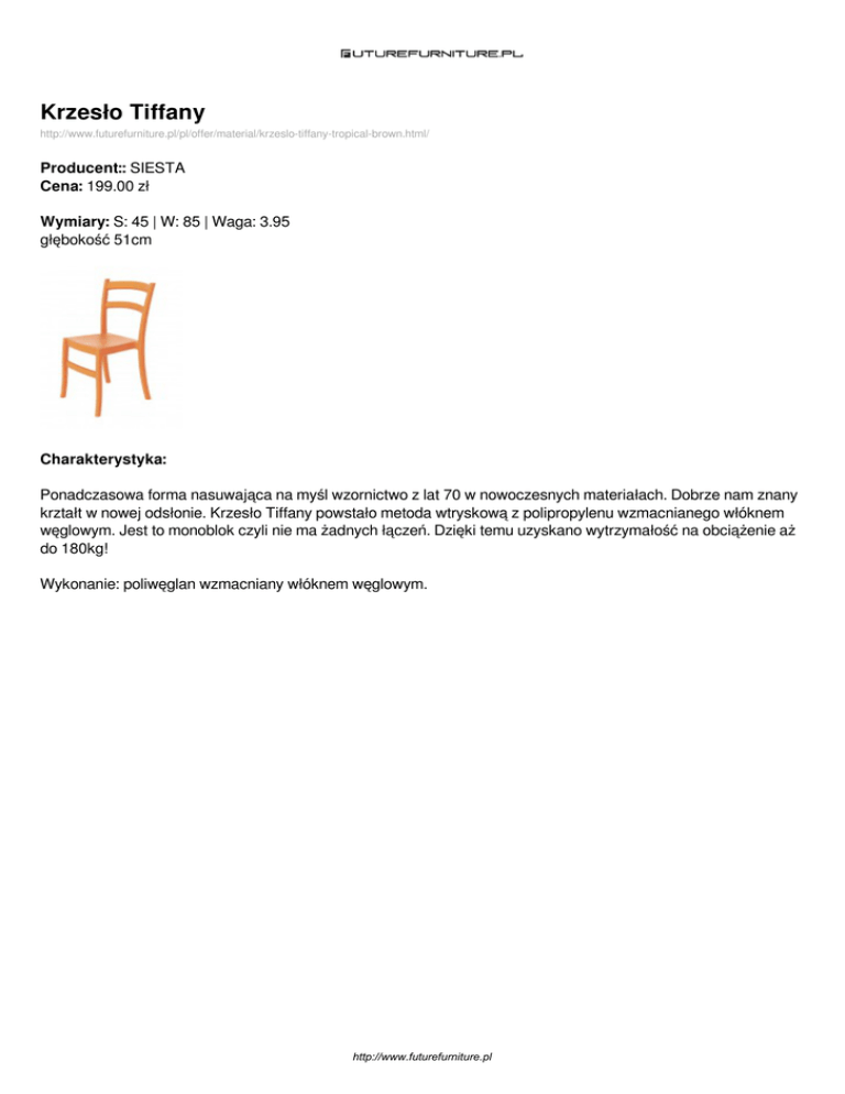 Krzesło Tiffany http://www.futurefurniture.pl/pl/offer/material/krzeslo-tiffany-tropical-brown.html/ Producent:: SIESTA Cena: 199.00 zł Wymiary: S: 45 | W: 85 | Waga: 3.95 głębokość 51cm Charakterystyka: Ponadczasowa forma nasuwająca na myśl wzornictwo z lat 70 w nowoczesnych materiałach. Dobrze nam znany krztałt w nowej odsłonie. Krzesło Tiffany powstało metoda wtryskową z polipropylenu wzmacnianego włóknem węglowym. Jest to monoblok czyli nie ma żadnych łączeń. Dzięki temu uzyskano wytrzymałość na obciążenie aż do 180kg! Wykonanie: poliwęglan wzmacniany włóknem węglowym. http://www.futurefurniture.pl Dostępne wersje produktu: nazwa produktu Krzesło Tiffany Krzesło Tiffany Krzesło Tiffany Krzesło Tiffany warianty kolor pomarańczowy kolor czarny kolor brązowy kolor biały cena 199.00zł 199.00zł 199.00zł 199.00zł http://www.futurefurniture.pl dostępne Na zamówienie Na zamówienie Na zamówienie Zapytaj Zdjęcia produktu: http://www.futurefurniture.pl Powered by TCPDF (www.tcpdf.org)