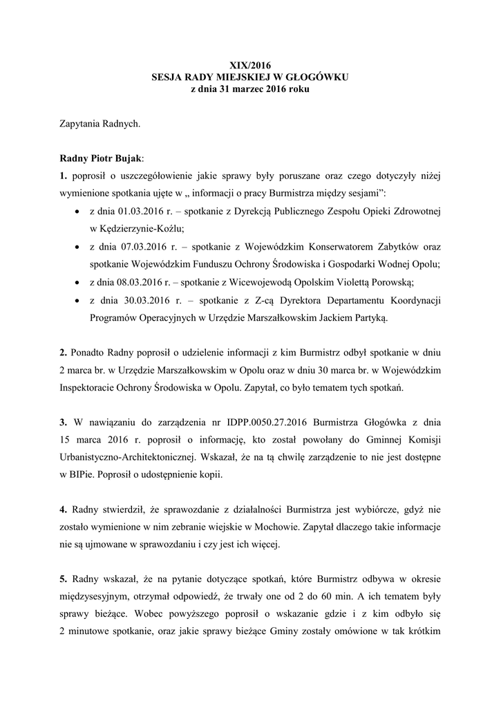 XIX/2016 SESJA RADY MIEJSKIEJ W GŁOGÓWKU z dnia 31 marzec 2016 roku Zapytania Radnych. Radny Piotr Bujak: 1. poprosił o uszczegółowienie jakie sprawy były poruszane oraz czego dotyczyły niżej wymienione spotkania ujęte w „ informacji o pracy Burmistrza między sesjami”: z dnia 01.03.2016 r. – spotkanie z Dyrekcją Publicznego Zespołu Opieki Zdrowotnej w Kędzierzynie-Koźlu; z dnia 07.03.2016 r. – spotkanie z Wojewódzkim Konserwatorem Zabytków oraz spotkanie Wojewódzkim Funduszu Ochrony Środowiska i Gospodarki Wodnej Opolu; z dnia 08.03.2016 r. – spotkanie z Wicewojewodą Opolskim Violettą Porowską; z dnia 30.03.2016 r. – spotkanie z Z-cą Dyrektora Departamentu Koordynacji Programów Operacyjnych w Urzędzie Marszałkowskim Jackiem Partyką. 2. Ponadto Radny poprosił o udzielenie informacji z kim Burmistrz odbył spotkanie w dniu 2 marca br. w Urzędzie Marszałkowskim w Opolu oraz w dniu 30 marca br. w Wojewódzkim Inspektoracie Ochrony Środowiska w Opolu. Zapytał, co było tematem tych spotkań. 3. W nawiązaniu do zarządzenia nr IDPP.0050.27.2016 Burmistrza Głogówka z dnia 15 marca 2016 r. poprosił o informację, kto został powołany do Gminnej Komisji Urbanistyczno-Architektonicznej. Wskazał, że na tą chwilę zarządzenie to nie jest dostępne w BIPie. Poprosił o udostępnienie kopii. 4. Radny stwierdził, że sprawozdanie z działalności Burmistrza jest wybiórcze, gdyż nie zostało wymienione w nim zebranie wiejskie w Mochowie. Zapytał dlaczego takie informacje nie są ujmowane w sprawozdaniu i czy jest ich więcej. 5. Radny wskazał, że na pytanie dotyczące spotkań, które Burmistrz odbywa w okresie międzysesyjnym, otrzymał odpowiedź, że trwały one od 2 do 60 min. A ich tematem były sprawy bieżące. Wobec powyższego poprosił o wskazanie gdzie i z kim odbyło się 2 minutowe spotkanie, oraz jakie sprawy bieżące Gminy zostały omówione w tak krótkim czasie. Zapytał także, czy nie prościej i taniej byłoby wykonać rozmowę telefoniczna, miast fatygować się osobiście. 6. Poprosił o doprecyzowanie kategorii: „siedziby pracy osób wizytujących”, gdzie to miały odbywać się ów 2 i 60 minutowe spotkania. Stwierdził, że skoro Burmistrz był osobą wizytującą, a siedziba jego pracy znajduje się w Ratuszu, dlaczego zostały pobrane delegacje. Uznał, że sytuacja byłaby jasna gdyby „spotkania odbyły się w siedzibie osób wizytowanych”. 7. Radny wyraził swoje głębokie zdziwienie, w związku z odpowiedzią otrzymaną na zapytanie dotyczące regionalnej turystki. Poinformował, że odpowiedź stanowi, iż „w 2015 r. liczba turystów odwiedzających Gminę Głogówek wyniosła dwa miliony czterysta pięćdziesiąt tysięcy osób”. Natomiast średni czas ich pobytu to cztery godziny piętnaście minut. W związku z powyższym zapytał, czy Burmistrz sam wierzy w to, co napisał. Stwierdził, że z posiadanych informacji wynika, iż doktryną w dokumentach programowych i strategicznych naszej Gminy zapisane jest, że będziemy rozwijać się z turystyki. Wobec czego należałby prowadzić monitoring ruchu turystycznego. Radny otrzymaną odpowiedź uznał za niewiarygodną. Wskazał, że z danych dostępnych na stronie GUSu wynika, iż całe Województwo Opolskie odwiedza rocznie siedemset trzydzieści tysięcy osób, czyli cztery razy mniej niż Głogówek. W ramach uszczegółowienia poprosił o podanie metodologii, jaka została użyta w wyliczeniu tej liczby turystów oraz czasu ich pobytu. By ukazać skalę absurdu otrzymanej odpowiedzi, Radny wskazał, że w chwili obecnej w Głogówku powinno znajdować się sześć tysięcy turystów. 8. W kontekście odpowiedzi, które zostały udzielone na pytania zadane na poprzedniej sesji, w związku z zestawieniem odpowiedzi z dnia 29.11.2013 r., która brzmiała: „zawarto już umowę z Gminą Pawłowiczki, do której Wróblin zostanie przyłączony” – w kwestii kanalizacji, a stanowiska wyrażonego w piśnie z dnia 15.03.2016 r., w którym to Burmistrz twierdzi, że „nie została podpisana umowa z Gminą Pawłowiczki”. Zapytał czy w 2013 r. Burmistrz świadomie mówił nieprawdę i jaki był cel tej wypowiedzi. 9. Wskazał, że podczas ostatnich obrad Sesji zapytał, jak postępują prace nad Strategią Rozwoju Gminy oraz kiedy planowane jest poddanie tego materiału pod konsultacje społeczne. Otrzymana odpowiedź stanowi: „na najbliższej Sesji zostanie Radzie złożony projekt uchwały o konsultacjach społecznych”. Wobec powyższego ponownie zapytał kiedy przewiduje się publikacje projektu Strategii. 10. Ponowił wniosek o uprzątniecie terenu przy boisku ze sztucznej nawierzchni we Wróblinie, gdzie zalegają odpady powstałe w związku z wymianą piłko chwytów. 11. Wniósł o wykonanie melioracji wodnej rowu w Starych Kotkowicach biegnącego za posesjami, na wysokości cmentarza w kierunku Biedrzychowic. 12. W imieniu mieszkańca Głogówka zwrócił się w kwestii organizowanych w dniu 16 czerwca br. w Głogówku otwartych mistrzostw Polski w Taekwondo. Zapytał czy wydarzenie to zostało bądź zostanie dofinansowane ze środków Gminy Głogówek. Uzyskana informacja podważa zasadność nazywania tej imprezy rangą mistrzostw Polski, gdyż zgodnie z ustawą o sporcie, takowe mistrzostwa mogą być organizowane jedynie przez związki sportowe. Tymczasem to wydarzenie nie jest organizowane przez żaden z dwóch istniejących polskich związków Taekwondo. W przypadku, gdy Gmina ma jakikolwiek udział w tym wydarzeniu, Radny poprosił o zweryfikowanie tej informacji. Natomiast jeżeli propagowanie rangi mistrzowskiej tego wydarzenia pozostaje niejako w sprzeczności z zapisami polskiego prawa, wniósł o interwencje u organizatora celem uporządkowanie owej kwestii. 13. Wniósł o podjęcie działań wg właściwości mających na celu usuniecie suchych krzewów znajdujących się wzdłuż drogi powiatowej pomiędzy Wróblinem, a St