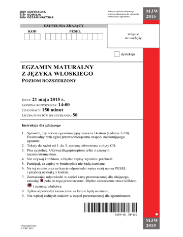 Arkusz zawiera informacje prawnie chronione do momentu rozpoczęcia egzaminu. MJW 2015 UZUPEŁNIA ZDAJĄCY KOD PESEL miejsce na naklejkę dysleksja EGZAMIN MATURALNY Z JĘZYKA WŁOSKIEGO POZIOM ROZSZERZONY DATA: 21 maja 2015 r. GODZINA ROZPOCZĘCIA: 14:00 CZAS PRACY: 150 minut LICZBA PUNKTÓW DO UZYSKANIA: 50 Instrukcja dla zdającego 1. Sprawdź, czy arkusz egzaminacyjny zawiera 14 stron (zadania 1–10). Ewentualny brak zgłoś przewodniczącemu zespołu nadzorującego egzamin. 2. Teksty do zadań od 1. do 3. zostaną odtworzone z płyty CD. 3. Pisz czytelnie. Używaj długopisu/pióra tylko z czarnym tuszem/atramentem. 4. Nie używaj korektora, a błędne zapisy wyraźnie przekreśl. 5. Pamiętaj, że zapisy w brudnopisie nie będą oceniane. 6. Na tej stronie oraz na karcie odpowiedzi wpisz swój numer PESEL i przyklej naklejkę z kodem. 7. Zaznaczając odpowiedzi w części karty przeznaczonej dla zdającego, zamaluj pola do tego przeznaczone. Błędne zaznaczenie otocz kółkiem i zaznacz właściwe. 8. Tylko odpowiedzi zaznaczone na karcie będą oceniane. 9. Nie wpisuj żadnych znaków w części przeznaczonej dla egzaminatora. MJW-R1_1P-152 Układ graficzny © CKE 2015 MJW 2015 Zadanie 1. (0–3) Usłyszysz dwukrotnie trzy teksty. Z podanych odpowiedzi wybierz właściwą, zgodną z treścią nagrania. Zakreśl literę A, B albo C. 1.1. Il giornalista parla con A. una giocatrice di hockey. B. una giornalista sportiva. C. una donna arbitro. 1.2. L’autore del testo vuole A. invitare al concerto di una cantante. B. commentare un film su una cantante. C. rendere noti i successi di una cantante. 1.3. Quale delle affermazioni è presentata nel testo come fatto, e non come opinione soggettiva? A. Gli italiani scelgono di mangiare sempre più spesso a casa. B. Dagli anni ’60 nelle case italiane è diminuito il consumo della pasta. C. A causa della crisi economica la situazione delle panetterie è in pericolo. Zadanie 2. (0–4) Usłyszysz dwukrotnie cztery wypowiedzi na temat filmów. Do każdej wypowiedzi (2.1.–2.4.) dopasuj odpowiadające jej zdanie (A–E). Wpisz rozwiązania do tabeli. Uwaga: jedno zdanie zostało podane dodatkowo i nie pasuje do żadnej wypowiedzi. A. La critica ha selezionato i migliori film dell’anno. B. Vengono presentati film nuovi che sono poco conosciuti. C. Alcuni guardano un film proprio perché alla critica non piace. D. Si proietteranno dei film presentati in passato allo stesso festival. E. Tra gli ospiti sarà presente un personaggio famoso del mondo del cinema. 2.1. 2.2. 2.3. Strona 2 z 14 2.4. MJW-1R Zadanie 3. (0–5) Usłyszysz dwukrotnie wywiad z burmistrzem Rzymu. Z podanych odpowiedzi wybierz właściwą, zgodną z treścią nagrania. Zakreśl literę A, B, C albo D. 3.1. Ignazio Marino è diventato sindaco di Roma anche se A. non aveva mai vissuto nella capitale italiana. B. non aveva fatto carriera politica in passato. C. non ha esperienza di lavoro all’estero. D. non ha origini romane. 3.2. Il primo giorno di lavoro Marino A. ha giocato a calcio. B. ha guidato l’autobus. C. ha incontrato un bambino malato. D. ha organizzato un incontro con i suoi impiegati. 3.3. Nel “pacchetto lavoro” manca la possibilità di A. partecipare a un tirocinio. B. seguire un corso di lingua straniera. C. usare gratuitamente i mezzi pubblici. D. ricevere un supporto finanziario mensile. 3.4. Per quanto riguarda il trasporto pubblico Marino vuole A. ridurre il numero delle linee nella capitale. B. analizzare le cause del traffico a Roma. C. continuare la politica dell’ex sindaco. D. assumere più lavoratori nel settore. 3.5. Nella risposta all’ultima domanda il sindaco promette di A. smettere di ascoltare la musica mentre va in bici. B. promuovere la costruzione di piste ciclabili. C. rinunciare alla bicicletta. D. portare il casco in bici. PRZENIEŚ ROZWIĄZANIA ZADAŃ OD 1. DO 3. NA KARTĘ ODPOWIEDZI! MJW-1R Strona 3 z 14 Zadanie 4. (0–4) Przeczytaj tekst, który został podzielony na trzy części (A–C) oraz zdania ich dotyczące (4.1.–4.4.). Do każdego zdania dopasuj właściwą część tekstu. Wpisz rozwiązania do tabeli. Uwaga: jedna część tekstu pasuje do dwóch zdań. 4.1. Le imprese traggono vantaggio dalla presenza degli stagisti. 4.2. Per fare uno stage non bisogna fare altri corsi dopo l’università. 4.3. Alcuni incaricano lo stagista solo di lavori semplicissimi. 4.4. In alcune imprese è possibile trovare un lavoro fisso dopo lo stage. COME SCEGLIERE LO STAGE A. Lo stage è un’esperienza che serve a dare ai giovani competenze pratiche direttamente nel campo del lavoro. Sul mercato sono presenti molti master che costano tanto, la maggior parte dei quali, al termine del percorso in aula, garantisce un periodo di stage in azienda. Dopo la laurea si pensa di dover intraprendere necessariamente ulteriori percorsi formativi, ma nulla è più falso. Innanzitutto valutate bene se avete davvero bisogno di svolgere uno stage. Se ne avete fatti altri in passato, avete già guadagnato esperienza. B. Fare uno o due tirocini in qualche azienda potrebbe essere interessante e utile per voi, e per il vostro curriculum. Farne più di due, invece, può diventare inutile: rischiate di perdere tempo e soldi poiché molto spesso i tirocini non sono retribuiti. Comunque ricordate: fare uno stage non significa che l’azienda ospitante intenda assumervi dopo il tirocinio. Se ve lo aspettate, chiaritelo prima di iniziare, verificate che l’azienda abbia dei posti vacanti e che lo stagista possa ricevere un lavoro se ha le giuste competenze. Alcune aziende propongono contratti a tempo determinato o indeterminato dopo lo stage. C. Quando si inizia uno stage, spesso ci si sente dire che bisogna essere umili, ma questo non è del tutto vero. Nel breve periodo bisogna rimboccarsi le maniche ed imparare qualcosa da ogni cosa che si fa. L’esperienza dovrà essere arricchente ed aumentare le vostre competenze: non accettate di stare 6 mesi a fare 
