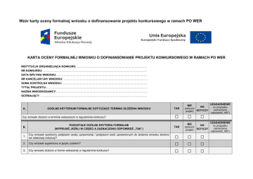 Wzór karty oceny formalnej wniosku o dofinansowanie projektu konkursowego w ramach PO WER KARTA OCENY FORMALNEJ WNIOSKU O DOFINANSOWANIE PROJEKTU KONKURSOWEGO W RAMACH PO WER INSTYTUCJA ORGANIZUJĄCA KONKURS: …………………………………………………………………… NR KONKURSU: ……………………………………………………………………………………………………. DATA WPŁYWU WNIOSKU: ………………………………………………………………………………………. NR KANCELARYJNY WNIOSKU: ……………………………………………………………………….………… SUMA KONTROLNA WNIOSKU: ……………………………………………………………………….………… TYTUŁ PROJEKTU:…………………………………………………………………………………………………. NAZWA WNIOSKODAWCY: ………………………………………………………………………………………. OCENIAJĄCY: ………………………………………………………………………………………………………. A. OGÓLNE KRYTERIUM FORMALNE DOTYCZĄCE TERMINU ZŁOŻENIA WNIOSKU Czy wniosek złożono w terminie wskazanym w regulaminie konkursu? B. POZOSTAŁE OGÓLNE KRYTERIA FORMALNE (WYPEŁNIĆ JEŻELI W CZĘŚCI A ZAZNACZONO ODPOWIEDŹ „TAK”) 1. Czy wniosek opatrzony podpisem osoby uprawnionej / podpisami osób uprawnionych do złożenia wniosku złożono we właściwej instytucji? 2. Czy wniosek wypełniono w języku polskim? 3. Czy wniosek złożono w formie wskazanej w regulaminie konkursu? UZASADNIENIE NIE TAK □ NIE (odrzucić DOTYCZY projekt) □ □ UZASADNIENIE NIE TAK □ □ □ NIE (odrzucić DOTYCZY projekt) □ □ □ (w przypadku zaznaczenia odpowiedzi „NIE”) □ □ □ (w przypadku zaznaczenia odpowiedzi „NIE”) 4. Czy wydatki w projekcie o wartości nieprzekraczającej wyrażonej w PLN równowartości kwoty 100 000 EUR1 wkładu publicznego2 są rozliczane uproszczonymi metodami, o których mowa w Wytycznych w zakresie kwalifikowalności wydatków w zakresie Europejskiego Funduszu Rozwoju Regionalnego, Europejskiego Funduszu Społecznego oraz Funduszu Spójności na lata 2014-2020? 5. Czy wnioskodawca oraz partnerzy (o ile dotyczy) podlegają wykluczeniu z możliwości ubiegania się o (odrzucić dofinansowanie, w tym wykluczeniu, o którym mowa w art. 207 ust. 4 ustawy z dnia 27 sierpnia 2009 r. o finansach projekt) publicznych? 6. Czy wnioskodawca zgodnie ze Szczegółowym Opisem Osi Priorytetowych PO WER jest podmiotem uprawnionym do ubiegania się o dofinansowanie w ramach właściwego Działania/Podziałania PO WER? □ □ □ NIE TAK □ □ □ □ □ □ 7. Czy w przypadku projektu partnerskiego spełnione zostały wymogi dotyczące 1) wyboru partnerów spoza sektora finansów publicznych, o których mowa w art. 33 ust. 2-4 ustawy z dnia 11 lipca 2014 r. o zasadach realizacji programów w zakresie polityki spójności finansowanych w perspektywie 2014-2020 (o ile dotyczy); 2) braku powiązań, o których mowa w art. 33 ust. 6 ustawy z dnia 11 lipca 2014 r. o zasadach realizacji programów w zakresie polityki spójności finansowanych w perspektywie 2014-2020 oraz w Szczegółowym Opisie Osi Priorytetowych PO WER, pomiędzy podmiotami tworzącymi partnerstwo oraz 3) utworzenia albo zainicjowania partnerstwa w terminie zgodnym ze Szczegółowym Opisem Osi Priorytetowych PO WER tj. przed złożeniem wniosku o dofinansowanie albo przed rozpoczęciem realizacji projektu, o ile data ta jest wcześniejsza od daty złożenia wniosku o dofinansowanie? □ □ □ 8. Czy wnioskodawca oraz partnerzy krajowi3 (o ile dotyczy), ponoszący wydatki w danym projekcie z EFS, posiadają łączny obrót za ostatni zatwierdzony rok obrotowy zgodnie z ustawą z dnia 29 września 1994 r. o rachunkowości (Dz. U. z 2013 r. poz. 330, z późn. zm.) (jeśli dotyczy) lub za ostatni zamknięty i zatwierdzony rok kalendarzowy równy lub wyższy od łącznych rocznych wydatków w ocenianym projekcie i innych projektach realizowanych w ramach EFS, których stroną umowy o dofinansowanie jest instytucja, w której dokonywana jest ocena formalna wniosku w roku kalendarzowym, w którym wydatki są najwyższe 4? □ □ □ 1 Powyższa kwota jest przeliczana na PLN z wykorzystaniem miesięcznego obrachunkowego kursu wymiany stosowanego przez Komisję Europejską aktualnego na dzień ogłoszenia konkursu w przypadku projektów konkursowych albo na dzień wystosowania wezwania do złożenia wniosku o dofinansowanie projektu pozakonkursowego w przypadku projektów pozakonkursowych. Kurs jest publikowany na stronie internetowej: http://ec.europa.eu/budget/inforeuro/index.cfm?fuseaction=home&Language=en. 2 Zgodnie z art. 67 ust. 1 lit. c rozporządzenia Parlamentu Europejskiego i Rady (UE) nr 1303/2013 z dnia 17 grudnia 2013 r. ustanawiającego wspólne przepisy dotyczące Europejskiego Funduszu Rozwoju Regionalnego, Europejskiego Funduszu Społecznego, Funduszu Spójności, Europejskiego Funduszu Rolnego na rzecz Rozwoju Obszarów Wiejskich oraz Europejskiego Funduszu Morskiego i Rybackiego oraz ustanawiającego przepisy ogólne dotyczące Europejskiego Funduszu Rozwoju Regionalnego, Europejskiego Funduszu Społecznego, Funduszu Spójności i Europejskiego Funduszu Morskiego i Rybackiego oraz uchylającego rozporządzenie Rady (WE) nr 1083/2006 (Dz. Urz. UE z 20.12.2013, str. 320 L 347, z późn. zm.). 3 W przypadku podmiotów niebędących jednostkami sektora finansów publicznych jako obroty należy rozumieć wartość przychodów (w tym przychodów osiągniętych z tytułu otrzymanego dofinansowania na realizację projektów) osiągniętych w ostatnim zatwierdzonym roku przez danego wnioskodawcę/ partnera (o ile dotyczy) na dzień składania wniosku o dofinansowanie. Kryterium nie dotyczy jednostek sektora finansów publicznych. W przypadku realizacj