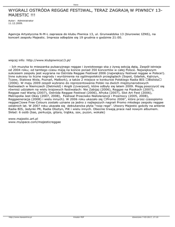 Iława WYGRALI OSTRÓDA REGGAE FESTIWAL, TERAZ ZAGRAJĄ W PIWNICY 13MAJESTIC !!! Autor: Administrator 11.12.2009. Agencja Artystyczna N-M-L zaprasza do klubu Piwnica 13, ul. Grunwaldzka 13 (biurowiec IZNS), na koncert zespołu Majestic. Impreza odbędzie się 19 grudnia o godzinie 21:00. więcej info: http://www.klubpiwnica13.pl/ - Ich muzyka to mieszanka pulsacyjnego reggae i żywiołowego ska z żywą sekcją dętą. Zespół istnieje od 2004 roku; od tamtego czasu mają na koncie ponad 350 koncertów w całej Polsce. Największym sukcesem zespołu jest wygrana na Ostróda Reggae Festiwal 2006 (największy festiwal reggae w Polsce!). Inne sukcesy to liczne nagrody i wyróżnienia na ogólnopolskich przeglądach (Sopot, Gdańsk, Kętrzyn, Tczew, Stalowa Wola, Poznań, Malbork), a także 2 miejsce w konkursie Polskiego Radia BIS Bislista (2006). W maju 2009 zespół wybrano do reprezentowania Polski na dwóch międzynarodowych festiwalach w Niemczech (Detmold) i Anglii (Liverpool), które odbyły się latem 2009. Mogą poszczycić się również udziałem na wielu krajowych festiwalach: Nie Zabijaj (2006), Reggae na Piaskach (2007), Reggae nad Wartą (2007), Ostróda Reggae Festiwal (2006), Afryka (2007), Slot Art Fest (2006), Metropolia Jest Okey (2007, 2008), Festiwal Przeciwko Nietolerancji i Przemocy (2005, 2008), Reggaeneracja (2008) i wielu innych). W 2006 roku ukazało się Promo 2006", które przez czasopismo reggaeowe Free Colours zostało uznane za jedno z najlepszych nagrań Promo młodego zespołu reggae ostatnich lat. W 2007 roku ukazała się debiutancka płyta "roop rege". Utwory Majestic gościły na antenie Radia BIS, Jedynki PR, Radia Olsztyn, PiK i wielu innych. Obecnie trwają prace nad nowym albumem. Skład: 6 osób (bas, perkusja, gitara, trąbka, sax, puzon, wokale) www.majestic.art.pl www.myspace.com/majesticreggae http://www.ilawaonline.pl Kreator PDF Utworzono 7-03-2017, 17:10