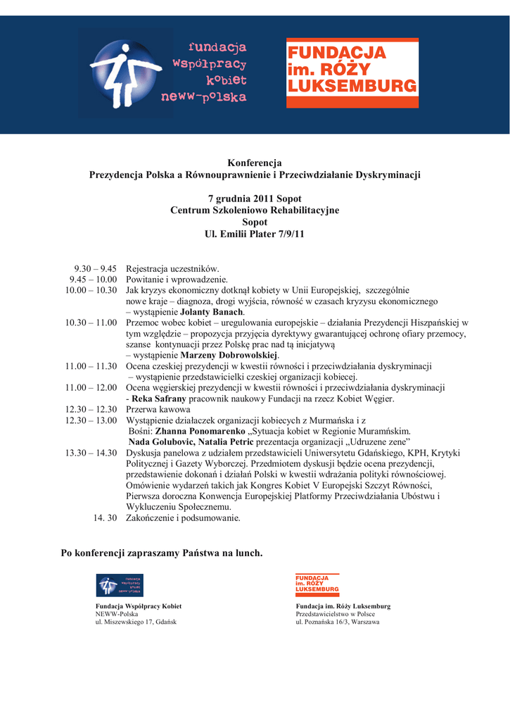 fundacja wsp ółpracy kobiet neww -polska FUNDACJA im. RÓŻY LUKSEMBURG Konferencja Prezydencja Polska a Równouprawnienie i Przeciwdziałanie Dyskryminacji Konferencja 7 grudnia 2011 Sopot Prezydencja Polska a Równouprawnienie i Przeciwdziałanie Dyskryminacji Centrum Szkoleniowo Rehabilitacyjne Sopot 7 grudnia 2011 Sopot Ul. Emilii Plater 7/9/11 Centrum Szkoleniowo Rehabilitacyjne Sopot Ul. Emilii Plater 7/9/11 9.30 – 9.45 Rejestracja uczestników. 9.45 – 10.00 10.00 – 10.30 9.30 – 9.45 9.45 – 10.00 10.00 10.30 –– 10.30 11.00 10.30 – 11.00 11.00 – 11.30 11.00 – 12.00 11.00 – 11.30 12.30 – 12.30 11.00 12.30 –– 12.00 13.00 12.30 – 12.30 12.30 13.30 –– 13.00 14.30 13.30 – 14.30 14. 30 14. 30 Powitanie i wprowadzenie. Jak kryzys ekonomiczny dotknął kobiety w Unii Europejskiej, szczególnie Rejestracja nowe kraje –uczestników. diagnoza, drogi wyjścia, równość w czasach kryzysu ekonomicznego Powitanie i wprowadzenie. – wystąpienie Jolanty Banach. Jak kryzyswobec ekonomiczny dotknął kobiety w Unii Europejskiej, szczególnie Hiszpańskiej w Przemoc kobiet – uregulowania europejskie – działania Prezydencji nowe kraje – diagnoza, drogi wyjścia, równość w czasach kryzysu ekonomicznego tym względzie – propozycja przyjęcia dyrektywy gwarantującej ochronę ofiary przemocy, – wystąpienie Jolanty Banach. szanse kontynuacji przez Polskę prac nad tą inicjatywą Przemoc wobec kobiet –Dobrowolskiej. uregulowania europejskie – działania Prezydencji Hiszpańskiej w – wystąpienie Marzeny tym względzie propozycjawprzyjęcia dyrektywy gwarantującej ochronę ofiary przemocy, Ocena czeskiej –prezydencji kwestii równości i przeciwdziałania dyskryminacji szanse kontynuacji przez Polskęczeskiej prac nad tą inicjatywą – wystąpienie przedstawicielki organizacji kobiecej. – wystąpienie Marzeny Dobrowolskiej. Ocena węgierskiej prezydencji w kwestii równości i przeciwdziałania dyskryminacji Ocena czeskiej prezydencji w kwestiiFundacji równościna i przeciwdziałania dyskryminacji - Reka Safrany pracownik naukowy rzecz Kobiet Węgier. – wystąpienie przedstawicielki czeskiej organizacji kobiecej. Przerwa kawowa Ocena węgierskiej prezydencji w kwestii równości i przeciwdziałania dyskryminacji Wystąpienie działaczek organizacji kobiecych z Murmańska iz -Bośni: Reka Safrany pracownik naukowy Fundacji na rzecz Kobiet Węgier. Zhanna Ponomarenko „Sytuacja kobiet w Regionie Muramńskim. Przerwa kawowa Natalia Petric prezentacja organizacji „Udruzene zene” Nada Golubovic, Wystąpienie działaczek organizacji kobiecych zUniwersytetu Murmańska iGdańskiego, z Dyskusja panelowa z udziałem przedstawicieli KPH, Krytyki Bośni: Zhanna Ponomarenko „Sytuacja kobiet w Regionie Muramńskim. Politycznej i Gazety Wyborczej. Przedmiotem dyskusji będzie ocena prezydencji, Nada Golubovic, Natalia Petric Polski prezentacja organizacji „Udruzene przedstawienie dokonań i działań w kwestii wdrażania politykizene” równościowej. Dyskusja panelowa z udziałem przedstawicieli Uniwersytetu Gdańskiego, KPH, Krytyki Omówienie wydarzeń takich jak Kongres Kobiet V Europejski Szczyt Równości, Politycznej i Gazety Wyborczej. Przedmiotem dyskusji będzie ocena prezydencji, Pierwsza doroczna Konwencja Europejskiej Platformy Przeciwdziałania Ubóstwu i przedstawienie dokonań i działań Polski w kwestii wdrażania polityki równościowej. Wykluczeniu Społecznemu. Omówienie wydarzeń takich jak Kongres Kobiet V Europejski Szczyt Równości, Zakończenie i podsumowanie. Pierwsza doroczna Konwencja Europejskiej Platformy Przeciwdziałania Ubóstwu i Wykluczeniu Społecznemu. Zakończenie i podsumowanie. Po konferencji zapraszamy Państwa na lunch. Fundacja fundacj Współpracy Kobiet a Po konferencji zapraszamy Państwa na lunch. NEWW-Polska wsp ółpracy kobiet neww -polska ul. Miszewskiego 17, Gdańsk Fundacja Współpracy Kobiet NEWW-Polska ul. Miszewskiego 17, Gdańsk Fundacja im. Róży Luksemburg FUNDACJA im. RÓŻY Przedstawicielstwo w Polsce LUKSEMBURG ul. Poznańska 16/3, Warszawa Fundacja im. Róży Luksemburg Przedstawicielstwo w Polsce ul. Poznańska 16/3, Warszawa