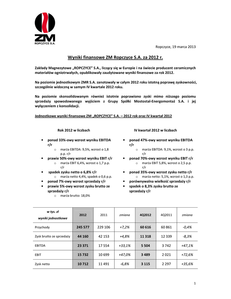Wyniki finansowe ZM Ropczyce SA za 2012 r.