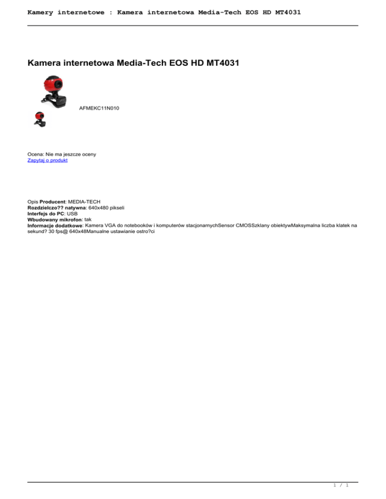 Kamery internetowe : Kamera internetowa Media-Tech EOS HD MT4031 Kamera internetowa Media-Tech EOS HD MT4031 AFMEKC11N010 Ocena: Nie ma jeszcze oceny Zapytaj o produkt Opis Producent: MEDIA-TECH Rozdzielczo?? natywna: 640x480 pikseli Interfejs do PC: USB Wbudowany mikrofon: tak Informacje dodatkowe: Kamera VGA do notebooków i komputerów stacjonarnychSensor CMOSSzklany obiektywMaksymalna liczba klatek na sekund? 30 fps@ 640x48Manualne ustawianie ostro?ci 1 / 1 Powered by TCPDF (www.tcpdf.org)