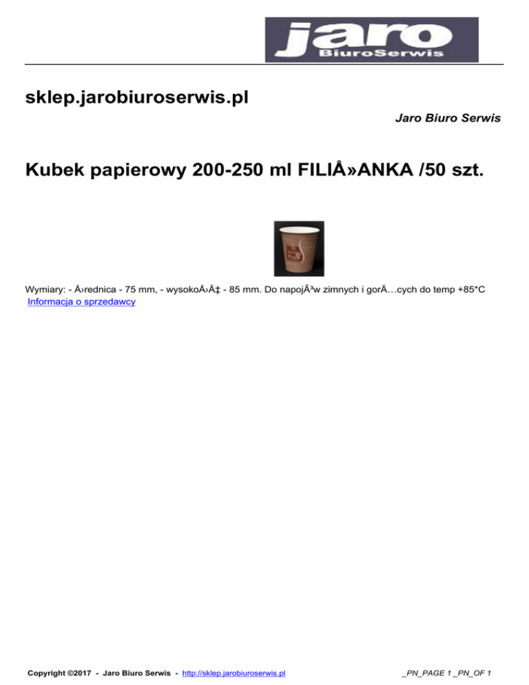 sklep.jarobiuroserwis.pl Jaro Biuro Serwis Kubek papierowy 200-250 ml FILIÅ»ANKA /50 szt. Wymiary: - Å›rednica - 75 mm, - wysokość - 85 mm. Do napojów zimnych i gorÄ…cych do temp +85*C Informacja o sprzedawcy Copyright ©2017 - Jaro Biuro Serwis - http://sklep.jarobiuroserwis.pl _PN_PAGE 1 _PN_OF 1