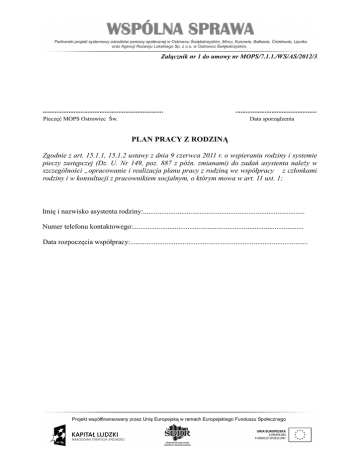 Załącznik nr 1 do umowy nr MOPS/7.1.1./WS/AS/2012/3 ……………………………………………………………. Pieczęć MOPS Ostrowiec Św. ……………………………………….. Data sporządzenia PLAN PRACY Z RODZINĄ Zgodnie z art. 15.1.1, 15.1.2 ustawy z dnia 9 czerwca 2011 r. o wspieraniu rodziny i systemie pieczy zastępczej (Dz. U. Nr 149, poz. 887 z późn. zmianami) do zadań asystenta należy w szczególności „opracowanie i realizacja planu pracy z rodziną we współpracy z członkami rodziny i w konsultacji z pracownikiem socjalnym, o którym mowa w art. 11 ust. 1; Imię i nazwisko asystenta rodziny:......................................................................................... Numer telefonu kontaktowego:.............................................................................................. Data rozpoczęcia współpracy:.................................................................................................. I. Podstawowe dane dotyczące rodziny Nazwisko i imię matki: Nazwisko i imię męża/partnera /wpisać jeśli zamieszkuje z rodziną/: Data urodzenia matki: Data urodzenia ojca: Nr tel.: Nr tel.: Nr dowodu: Nr dowodu: Nr pesel: Nr pesel: Wykształcenie/Zawód/ Miejsce pracy: Wykształcenie/Zawód/ Miejsce pracy: Informacje dot. władzy rodzicielskiej/postanowienie Sądu Informacje dot. władzy rodzicielskiej/ postanowienie Sądu Adres zamieszkania: Sytuacja mieszkaniowa: Pozostali członkowie rodziny podstawowej wspólnie zamieszkującej 1. Nazwisko i imię: stopień pokrewieństwa: data urodzenia: pesel: miejsce pracy/nauki: 3. Nazwisko i imię: stopień pokrewieństwa: data urodzenia: pesel: miejsce pracy/nauki: 2. Nazwisko i imię: stopień pokrewieństwa: data urodzenia: pesel: miejsce pracy/nauki: 4. Nazwisko i imię: stopień pokrewieństwa: data urodzenia: pesel: miejsce pracy/nauki: Dane kontaktowe osób z otoczenia rodzinnego i sąsiedzkiego mogących udzielić wsparcia Nazwisko i imię Adres zamieszkania/ nr telefonu Stopień Zakres udzielanego wsparcia pokrewieństwa Dane kontaktowe osób współpracujących z rodziną: Pracownik socjalny: …………………………………………………………………………… Kurator rodziny:……………………………………………………………………………….. Pedagog szkolny:………………………………………………………………………………. Wychowawca świetlicy:……………………………………………………………………….. Lekarz/pielęgniarka:…………………………………………………………………………… Koordynator rodzinnej pieczy zastępczej: .................................................................................. ………………………………………………………………………………………………… ………………………………………………………………………………………………… II. Ocena sytuacji życiowej rodziny jako całości oraz poszczególnych jej członków 1. Przyczyny trudności występujących w rodzinie, ograniczenia: ………………………………………………………………………………………………… ………………………………………………………………………………………………… ………………………………………………………………………………………………… ………………………………………………………………………………………………… ………………………………………………………………………………………………… ………………………………………………………………………………………………… ………………………………………………………………………………………………… ………………………………………………………………………………………………… …………………………………………………………………………....................................... ...................................................................................................................................................... 2. Zasoby rodziny: ………………………………………………………………………………………………… ………………………………………………………………………………………………… ………………………………………………………………………………………………… ………………………………………………………………………………………………… ………………………………………………………………………………………………… ………………………………………………………………………………………………… ………………………………………………………………………………………………… ………………………………………………………………………………………………… …………………………………………………………………………....................................... ........................................................................................................ 3. Cel główny i przewidywane efekty: ………………………………………………………………………………………………… ………………………………………………………………………………………………… ………………………………………………………………………………………………… ………………………………………………………………………………………………… ……………