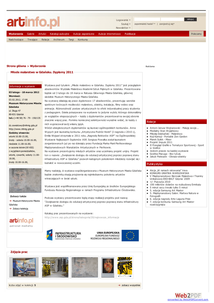 Logow anie » Szukaj » New sletter » Wydarzenia Galerie Nadchodzące Trw ające Artyści Relacje Katalogi aukcyjne Archiw um Aukcje zagraniczne Targi Aukcje internetow e zaloguj zapomniałeś hasła? » | zarejestruj się» Publikacje Polecamy Konkursy Strona główna > Wydarzenia Reklama Młode malarstwo w Gdańsku. Dyplomy 2011 Informacje o w ystaw ie 03 lutego - 18 marca 2012 Wernisaż: 03.02.2012, 17:00 Muzeum Historyczne Miasta Gdańska ul. Dluga 47 80-831 Gdańsk tel.: (+48 58) 76 - 79 - 150/135 [email protected],pl http://www.mhmg.gda.pl Godziny otwarcia: wtorki 10.00-15.00, środy - sobota 10.00-16.00, niedziele 11.00-16.00; w sezonie letnim (VI-VIII) z wyjątkiem poniedziałków, wtorki, czwartki, soboty 11.0018.00, środy 10.00-16.00, W ystaw a pod tytułem: „Młode malarstw o w Gdańsku. Dyplomy 2011” jest przeglądem absolw entów W ydziału Malarstw a Akademii Sztuk Pięknych w Gdańsku. Prezentow ana będzie od 3 lutego do 18 marca w Ratuszu Głów nego Miasta Gdańska, głów nej siedzibie Muzeum Historycznego Miasta Gdańska. Na w ystaw ę składają się prace dyplomow e 17 absolw entów , prezentując szerokie spektrum tw órczych możliw ości: malarstw o, obiekty, instalacje, filmy w ideo oraz animacje. Różnorodność postaw artystycznych to efekt indyw idualnej pracy studenta z pedagogiem. Dzieła pokazyw ane na w ystaw ie to jedynie w ybór, którego dokonaliśmy ze w zględów ekspozycyjnych – każdy z dyplomantów prezentow ał na sw ojej obronie znacznie w ięcej prac. Pomimo koniecznej selektyw ności w yraźnie w idać, że każdy z nich w ypracow ał sw ój w łasny język. W śród ubiegłorocznych dyplomantów są laureaci ogólnopolskich konkursów . Anna W ypych jest laureatką konkursu „Artystyczna Podróż Hestii” (I nagroda z 2010 r.), Emilia Wojszel otrzymała w 2011 roku „Nagrodę Rektorów ASP” na Ogólnopolskiej W ystaw ie Najlepszych Dyplomów ASP, Sergiusz Pow ałka został laureatem zorganizow anych już po raz dziesiąty przez Fundację Marka Marii Pieńkow skiego Międzynarodow ych Warsztatów Artystycznych w Pieńkow ie. Na w ystaw ie prezentujemy młodych artystów oraz uczelniany projekt unijny. Projekt ten o nazw ie: „Zw iększenie dostępu do edukacji artystycznej poprzez popraw ę stanu infrastruktury ASP w Gdańsku” pozw oli następnym pokoleniom młodzieży rozw ijać się i kształcić w now oczesnej uczelni. Mamy nadzieję, iż w ystaw a w spółorganizow ana z Muzeum Historycznym Miasta Gdańska będzie znakomitą okazją przyjrzenia się najmłodszemu pokoleniu artystów w kraczających w św iat sztuki. W ystaw a jest w spółfinansow ana przez Unię Europejską ze środków Europejskiego Funduszu Rozw oju Regionalnego w ramach Programu Infrastruktura i Środow isko. Zobacz także Muzeum Historyczne Miasta Gdańska Zobacz kolekcję Podczas w ystaw y prezentow ane będą etapy realizacji projektu pod nazw ą: "Zw iększenie dostępu do edukacji artystycznej poprzez popraw ę stanu infrastruktury ASP w Gdańsku." Relacje Antoni Janusz Wojnarow ski - Maluję sw oje... Medialny Stan W yjątkow y Mikołaj Dziekański - Malarstw o Koji Kamoji - Portable Zen Garden Marek Sułek - Mixer Projekt Impuls 2011 II Przegląd Grafiki o Tematyce Sportow ej - Sport w Grafice Jestem praw ie na każdej w ystaw ie Goshka Macuga - Bez tytułu Jakub Pieleszek - Obrazo-obiekty Publicystyka Akcja „W ramach ratow ania” trw a KONKURS GRAFIKA W ARSZAW SKA V Międzynarodow e Biennale Malarstw a i Tkaniny Unikatow ej EKO-BALT Gdynia`2009 +/- Pszczyna 2010 100 milionów dolarów na rozbudow ę Ermitażu 5 minut socu trw ało tylko 5 minut 5. edycja Samsung Art Master 5. Międzynarodow y Salon. Martw a Natura w Fotografii 6. edycja nagrody Arte Laguna Prize 7. edycja konkursu Samsung Art Master rozstrzygnięta Katalog prac prezentow anych na w ystaw ie: http://w w w .asp.gda.pl/strona/kategoria/20/najnow sze_informacje Zdjęcia prac liczba zdjęć w kolekcji: 5 zobacz w szystkie converted by Web2PDFConvert.com Wydarzenia Galerie Artyści Katalogi aukcyjne Aukcje Nadchodzące Trw ające Relacje Archiw um Targi Konkursy Oferta sprzedaży - sztuka w spółczesna - sztuka daw na Indeks galerii Usługi Oferta sprzedaży Indeks artystów Prezentacje Kalendarium Katalogi aukcyjne Archiw um Domy aukcyjne On-line Aukcje internetow e Artinfo.pl © 2012 W szelkie praw a zastrzeżone | nonstop studio - tw orzenie stron internetow ych Bydgoszcz Sklep Publikacje Publikacje Magazyny Recenzje książek ARTInformacje Słow nik Skradzione dzieła Portal Artinfo.pl | Reklama | Polityka pryw atności | Kontakt converted by Web2PDFConvert.com