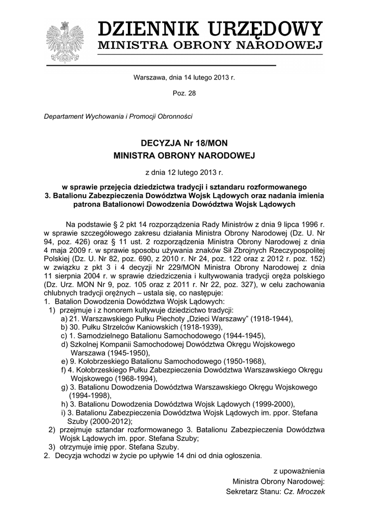 Warszawa, dnia 14 lutego 2013 r. Poz. 28 Departament Wychowania i Promocji Obronności DECYZJA Nr 18/MON MINISTRA OBRONY NARODOWEJ z dnia 12 lutego 2013 r. w sprawie przejęcia dziedzictwa tradycji i sztandaru rozformowanego 3. Batalionu Zabezpieczenia Dowództwa Wojsk Lądowych oraz nadania imienia patrona Batalionowi Dowodzenia Dowództwa Wojsk Lądowych Na podstawie § 2 pkt 14 rozporządzenia Rady Ministrów z dnia 9 lipca 1996 r. w sprawie szczegółowego zakresu działania Ministra Obrony Narodowej (Dz. U. Nr 94, poz. 426) oraz § 11 ust. 2 rozporządzenia Ministra Obrony Narodowej z dnia 4 maja 2009 r. w sprawie sposobu używania znaków Sił Zbrojnych Rzeczypospolitej Polskiej (Dz. U. Nr 82, poz. 690, z 2010 r. Nr 24, poz. 122 oraz z 2012 r. poz. 152) w związku z pkt 3 i 4 decyzji Nr 229/MON Ministra Obrony Narodowej z dnia 11 sierpnia 2004 r. w sprawie dziedziczenia i kultywowania tradycji oręża polskiego (Dz. Urz. MON Nr 9, poz. 105 oraz z 2011 r. Nr 22, poz. 327), w celu zachowania chlubnych tradycji orężnych – ustala się, co następuje: 1. Batalion Dowodzenia Dowództwa Wojsk Lądowych: 1) przejmuje i z honorem kultywuje dziedzictwo tradycji: a) 21. Warszawskiego Pułku Piechoty „Dzieci Warszawy” (1918-1944), b) 30. Pułku Strzelców Kaniowskich (1918-1939), c) 1. Samodzielnego Batalionu Samochodowego (1944-1945), d) Szkolnej Kompanii Samochodowej Dowództwa Okręgu Wojskowego Warszawa (1945-1950), e) 9. Kołobrzeskiego Batalionu Samochodowego (1950-1968), f) 4. Kołobrzeskiego Pułku Zabezpieczenia Dowództwa Warszawskiego Okręgu Wojskowego (1968-1994), g) 3. Batalionu Dowodzenia Dowództwa Warszawskiego Okręgu Wojskowego (1994-1998), h) 3. Batalionu Dowodzenia Dowództwa Wojsk Lądowych (1999-2000), i) 3. Batalionu Zabezpieczenia Dowództwa Wojsk Lądowych im. ppor. Stefana Szuby (2000-2012); 2) przejmuje sztandar rozformowanego 3. Batalionu Zabezpieczenia Dowództwa Wojsk Lądowych im. ppor. Stefana Szuby; 3) otrzymuje imię ppor. Stefana Szuby. 2. Decyzja wchodzi w życie po upływie 14 dni od dnia ogłoszenia. z upoważnienia Ministra Obrony Narodowej: Sekretarz Stanu: Cz. Mroczek