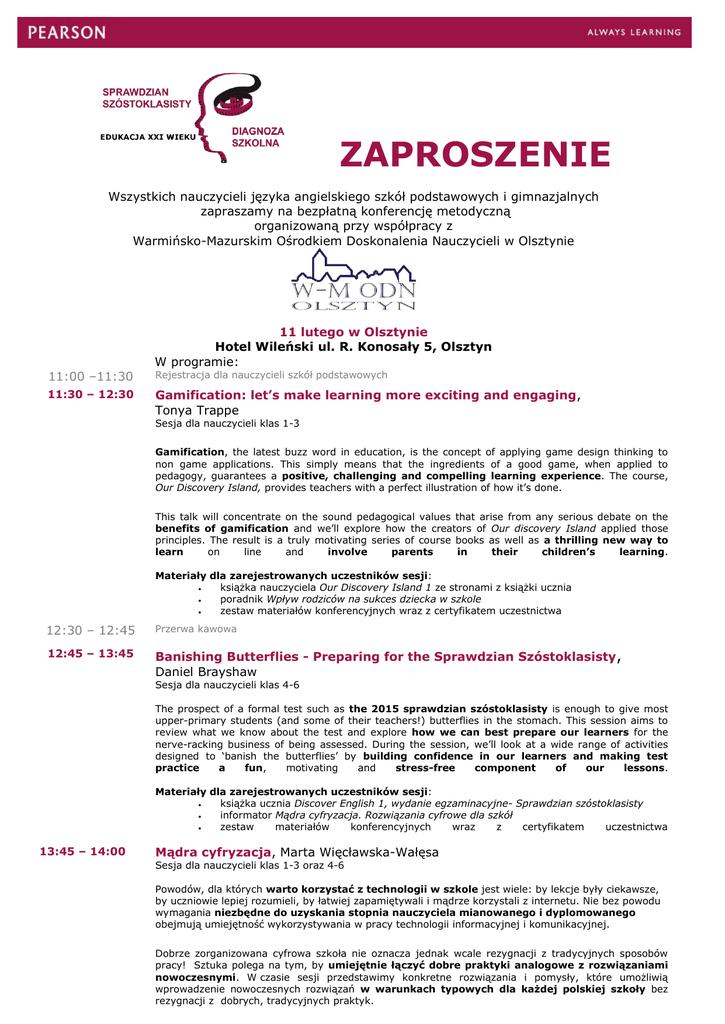 ZAPROSZENIE Wszystkich nauczycieli języka angielskiego szkół podstawowych i gimnazjalnych zapraszamy na bezpłatną konferencję metodyczną organizowaną przy współpracy z Warmińsko-Mazurskim Ośrodkiem Doskonalenia Nauczycieli w Olsztynie 11 lutego w Olsztynie Hotel Wileński ul. R. Konosały 5, Olsztyn W programie: 11:00 –11:30 Rejestracja dla nauczycieli szkół podstawowych 11:30 – 12:30 Gamification: let’s make learning more exciting and engaging, Tonya Trappe Sesja dla nauczycieli klas 1-3 Gamification, the latest buzz word in education, is the concept of applying game design thinking to non game applications. This simply means that the ingredients of a good game, when applied to pedagogy, guarantees a positive, challenging and compelling learning experience. The course, Our Discovery Island, provides teachers with a perfect illustration of how it’s done. This talk will concentrate on the sound pedagogical values that arise from any serious debate on the benefits of gamification and we’ll explore how the creators of Our discovery Island applied those principles. The result is a truly motivating series of course books as well as a thrilling new way to learn on line and involve parents in their children’s learning. Materiały dla zarejestrowanych uczestników sesji: książka nauczyciela Our Discovery Island 1 ze stronami z książki ucznia poradnik Wpływ rodziców na sukces dziecka w szkole zestaw materiałów konferencyjnych wraz z certyfikatem uczestnictwa 12:30 – 12:45 Przerwa kawowa 12:45 – 13:45 Banishing Butterflies - Preparing for the Sprawdzian Szóstoklasisty, Daniel Brayshaw Sesja dla nauczycieli klas 4-6 The prospect of a formal test such as the 2015 sprawdzian szóstoklasisty is enough to give most upper-primary students (and some of their teachers!) butterflies in the stomach. This session aims to review what we know about the test and explore how we can best prepare our learners for the nerve-racking business of being assessed. During the session, we’ll look at a wide range of activities designed to ‘banish the butterflies’ by building confidence in our learners and making test practice a fun, motivating and stress-free component of our lessons. Materiały dla zarejestrowanych uczestników sesji: książka ucznia Discover English 1, wydanie egzaminacyjne- Sprawdzian szóstoklasisty informator Mądra cyfryzacja. Rozwiązania cyfrowe dla szkół zestaw materiałów konferencyjnych wraz z certyfikatem uczestnictwa 13:45 – 14:00 Mądra cyfryzacja, Marta Więcławska-Wałęsa Sesja dla nauczycieli klas 1-3 oraz 4-6 Powodów, dla których warto korzystać z technologii w szkole jest wiele: by lekcje były ciekawsze, by uczniowie lepiej rozumieli, by łatwiej zapamiętywali i mądrze korzystali z internetu. Nie bez powodu wymagania niezbędne do uzyskania stopnia nauczyciela mianowanego i dyplomowanego obejmują umiejętność wykorzystywania w pracy technologii informacyjnej i komunikacyjnej. Dobrze zorganizowana cyfrowa szkoła nie oznacza jednak wcale rezygnacji z tradycyjnych sposobów pracy! Sztuka polega na tym, by umiejętnie łączyć dobre praktyki analogowe z rozwiązaniami nowoczesnymi. W czasie sesji przedstawimy konkretne rozwiązania i pomysły, które umożliwią wprowadzenie nowoczesnych rozwiązań w warunkach typowych dla każdej polskiej szkoły bez rezygnacji z dobrych, tradycyjnych praktyk. 13:45 –14:15 Rejestracja dla nauczycieli szkół gimnazjalnych 14:15 – 15:15 To boldly go where no teacher has gone before…, Grant Kempton Sesja dla nauczycieli szkół gimnazjalnych In recent times, being a teacher may have felt like being Captain Kirk in Star Trek. The concept of 21st century skills may seem alien or threatening, but it doesn’t need to be like this. In fact we ARE Captain Kirks, bringing our students to a brave new world where they are given an opportunity to develop fully through their language learning. But only the best teachers get to become Captain Kirks and in this seminar we’ll look at the challenges that face us on this mission, how we can help our students to develop in, what I’m sure will not be, the final frontier, with the help of Next Move. Materiały dla zarejestrowanych uczestników sesji: książka nauczyciela Next Move 2 zeszyt ćwiczeń Next Move 2 informator Mądra cyfryzacja. Rozwiązania cyfrowe dla szkół zestaw materiałów konferencyjnych wraz z 15:15 – 15:30 certyfikatem uczestnictwa Mądra cyfryzacja, Marta Więcławska-Wałęsa Sesja dla nauczycieli szkół gimnazjalnych Powodów, dla których warto korzystać z technologii w szkole jest wiele: by lekcje były ciekawsze, by uczniowie lepiej rozumieli, by łatwiej zapamiętywali i mądrze korzystali z internetu. Nie bez powodu wymagania niezbędne do uzyskania stopnia nauczyciela mianowanego i dyplomowanego obejmują umiejętność wykorzystywania w pracy technologii informacyjnej i komunikacyjnej. Dobrze zorganizowana cyfrowa szkoła nie oznacza jednak wcale rezygnacji z tradycyjnych sposobów pracy! Sztuka polega na tym, by umiejętnie łączyć dobre praktyki analogowe z rozwiązaniami nowoczesnymi. W czasie sesji przedstawimy konkretne rozwiązania i pomysły, które umożliwią wprowadzenie nowoczesnych rozwiązań w warunkach typowych dla każdej polskiej szkoły bez rezygnacji z dobrych, tradycyjnych praktyk. Zwracamy się z uprzejmą prośbą do Dyrektorów szkół o umożliwienie nauczycielom uczestnictwa w organizowanej przez wydawnictwo Pearson bezpłatnej konferencji metodycznej. Rejestracja na www.pearson.pl/angielski/konferencje