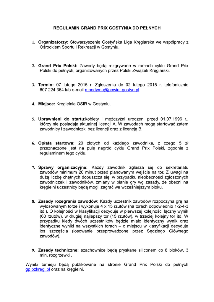 REGULAMIN GRAND PRIX GOSTYNIA DO PEŁNYCH 1. Organizatorzy: Stowarzyszenie Gostyńska Liga Kręglarska we współpracy z Ośrodkiem Sportu i Rekreacji w Gostyniu. 2. Grand Prix Polski: Zawody będą rozgrywane w ramach cyklu Grand Prix Polski do pełnych, organizowanych przez Polski Związek Kręglarski. 3. Termin: 07 lutego 2015 r. Zgłoszenia do 02 lutego 2015 r. telefonicznie 607 224 364 lub e-mail [email protected] . 4. Miejsce: Kregielnia OSiR w Gostyniu. 5. Uprawnieni do startu:kobiety i mężczyźni urodzeni przed 01.07.1996 r., którzy nie posiadają aktualnej licencji A. W zawodach mogą startować zatem zawodnicy i zawodniczki bez licencji oraz z licencją B. 6. Opłata startowa: 20 złotych od kazdego zawodnika, z czego 5 zł przeznaczone jest na pule nagród cyklu Grand Prix Polski, zgodnie z regulaminem tego cyklu. 7. Sprawy organizacyjne: Każdy zawodnik zgłasza się do sekretariatu zawodów minimum 20 minut przed planowanym wejście na tor. Z uwagi na dużą liczbę chętnych dopuszcza się, w przypadku nieobecności zgłoszonych zawodniczek i zawodników, zmiany w planie gry wg zasady, że obecni na kręgielni uczestnicy będą mogli zagrać we wcześniejszym bloku. 8. Zasady rozegrania zawodów: Każdy uczestnik zawodów rozpoczyna grę na wylosowanym torze i wykonuje 4 x 15 rzutów (na torach odpowiednio 1-2-4-3 itd.). O kolejności w klasyfikacji decyduje w pierwszej kolejności łączny wynik (60 rzutów), w drugiej najlepszy tor (15 rzutów), w trzeciej kolejny tor itd. W przypadku kiedy dwóch uczestników będzie miało identyczny wynik oraz identyczne wyniki na wszystkich torach – o miejscu w klasyfikacji decyduje los szczęścia (losowanie przeprowadzone przez Sędziego Głównego zawodów). 9. Zasady techniczne: szachownice bedą pryskane siliconem co 8 bloków, 3 min. rozgrzewki . Wyniki turnieju bedą publikowane na stronie Grand Prix Polski do pełnych gp.pzkregl.pl oraz na kregielni. 9. Sedzia Główny: Roman Loman - sedzia klasy P.