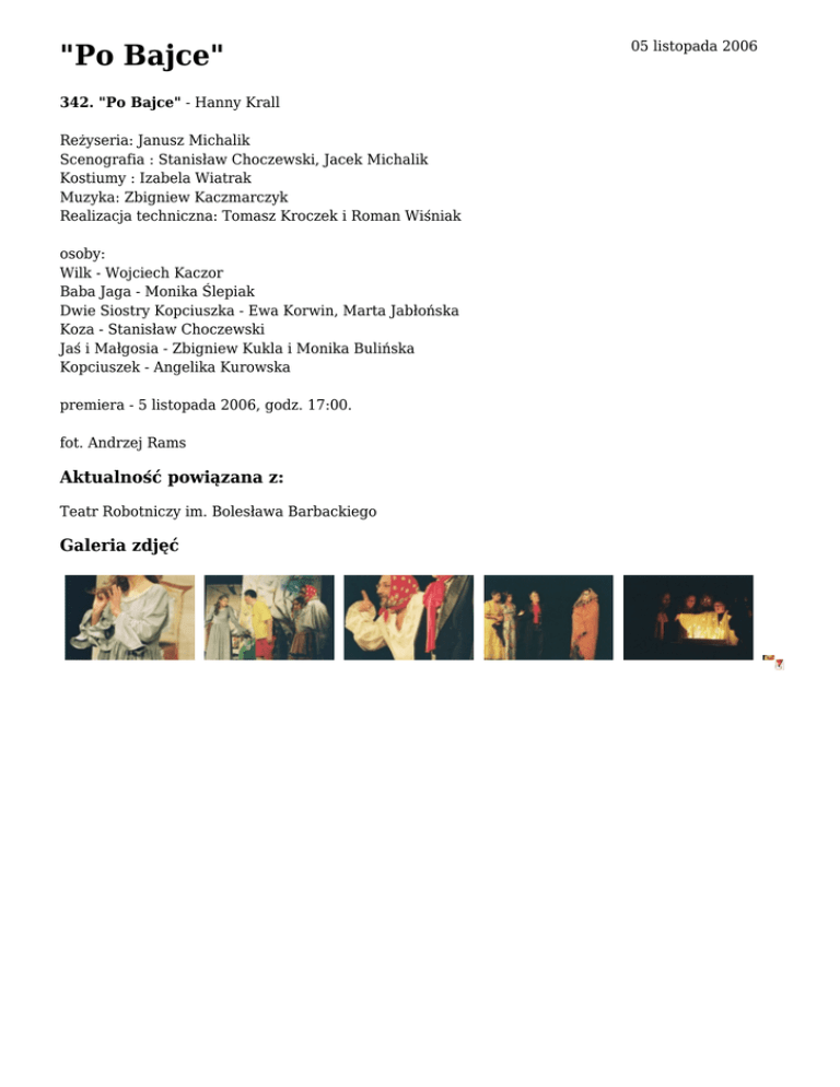 "Po Bajce" 342. "Po Bajce" - Hanny Krall Reżyseria: Janusz Michalik Scenografia : Stanisław Choczewski, Jacek Michalik Kostiumy : Izabela Wiatrak Muzyka: Zbigniew Kaczmarczyk Realizacja techniczna: Tomasz Kroczek i Roman Wiśniak osoby: Wilk - Wojciech Kaczor Baba Jaga - Monika Ślepiak Dwie Siostry Kopciuszka - Ewa Korwin, Marta Jabłońska Koza - Stanisław Choczewski Jaś i Małgosia - Zbigniew Kukla i Monika Bulińska Kopciuszek - Angelika Kurowska premiera - 5 listopada 2006, godz. 17:00. fot. Andrzej Rams Aktualność powiązana z: Teatr Robotniczy im. Bolesława Barbackiego Galeria zdjęć 05 listopada 2006