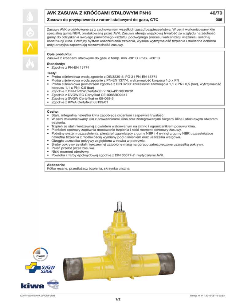 AVK ZASUWA Z KRÓĆCAMI STALOWYM PN16 Zasuwa do przyspawania z rurami stalowymi do gazu, CTC 46/70 005 Zasuwy AVK projektowane są z zachowaniem wszelkich zasad bezpieczeństwa. W pełni wulkanizowany klin specjalną gumą NBR, produkowaną przez AVK. Zasuwy oferują wyjątkową trwałość ze względu na zdolność gumy do odzyskania swojego pierwotnego kształtu, podwójnego procesu wulkanizacji wiązania i solidnej konstrukcji klina. Potrójny system uszczelnienia trzpienia, wysoka wytrzymałość trzpienia i dokładna ochrona antykorozyjna zapewniają niezawodność zasuwy. Opis produktu: Zasuwa z króćcami stalowymi do gazu o temp. min -20° C i max. +60° C Standardy: • Zgodnie z PN-EN 13774 Testy: • Próba ciśnieniowa wodą zgodnie z DIN3230-5, PG 3 i PN-EN 13774 • Próba ciśnieniowa wodą zgodnie z PN-EN 13774: wytrzymałość korpusu 1,5 x PN • Próba ciśnieniowa powietrzem zgodnie z DIN 3230: szczelność zamknięcia 1,1 x PN i 0,5 (bar), wytrzymałość korpusu 1,1 x PN i 0,5 (bar) • Zgodnie z DIN-DVGW Certyfikat nr NG-4313BO0281 • Zgodnie z DVGW EC Certyfikat CE-0085BO0317 • Zgodnie z SVGW Certyfikat nr 08-068-5 • Zgodnie z KIWA Certyfikat 65139/01 Cechy: • Stała, integralna nakrętka klina zapobiega drganiom i zapewnia trwałość. • W pełni wulkanizowany klin z prowadnicami klina oraz zintegrowanymi ślizgami klina i stożkowym otworem trzpienia. • Trzpień ze stali nierdzewnej z gwintem walcowanym na zimno i ogranicznikiem posuwu klina. • Pierścień oporowy zapewnia mocowanie trzpienia i niski moment obrotowy zasuwy. • Potrójny system uszczelnienia: pierścień zgarniający z gumy NBR i 4 o-ringi z gumy NBR uszczelniające nakrętkę trzpienia z możliwością wymiany pod ciśnieniem oraz uszczelka wargowa. • Okrągła uszczelka pokrywy zagłębiona w rowku w pokrywie. • Śruby pokrywy ze stali nierdzewnej zatopione masą na gorąco zabezpieczone uszczelką pokrywy. • Pełen przelot przez zasuwę. • Niski moment obrotowy. • Powłoka z farby epoksydowej zgodnie z DIN 30677-2 i wytycznymi AVK. Akcesoria: Kółko ręczne, przedłużacz trzpienia, skrzynka uliczna COPYRIGHT©AVK GROUP 2016 Wersja nr 14 - 2016-05-16 09:53 1/2 AVK ZASUWA Z KRÓĆCAMI STALOWYM PN16 46/70 Zasuwa do przyspawania z rurami stalowymi do gazu, CTC 005 1 F1 F 2 F2 3 4 5 6 7 8 H 9 H3 10 11 12 13 D S L Wykaz elementów budowy: 1. Trzpień Stal z min. 13% zawartości chromu 2. Pierścień zgarniający Guma NBR 3. Tuleja oporowa trzpienia Mosiądz odporny na odcynkowanie 4. O-ring Guma NBR Mosiądz odporny na odcynkowanie Stal nierdzewna 1.4301, zatopione masą na gorąco 5. Pokrywa Żeliwo sferoidalne GJS-400-15 (GGG-40) 6. Pierścień oporowy trzpienia 7. Uszczelka wargowa Guma NBR 8. Śruby pokrywy 9. Uszczelka pokrywy Guma NBR 10. Nakrętka klina Mosiądz odporny na odcynkowanie 11. Klin Żeliwo sferoidalne z gumą NBR 12. Korpus Staliwo GP 240 GH+N 13. Króciec stalowy Stal P 235GH Komponenty mogą być zastąpione materiałami takiej samej bądź wyższej klasy, bez wcześniejszego powiadomienia. Nr katalogowy i wymiary: Nr katalogowy DN mm D mm Klasa ciśnienia H mm H3 mm L mm F mm F1 mm F2 mm S mm Waga kg 46-050-70-01237 46-080-70-01237 46-100-70-01237 46-150-70-01237 46-200-70-01237 46-250-70-01237 46-300-70-01237 46-300-70-01337 50 80 100 150 200 250 300 300 60 89 114 168 219 273 324 324 PN16 PN16 PN16 PN16 PN16 PN16 PN16 PN16 241 297 334 448 562 664 740 740 279 351 398 538 680 811 911 911 570 550 520 530 570 590 620 620 14 17 19 19 24 27 27 27 16 20 22 22 28 31 31 31 29 34 38 38 42 47 47 47 3 3 4 5 6 6 7 7 13 15 26 40 72 93 130 130 Konstrukcja, materiały oraz warunki wykonania mogą ulec zmianie bez powiadomienia z powodu ciągłego rozwoju naszych produktów. Wersja nr 14 - 2016-05-16 09:53 2/2