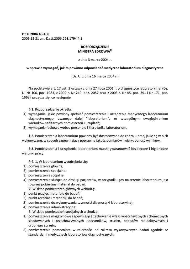Dz.U.2004.43.408 2009.12.31 zm. Dz.U.2009.223.1794 § 1 ROZPORZĄDZENIE MINISTRA ZDROWIA1) z dnia 3 marca 2004 r. w sprawie wymagań, jakim powinno odpowiadać medyczne laboratorium diagnostyczne (Dz. U. z dnia 16 marca 2004 r.) Na podstawie art. 17 ust. 3 ustawy z dnia 27 lipca 2001 r. o diagnostyce laboratoryjnej (Dz. U. Nr 100, poz. 1083, z 2002 r. Nr 240, poz. 2052 oraz z 2003 r. Nr 45, poz. 391 i Nr 171, poz. 1663) zarządza się, co następuje: § 1. Rozporządzenie określa: 1) wymagania, jakie powinny spełniać pomieszczenia i urządzenia medycznego laboratorium diagnostycznego, zwanego dalej "laboratorium", ze szczególnym uwzględnieniem warunków sanitarnych pomieszczeń i urządzeń; 2) wymagania fachowe wobec personelu i kierownika laboratorium. § 2. Pomieszczenia laboratorium powinny być dostosowane do rodzaju prac, jakie są w nich wykonywane, w sposób zapewniający poprawną jakość pomiarów i wiarygodność wyników. § 3. Pomieszczenia i urządzenia laboratorium muszą gwarantować bezpieczne i higieniczne warunki pracy. 1) 2) 3) 4) 1) 2) 3) 4) 1) 2) § 4. 1. W laboratorium wyodrębnia się: pomieszczenia główne; pomieszczenia specjalne; pomieszczenia socjalne; pomieszczenia służące do obsługi pacjentów, w przypadku gdy na terenie laboratorium jest również pobierany materiał do badań. 2. W skład pomieszczeń głównych wchodzą: punkt przyjęć materiału do badań; punkt rozdziału materiału do badań; pomieszczenia do wykonywania czynności diagnostyki laboratoryjnej; pomieszczenia administracyjne. 3. W skład pomieszczeń specjalnych wchodzą: pomieszczenia magazynowe zapewniające zachowanie właściwości fizycznych i chemicznych składowanych i przechowywanych odczynników, trucizn, odpadów radioaktywnych i drobnego sprzętu; pomieszczenia pomocnicze w zależności od zakresu wykonywanych badań zgodnie ze standardami medycznych laboratoriów diagnostycznych. 4. W skład pomieszczeń socjalnych wchodzą w szczególności pokoje socjalne, urządzenia sanitarnohigieniczne oraz szatnie dla personelu. 5. W skład pomieszczeń służących do obsługi pacjentów wchodzą: 1) pokój pobrań oddzielony od pomieszczeń laboratoryjnych; 2) poczekalnia i urządzenia sanitarnohigieniczne dla pacjentów. 6. Pomieszczenia określone w ust. 1-5 znakuje się w sposób umożliwiający ich identyfikację oraz zgodnie z wymogami dotyczącymi bezpieczeństwa. 7. W pomieszczeniach do wykonywania czynności diagnostyki laboratoryjnej bieżąco kontroluje się warunki mogące mieć wpływ na wyniki badań. § 5. 1. Laboratorium posiada wyposażenie właściwe dla zakresu prowadzonej działalności, w tym: 1) wyposażenie podstawowe; 2) wyposażenie pomiarowo-badawcze; 3) wyposażenie umożliwiające pobieranie materiału; 4) wyposażenie zapewniające bezpieczeństwo i higienę pracy; 5) urządzenia telekomunikacyjne i systemy informatyczne. 2. Laboratorium wyposaża się w aparaturę pomiarowo-badawczą dostosowaną do rodzaju wykonywanych badań, umożliwiającą stosowanie metod badawczych zgodnych z aktualnym stanem wiedzy. 3. Aparaturę pomiarowo-badawczą poddaje się badaniom i kontroli z częstotliwością wynikającą z rodzaju aparatury i wskazań wytwórców. 4. Laboratorium prowadzi dokumentację dotyczącą aparatury pomiarowo-badawczej oraz sprzętu, stanowiących wyposażenie laboratorium, zawierającą: 1) karty gwarancyjne; 2) specyfikacje techniczne; 3) datę rozpoczęcia eksploatacji; 4) wykaz pracowników przeszkolonych i upoważnionych do obsługi oraz osób bezpośrednio odpowiedzialnych za daną aparaturę lub sprzęt; 5) instrukcje użytkowania; 6) zapisy kalibracji; 7) instrukcje postępowania przy działaniach naprawczych i korygujących; 8) oświadczenie o dopuszczeniu do użytkowania po usunięciu awarii; 9) dane o bieżącej obsłudze i kontroli; 10) dane o konserwacji bieżącej i okresowej prowadzonej zgodnie ze wskazaniami wytwórców, przez użytkowników lub podmioty autoryzowane przez dystrybutorów lub wytwórców. § 6. Kierownikiem laboratorium jest osoba, która posiada tytuł specjalisty zgodny z profilem laboratorium. § 7. 1. W laboratorium zatrudnia się osoby, które posiadają kwalifikacje zawodowe odpowiadające zakresowi zadań na danym stanowisku pracy. 2. Wykaz kwalifikacji niezbędnych do wykonywania zadań zawodowych na poszczególnych stanowiskach pracy w laboratorium określa załącznik do rozporządzenia. § 8. Osoby zatrudnione na stanowisku kierownika laboratorium nie krócej niż rok przed dniem wejścia w życie rozporządzenia, które posiadają I stopień specjalizacji w dziedzinie mającej zastosowanie w diagnostyce laboratoryjnej lub nie posiadają specjalizacji, mogą być zatrudnione na tym stanowisku, jednak nie dłużej niż do dnia 31 grudnia 2012 r. § 9. Rozporządzenie wchodzi w życie po upływie 14 dni od dnia ogłoszenia. ________ 1) Minister Zdrowia kieruje działem administracji rządowej - zdrowie, na podstawie § 1 ust. 2 rozporządzenia Prezesa Rady Ministrów z dnia 28 czerwca 2002 r. w sprawie szczegółowego zakresu działania Ministra Zdrowia (Dz. U. Nr 93, poz. 833 oraz z 2003 r. Nr 199, poz. 1941). ZAŁĄCZNIK WYKAZ KWALIFIKACJI NIEZBĘDNYCH DO WYKONYWANIA ZADAŃ ZAWODOWYCH NA POSZCZEGÓLNYCH STANOWISKACH PRACY W LABORATORIUM Lp. Stanowisko Wymagane kwalifikacje zawodowe Liczba lat pracy w zawodzie 1 2 3 4 1 2 Starszy asystent diagnostyki laboratoryjnej Asystent diagnostyki laboratoryjnej Tytuł diagnosty laboratoryjnego oraz tytuł specjalisty w dziedzinach przydatnych do wykonywania czynności diagnostyki laboratoryjnej 7 Osoba posiadająca prawo wykonywania zawodu lekarza oraz tytuł specjalisty w dziedzinach przydatnych do wykonywania diagnostyki laboratoryjnej 7 Tytuł diagnosty laboratoryjnego oraz specjalizacja I stopnia w dziedzinach przydatnych do wykonywania czynności diagnostyki laboratoryjnej 5 Osoba posiadająca prawo wykonywania zawodu lekarza oraz specjalizacja I sto