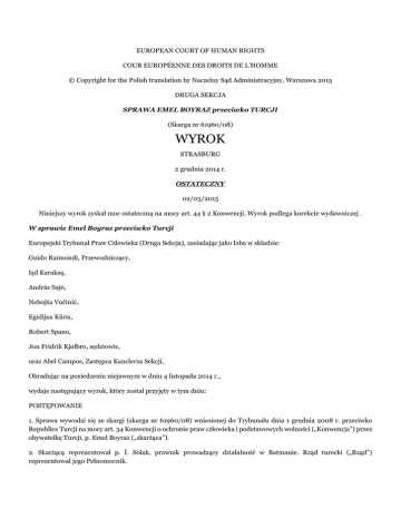 EUROPEAN COURT OF HUMAN RIGHTS COUR EUROPÉENNE DES DROITS DE L’HOMME © Copyright for the Polish translation by Naczelny Sąd Administracyjny, Warszawa 2015 DRUGA SEKCJA SPRAWA EMEL BOYRAZ przeciwko TURCJI (Skarga nr 61960/08) WYROK STRASBURG 2 grudnia 2014 r. OSTATECZNY 02/03/2015 Niniejszy wyrok zyskał moc ostateczną na mocy art. 44 § 2 Konwencji. Wyrok podlega korekcie wydawniczej . W sprawie Emel Boyraz przeciwko Turcji Europejski Trybunał Praw Człowieka (Druga Sekcja), zasiadając jako Izba w składzie: Guido Raimondi, Przewodniczący, Işıl Karakaş, András Sajó, Nebojša Vučinić, Egidijus Kūris, Robert Spano, Jon Fridrik Kjølbro, sędziowie, oraz Abel Campos, Zastępca Kanclerza Sekcji, Obradując na posiedzeniu niejawnym w dniu 4 listopada 2014 r., wydaje następujący wyrok, który został przyjęty w tym dniu: POSTĘPOWANIE 1. Sprawa wywodzi się ze skargi (skarga nr 61960/08) wniesionej do Trybunału dnia 1 grudnia 2008 r. przeciwko Republice Turcji na mocy art. 34 Konwencji o ochronie praw człowieka i podstawowych wolności („Konwencja”) przez obywatelkę Turcji, p. Emel Boyraz („skarżąca”). 2. Skarżącą reprezentował p. İ. Solak, prawnik prowadzący działalność w Batmanie. Rząd turecki („Rząd”) reprezentował jego Pełnomocnik. 3. W dniu 1 marca 2010 r. skarga została zakomunikowana Rządowi. FAKTY I. OKOLICZNOŚCI SPRAWY 4. Skarżąca urodziła się w 1975 r. i mieszka w Elazığu. 5. 19 października 1999 r. skarżąca podeszła do egzaminu na funkcjonariusza publicznego. Zdała egzamin i w nieustalonym terminie została poinformowana przez Państwowy Departament Personalny przy Kancelarii Premiera, że została mianowana na stanowisko oficera ochrony w batmańskim oddziale TEDAŞ, państwowej spółki energetycznej, które było jej pierwszym wyborem z pięciu dokonanym w ramach procedury egzaminacyjnej. 6. 5 lipca 2000 r. dział kadr w oddziale TEDAŞ w Batmanie poinformował skarżącą, że nie zostanie mianowana na to stanowisko, ponieważ nie spełnia warunku „bycia mężczyzną” i „odbytej służby wojskowej”. 7. W piśmie z dnia 9 sierpnia 2000 r. adresowanym do Ministra Energetyki i Zasobów Naturalnych dział kadr TEDAŞ poprosił Ministerstwo o przedstawienie listy nowych osób do zatrudnienia zamiast pewnej liczby osób, w tym skarżącej, które nie mogą zostać przyjęte z różnych powodów. W odniesieniu do skarżącej i trzech innych osób, B.U., R.B. oraz A.O.C., dział kadr TEDAŞ poinformował Ministerstwo, że ze względu na fakt, że są one kobietami, nie mogą zostać zatrudnione na stanowisku oficerów ochrony. W piśmie stwierdzono, że zadaniem oficerów ochrony jest ochrona baz, rozdzielni i stacji transformatorowych na obszarach wiejskich z dala od centrów miast przed atakami oraz w razie pożarów i działań sabotażowych. W razie ataku są oni zobowiązani do pracy w dzień i w nocy oraz używania broni, w tym długiej, oraz siły fizycznej. Z tego powodu uważa się, że kobiety nie są odpowiednie na wspomniane stanowisko. 8. 18 września 2000 r. skarżąca wniosła pozew przeciwko dyrekcji generalnej TEDAŞ do Sądu Administracyjnego w Ankarze, prosząc o uchylenie decyzji oddziału TEDAŞ w Batmanie wraz ze wszystkimi konsekwencjami finansowymi. W swoim zeznaniu skarżąca zaznaczyła, że płeć męska nie była warunkiem zatrudnienia i że spełniała wszystkie wymagania dla tego stanowiska. Skarżąca zauważyła również, że po przedmiotowej odmowie została pozbawiona szansy zatrudnienia na jednym z pozostałych wskazanych przez nią czterech stanowisk oraz że nie mogła podejść ponownie do egzaminu w 2000 r., ponieważ zdała go w 1999 r. 9. W nieokreślonej dacie dyrekcja generalna TEDAŞ przedstawiła sądowi administracyjnemu argument, że jako jeden z warunków nominacji na omawiane stanowisko Państwowy Departament Personalny wskazał „odbytą służbę wojskową”, a zatem na stanowisko to mogą być mianowani tylko mężczyźni. Z tego powodu skarżąca jako kobieta nie może zostać zatrudniona jako oficer ochrony. 10. 27 lutego 2001 r. Sąd Administracyjny w Ankarze uchylił decyzję oddziału TEDAŞ w Batmanie. Sąd stwierdził, że należy rozumieć, że warunek „odbytej służby wojskowej” odnosi się tylko do mężczyzn i że zatrudnienie kobiet na stanowisku oficera ochrony w TEDAŞ nie podlegało żadnym ograniczeniom. Sąd zauważył również, że inna kobieta, Y.P., która także wniosła sprawę przeciwko TEDAŞ z tego samego powodu, co skarżąca, została mianowana na stanowisko oficera ochrony po tym, jak wniosła sprawę. 11. Po wyroku z 27 lutego 2001 r. oddział TEDAŞ w Batmanie zaproponował skarżącej podpisanie umowy. 11 lipca 2001 r. skarżąca rozpoczęła pełnienie obowiązków.1 marca 2002 r. została przeniesiona do oddziału TEDAŞ w Elazığu, ponieważ tam mieszkał i pracował jej mąż. 12. 8 maja 2001 r. TEDAŞ odwołało się od wyroku z dnia 27 lutego 2001 r., wnosząc do Naczelnego Sądu Administracyjnego o nakazanie wstrzymania wykonania wyroku Sądu Administracyjnego w Ankarze, a następnie o jego uchylenie. Przedstawiciel TEDAŞ przedstawił m.in. argument, że ogłoszenie o wakacie oficera ochrony w oddziale w Batmanie przewidywało warunek „odbytej służby wojskowej”, a nie „w przypadku mężczyzn – odbyta służba wojskowa”, inaczej niż w przypadku wakatu w oddziale TEDAŞ w Gaziantepie, gdzie najpierw odrzucono kandydaturę Y.P. Według prawników wyrażenie to informowało, że stanowisko jest zarezerwowane wyłącznie dla kandydatów płci męskiej i dlatego status skarżącej jest inny niż Y.P. 13. 27 czerwca 2001 r. Naczelny Sąd Administracyjny oddalił wniosek o wstrzymanie wykonania wyroku. 14. 31 marca 2003 r. XII Wydział Naczelnego Sądu Administracyjnego uchylił wyrok Sądu Administracyjnego w Ankarze, uzasadniając, że warunek dotyczący służby wojskowej wskazywał, że przedmiotowe stanowis