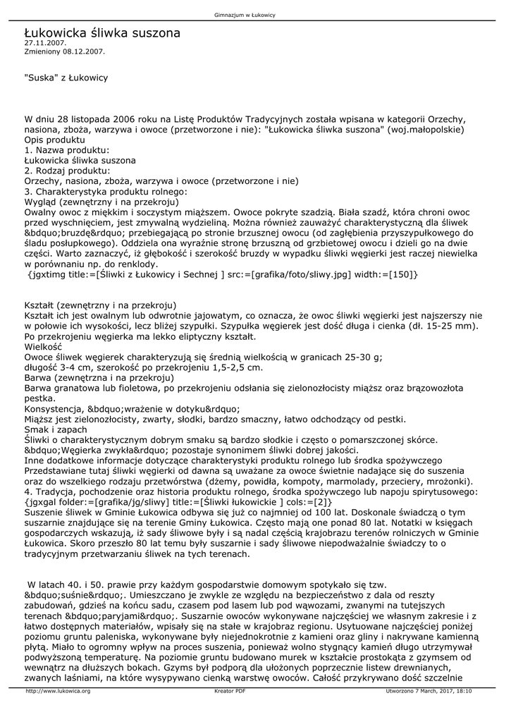 nasiona, zboża, warzywa i owoce (przetworzone i nie): "Łukowicka śliwka suszona" (woj.małopolskie)