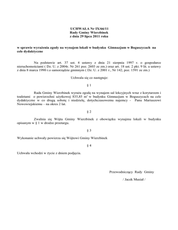 UCHWAŁA Nr IX/66/11 Rady Gminy Wierzbinek z dnia 29 lipca 2011 roku w sprawie wyrażenia zgody na wynajem lokali w budynku Gimnazjum w Boguszycach na cele dydaktyczne Na podstawie art. 37 ust. 4 ustawy z dnia 21 sierpnia 1997 r. o gospodarce nieruchomościami ( Dz. U. z 2004r. Nr 261 poz. 2603 ze zm.) oraz art. 18 ust. 2 pkt. 9 lit. a ustawy z dnia 8 marca 1990 r.o samorządzie gminnym ( Dz. U. z 2001 r., Nr 142, poz. 1591 ze zm.) Uchwala się co następuje: §1 Rada Gminy Wierzbinek wyraża zgodę na wynajem sal lekcyjnych wraz z korytarzem i toaletami o powierzchni użytkowej 835,85 m2 w budynku Gimnazjum w Boguszycach na cele dydaktyczne w co drugą sobotę i niedzielę, dotychczasowemu najemcy - Panu Mariuszowi Nowowiejskiemu – na okres 2 lat. §2 Zwalnia się Wójta Gminy Wierzbinek z obowiązku wynajmu lokali w budynku opisanym w § 1 w drodze przetargu. §3 Wykonanie uchwały powierza się Wójtowi Gminy Wierzbinek §4 Uchwała wchodzi w życie z dniem podjęcia. Przewodniczący Rady Gminy / Jacek Musiał / Uzasadnienie do UCHWAŁY Nr IX/66/11 Rady Gminy Wierzbinek z dnia 29 lipca 2011 roku w sprawie wyrażenia zgody na wynajem lokali w budynku Gimnazjum w Boguszycach na cele dydaktyczne Rada Gminy Wierzbinek wyraziła zgodę na wynajem sal lekcyjnych wraz z korytarzem i toaletami o powierzchni użytkowej 835,85 m2 w budynku Gimnazjum w Boguszycach na cele dydaktyczne w co drugą sobotę i niedzielę, dotychczasowemu najemcy - Panu Mariuszowi Nowowiejskiemu – na okres 2 lat, który wynajmował w/w lokale w okresie od 15.09.2008 do 31.08.2011r. Przewodniczący Rady Gminy / Jacek Musiał /